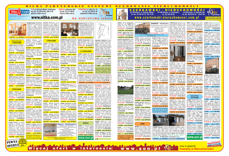 230 000 zł WYŁĄCZNOŚĆ NITKA&CZAPLA MIESZKANIA Ładne GLIWICE Centrum . mieszkanie o pow. 35,7m2 , z balkonem położone na 3-piętrze. C.o. miejskie. Tel. 505-059-966 N-CZERKAWSKI 2A1559 cena: 110 000 zł 3 POKOJOWE 3 POKOJOWE 1 POKOJOWE GLIWICE. Komfortowe mieszkanie 1 POKOJOWE 2-poz o pow. 72m2 , w nowo GLIWICE Centrum. Pow. 26m2, 1p. oddanym bloku na 2p. C.o. piec IIw bloku. Stan tech. bdb. Pok. z 21C824 cena: 145 000 zł funkc. W cenie pełne wyposaż.Tel. aneksem kuchennym. Kuchnia N-CZERKAWSKI umebl. C.o. miejskie Tel. Kom. GLIWICE Łabędy. Pow. 52m2, 1p. w 508-393-468 N-CZERKAWSKI n i s k i m b l o k u . R o z k ł a d o w e . 605-622-344 21C832 cena: 390 000 zł 21A1414 cena: 88 000 zł Słoneczne. Budynek ocieplony i GLIWICE Centrum. Pow. 46m2, na monitorowany. Nowe inst.: elektr. GLIWICE Trynek. Pow. 36,8m2, 2p. wodna i kanaliz. Tel. 504-094-021 1p. w bloku. Loggia. Kuchnia umebl. Idealne dla studentów. Tel. kom. Balkon. C.o. gaz. - piec II-funkc. N-CZERKAWSKI 500-124-686 N-CZERKAWSKI Meble w kuchni oraz szafa w pokoju 21C688 cena: 185 000 zł w c e n i e . Te l . 6 0 4 - 5 7 2 - 4 2 1 21H57 najem: 1 400 zł N-CZERKAWSKI GLIWICE os. Gw. Lud. Słoneczne, GLIWICE Pl. Piastów. Rozkładowe 21C789 cena: 135 000 zł komfortowe o pow. 52 m2, 9p. Po 3-pokojowe pow. ok. 70 m2, p.2. Po generalnym remoncie. Tel. kom. P Y S K O W I C E u l . K o l e j o w a . 504-094-021 N-CZERKAWSKI remoncie. C.o. gaz. tel. 609 158 084 [email protected] Kawalerka o pow. 41m2, na wysokim 21C682 cena: 225 000 zł WYŁĄCZNOŚĆ NITKA&CZAPLA parterze do kapitalnego remontu, brak ogrzewania. Niski czynsz. Ciche, GLIWICE os.Literatów. Pow. 2A1609 cena: 240 000 zł spokojne otoczenie. Tel. 508 750 255 51m2, 1p. w niskim bloku. Część GLIWICE Centrum. Pow. 97m2, p y s k o w i c e @ n i t k a . c o m . p l wyposaż. i umebl. w cenie. Tel. 2p. C.o. gaz. - piec II-funkc. 2balkony. WYŁĄCZNOŚĆ NITKA&CZAPLA 506-223-415 N-CZERKAWSKI Mieszkanie może być przeznaczone 2B194 cena: 80 000 zł 21C821 cena: 176 000 zł na dział.biur. Bardzo niski czynsz !! ZABRZE Mikulczyce. 26,50m2, 2p. GLIWICE Zimorodka. Mieszkanie 2 K o n t a k t : Te l . 5 1 0 - 2 6 7 - 6 7 5 Nowa instal. wodno-kanaliz., ściany pokojowe o pow. 46,20m2. Po WYŁĄCZNOŚĆ N-CZERKAWSKI przygotowane do malowania kapitalnym remoncie. P. 4/4. W cenie 21C712 cena: 490 000 zł (położone płyty kart.- gips.) C.o. i c.w. meble kuchenne oraz zabudowane z s i e c i . Te l . 5 1 3 - 1 6 0 - 9 1 8 s z a f y . Te l : 6 0 2 2 7 2 3 7 9 GLIWICE Centrum. Pow. 68m2, WYŁĄCZNOŚĆ N-CZERKAWSKI m m a r c z a k @ n i t k a . c o m . p l 3piętro. Rozkładowe. Luksusowe. Te l . k o m . 5 1 2 - 0 3 6 - 5 9 3 21D66 cena: 60 000 zł WYŁĄCZNOŚĆ NITKA&CZAPLA WYŁĄCZNOŚĆ N-CZERKAWSKI 2A1475 2 POKOJOWE 2 POKOJOWE GLIWICE Centrum. Luksusowy apartament o pow. 68m2 na 2p. (Strona sprzedająca ponosi koszty notarialne) Tel. 512-036-593 WYŁĄCZNOŚĆ N-CZERKAWSKI 21C727 cena: 365 000 zł GLIWICE Centrum. Pow. 61m2, w kamienicy, po remoncie. C.o. miejskie. Cicha, spokojna uliczka. Blisko szkoła, przedszkole, sklepy. POLECAM!! Tel. 502-678-341 WYŁĄCZNOŚĆ N-CZERKAWSKI 21C612 cena: 258 000 zł GLIWICE Centrum. Pow. 60m2, 1p. w kamienicy. Po kapitalnym remoncie, w pełni wyposażone. M-ce parking. w podwórzu. Kontakt: Tel. 605-622-344 N-CZERKAWSKI 21A1415 najem: 2 000 zł GLIWICE Sośnica. Do wynajmu mieszkanie 2 pokojowe o pow. 40,49 m2. W pełni umeblowane i wyposażone w sprzęt AGD. Położone w nowym budynku wielorodzinnym. Teren zamknięty brama wjazdowa na pilota. Istnieje możliwość parkowania samochodu. K o n t a k t : Te l . 5 0 1 4 3 2 0 2 9 WYŁĄCZNOŚĆ NITKA&CZAPLA 2A1580 najem: 1 500 zł cena: 199 000 zł GLIWICE Pt.Dzielnica. Mieszkanie willowe o pow. 62m2 z ogródkiem ok. 200m2. C.o. gaz. - piec II-funkc. Wspólnota. Tel. 504-094-021 N-CZERKAWSKI 21A1316 cena: 267 000 zł KNURÓW. Pow. 46,50m2 3p. Do odświeżenia, duży balkon, bardzo słoneczne. Cena do negocjacji !! K o n t a k t : Te l . 0 6 0 7 - 0 3 0 - 9 9 3 WYŁĄCZNOŚĆ N-CZERKAWSKI 21C713 cena: 160 000 zł PYSKOWICE Przy Rynku, apartament, I piętro, pow. 51m2, duży salon z aneksem kuchennym, sypialnia, łazienka, przedpokój, co i c.w. z pieca gazowego. Niski czynsz. Piwnica i strych. Częściowo umeblowane. Tel. 0601 468 509; [email protected] WYŁĄCZNOŚĆ NITKA&CZAPLA 2A1588 cena: 155 000 zł ZABRZE ul. Kowalska. Mieszkanie 2 pok., pow. ok. 35m2, piętro 6/10. Do remontu. Pokoje przejściowe. KUPUJĄCY NIE PŁACI PROWIZJI. K o n t a k t : Te l . 5 0 3 3 0 3 1 8 6 WYŁĄCZNOŚĆ NITKA&CZAPLA 2C416 cena: 88 000 zł Poszukujemy mieszkania przy ul. Czwartaków oraz mieszkania z ogrodem Tel. 0/604-572-421 CzN 2A1580 najem: 1 500 zł GLIWICE Pszczyńska. Rozkładowe mieszkanie, w pełni umeblowane i wyposażone, świeżo po remoncie. Pow. 52m2. Istnieje możliwość zakupienia nowych mebli. W pokojach na podłogach panele, w przedpokoju, kuchni i łazience glazura. Wysokość czynszu do negocjacji! Tel. 608 400 369 WYŁĄCZNOŚĆ NITKA&CZAPLA 2A1405 najem: 1 600 zł GLIWICE Łabędy. Pow. 51m2, 1p.Rozkładowe. Do odświeżenia. C.o. - piec II-funkc. gaz. Możliwość zakupu garażu z małym ogródkiem w cenie 8.000 zł. Tel. 607-030-993 N-CZERKAWSKI 21C786 cena: 165 000 zł GLIWICE Kozielska. Mieszkanie 3 pok. o pow. 68m2, słoneczne i przestronne. Balkon, widna kuchnia. P. 9/11. Częściowo po remoncie. Okna drewniane - do wymiany. Łazienka po remoncie - nowa armatura łazienkowa, kabina prysznicowa. Ogrzewanie i ciepła woda z sieci. tel. 501 432 029 NITKA&CZAPLA 2A1274 cena: 215 000 zł 21A1308 cena: 330 000 zł GLIWICE Sośnica. NIŻSZACENA!! Pow. 60m2, 4p. Rozkładowe. C.o. i c.w. - sieć. Tel. 607-030-993 N-CZERKAWSKI GLIWICE Sokoła. Ładne mieszkanko 3 pokojowe o pow. 52m2, V piętr w budynku 10piętrowym, blisko do lasku i kąpieliska leśnego. Tel. 602 272 379 [email protected] WYŁĄCZNOŚĆ NITKA&CZAPLA KATOWICE Brynów - Orkana, 3 pokoje - osobne wejścia, pow. 60m