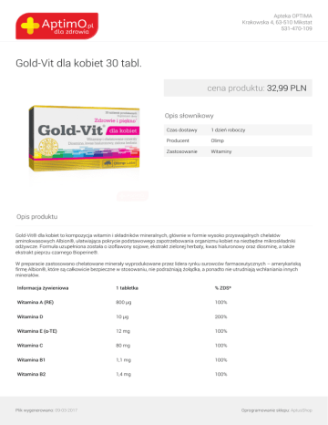 Apteka OPTIMA Krakowska 4, 63-510 Mikstat 531-470-109 Gold-Vit dla kobiet 30 tabl. cena produktu: 32,99 PLN Opis słownikowy Czas dostawy 1 dzień roboczy Producent Olimp Zastosowanie Witaminy Opis produktu Gold-Vit® dla kobiet to kompozycja witamin i składników mineralnych, głównie w formie wysoko przyswajalnych chelatów aminokwasowych Albion®, ułatwiająca pokrycie podstawowego zapotrzebowania organizmu kobiet na niezbędne mikroskładniki odżywcze. Formuła uzupełniona została o izoflawony sojowe, ekstrakt zielonej herbaty, kwas hialuronowy oraz diosminę, a także ekstrakt pieprzu czarnego Bioperine®. W preparacie zastosowano chelatowane minerały wyprodukowane przez lidera rynku surowców farmaceutycznych – amerykańską firmę Albion®, które są całkowicie bezpieczne w stosowaniu, nie podrażniają żołądka, a ponadto nie utrudniają wchłaniania innych minerałów. Informacja żywieniowa 1 tabletka % ZDS* Witamina A (RE) 800 µg 100% Witamina D 10 µg 200% Witamina E (α-TE) 12 mg 100% Witamina C 80 mg 100% Witamina B1 1,1 mg 100% Witamina B2 1,4 mg 100% Plik wygenerowano: 09-03-2017 Oprogramowanie sklepu: AptusShop Apteka OPTIMA Krakowska 4, 63-510 Mikstat 531-470-109 Niacyna (NE) 16 mg 100% Witamina B6 1,4 mg 100% Kwas foliowy 200 µg 100% Witamina B12 2,5 µg 100% Biotyna 100 µg 200% Kwas pantotenowy 6 mg 100% Diosmina 100 mg - Ekstrakt zielonej herbaty (55% EGCG) 40 mg - Ekstrakt izoflawonów sojowych (40%) w tym: izoflawony sojowe 10 mg 4 mg - Kwas hialuronowy 2 mg - Ekstrakt pieprzu czarnego Bioperine® 1 mg - Wapń 120 mg 15% Magnez 56,3 mg 15% Cynk 10 mg 100% Żelazo 3,5 mg 25% Mangan 1 mg 50% Miedź 250 µg 25% Jod 150 µg 100% Chrom 50 µg 120% Selen 55 µg 100% *%ZDS – procent realizacji zalecanego dziennego spożycia Zalecana dzienna porcja: 1 tabletka po posiłku popijając dużą ilością wody. Plik wygenerowano: 09-03-2017 Powered by TCPDF (www.tcpdf.org) Oprogramowanie sklepu: AptusShop