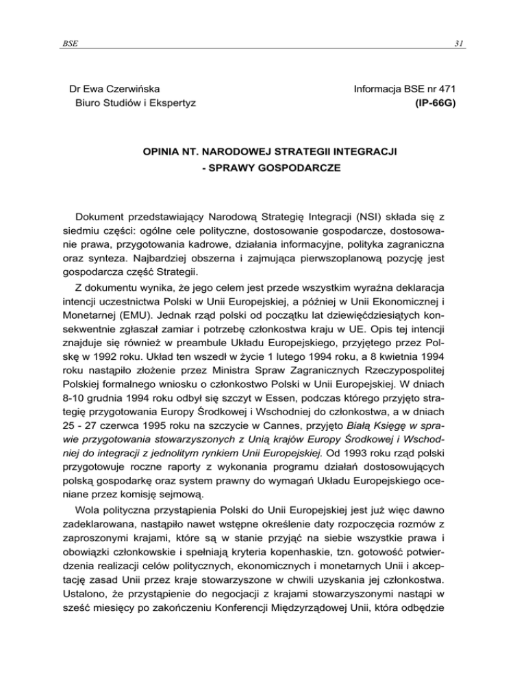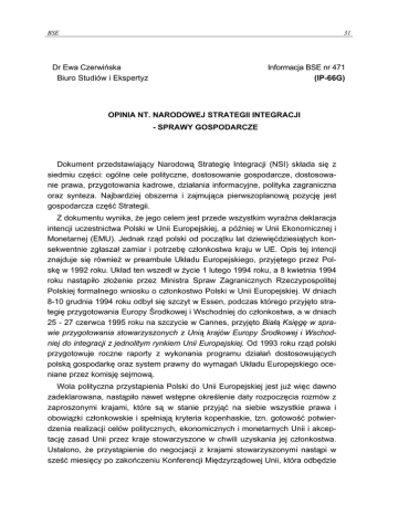 BSE 31 Dr Ewa Czerwińska Biuro Studiów i Ekspertyz Informacja BSE nr 471 (IP-66G) OPINIA NT. NARODOWEJ STRATEGII INTEGRACJI - SPRAWY GOSPODARCZE Dokument przedstawiający Narodową Strategię Integracji (NSI) składa się z siedmiu części: ogólne cele polityczne, dostosowanie gospodarcze, dostosowanie prawa, przygotowania kadrowe, działania informacyjne, polityka zagraniczna oraz synteza. Najbardziej obszerna i zajmująca pierwszoplanową pozycję jest gospodarcza część Strategii. Z dokumentu wynika, że jego celem jest przede wszystkim wyraźna deklaracja intencji uczestnictwa Polski w Unii Europejskiej, a później w Unii Ekonomicznej i Monetarnej (EMU). Jednak rząd polski od początku lat dziewięćdziesiątych konsekwentnie zgłaszał zamiar i potrzebę członkostwa kraju w UE. Opis tej intencji znajduje się również w preambule Układu Europejskiego, przyjętego przez Polskę w 1992 roku. Układ ten wszedł w życie 1 lutego 1994 roku, a 8 kwietnia 1994 roku nastąpiło złożenie przez Ministra Spraw Zagranicznych Rzeczypospolitej Polskiej formalnego wniosku o członkostwo Polski w Unii Europejskiej. W dniach 8-10 grudnia 1994 roku odbył się szczyt w Essen, podczas którego przyjęto strategię przygotowania Europy Środkowej i Wschodniej do członkostwa, a w dniach 25 - 27 czerwca 1995 roku na szczycie w Cannes, przyjęto Białą Księgę w sprawie przygotowania stowarzyszonych z Unią krajów Europy Środkowej i Wschodniej do integracji z jednolitym rynkiem Unii Europejskiej. Od 1993 roku rząd polski przygotowuje roczne raporty z wykonania programu działań dostosowujących polską gospodarkę oraz system prawny do wymagań Układu Europejskiego oceniane przez komisję sejmową. Wola polityczna przystąpienia Polski do Unii Europejskiej jest już więc dawno zadeklarowana, nastąpiło nawet wstępne określenie daty rozpoczęcia rozmów z zaproszonymi krajami, które są w stanie przyjąć na siebie wszystkie prawa i obowiązki członkowskie i spełniają kryteria kopenhaskie, tzn. gotowość potwierdzenia realizacji celów politycznych, ekonomicznych i monetarnych Unii i akceptację zasad Unii przez kraje stowarzyszone w chwili uzyskania jej członkostwa. Ustalono, że przystąpienie do negocjacji z krajami stowarzyszonymi nastąpi w sześć miesięcy po zakończeniu Konferencji Międzyrządowej Unii, która odbędzie 32 BSE się przypuszczalnie w połowie 1997 roku. Przy tworzeniu Strategii przyjęto więc już założenie, że negocjacje Polski z Unią na temat jej przyjęcia do tej struktury rozpoczną się na początku 1998 roku, a więc za rok! Wydawałoby się wobec tego, że w przyjętym dokumencie Narodowej Strategii Gospodarczej powinny być zawarte kwestie dotyczące właściwych i szybkich dostosowawczych działań rządu adaptujących gospodarkę polską oraz jej instytucje prawne i administracyjne do integracji z Unią Europejską a szczególnie prowadzących do likwidacji lub ograniczenia istotnych barier w tym zakresie. Istotne jest zwłaszcza wypracowanie ścieżki dojścia Polski do standardów i porównywalnego poziomu gospodarczego w krajach wspólnotowych. Z powodu znacznej różnicy rozwojowej pomiędzy gospodarką polską a gospodarką krajów należących do UE (nie dającej się zlikwidować w terminie kilku-, a nawet kilkunastoletnim), dokument ten powinien zawierać przede wszystkim określenie i strategię okresu przejściowego jako połączonego procesu rozwoju i integracji Polski z Unią Europejską a także absorpcji pomocy ze strony Unii dotyczącej zmniejszania tych różnic rozwojowych. Tymczasem, w Narodowej Strategii Gospodarczej, rząd polski deklaruje od razu, "by okresy przejściowe były nieliczne" (s. 15), stawiając się od razu na słabszej pozycji negocjacyjnej. Nie ma też przewidzianego dostosowania strategii integracyjnej rządu polskiego do koniecznych zmian w zasadach polityki Unii w okresie przyjmowania nowych członków z Europy Środkowej i Wschodniej. Dotyczy to zwłaszcza prowadzenia wspólnej polityki rolnej i wydatkowania funduszy strukturalnych i regionalnych. Konieczność bowiem przyjęcia istotnych przeobrażeń w zasadach wspólnej polityki Unii jeszcze przed przyłączeniem nowych państw jest sytuacją odróżniającą obecny proces poszerzania Unii od poprzednich. Od 1993 roku układy stowarzyszeniowe z Unią są postrzegane jako wstęp do członkostwa w UE. Dokumenty te nie wymieniają jednak wszystkich wymogów warunkujących członkostwo. Dotyczy to zwłaszcza wstępnych warunków, jakie mają spełnić nowi członkowie z Europy Środkowej i Wschodniej, przedstawionych na spotkaniach Rady Europy w Kopenhadze w 1993 roku i w Essen w 1994 roku. Jednym z podstawowych warunków tam przedstawionych jest zdolność kandydatów do współzawodnictwa na konkurencyjnym rynku Unii i zdolność do przyjęcia obowiązków członkowskich, tzn. przede wszystkim z przyjęcia tzw. acquis communotaire i wynikających stąd w sferze gospodarczej zasad wolnego rynku dóbr, usług, kapitału, siły roboczej, wspólnej polityki rolnej, polityki konkurencyjnej, dostosowań w zakresie polityki fiskalnej oraz zobowiązań wobec krajów rozwijających się. Wynika z tego również konieczność podporządkowania się nowych krajów wstępujących do Unii wszystkim decyzjom i przepisom prawnym obowiązującym w chwili wejścia w życie stosownych traktatów. Tymczasem przedstawiony dokument ma charakter luźnego zbioru ogólnych BSE problemów do rozwiązania związanych z integracją europejską bez określenia ścieżki dojścia do założonych celów. Ponieważ deklaracja przystąpienia Polski do Unii nie budzi wątpliwości, ważniejsze byłoby przedstawienie, jakie zagadnienia mają być w pierwszej kolejności przedmiotem negocjacji, jakie cele mamy uzyskać przy negocjowaniu okresu przejściowego, jakie działania w procesie przygotowań integracyjnych przyniosły już rezultaty, a jakie i w jakim terminie wymagają 