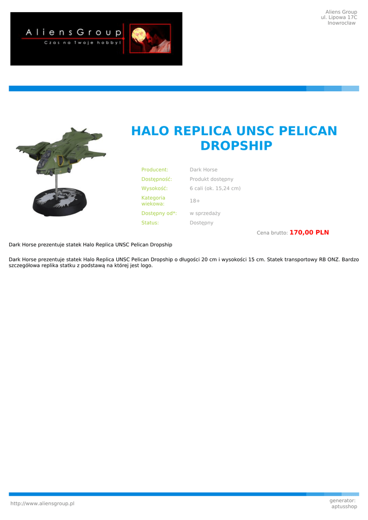 Aliens Group ul. Lipowa 17C Inowrocław HALO REPLICA UNSC PELICAN DROPSHIP Producent: Dark Horse Dostępność: Produkt dostępny Wysokość: 6 cali (ok. 15,24 cm) Kategoria wiekowa: 18+ Dostępny od*: w sprzedaży Status: Dostępny Cena brutto: 170,00 PLN Dark Horse prezentuje statek Halo Replica UNSC Pelican Dropship Dark Horse prezentuje statek Halo Replica UNSC Pelican Dropship o długości 20 cm i wysokości 15 cm. Statek transportowy RB ONZ. Bardzo szczegółowa replika statku z podstawą na której jest logo. http://www.aliensgroup.pl generator: aptusshop