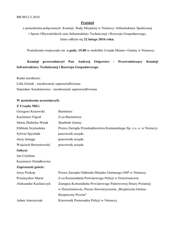 BR.0012.3.2016 Protokół z posiedzenia połączonych Komisji Rady Miejskiej w Niemczy: Infrastruktury Społecznej i Spraw Obywatelskich oraz Infrastruktury Technicznej i Rozwoju Gospodarczego, które odbyło się 22 lutego 2016 roku. Posiedzenie rozpoczęło się o godz. 15.00 w siedzibie Urzędu Miasta i Gminy w Niemczy. Komisji przewodniczył Pan Andrzej Osipowicz Infrastruktury Technicznej i Rozwoju Gospodarczego. - Przewodniczący Komisji Radni nieobecni: Lilla Górnik - nieobecność usprawiedliwiona Stanisław Szachniewicz - nieobecność usprawiedliwiona W posiedzeniu uczestniczyli: Z Urzędu MiG: Grzegorz Kosowski Burmistrz Kazimierz Figzał Z-ca Burmistrza Elżbieta Szymańska Prezes Zarządu Przedsiębiorstwa Komunalnego Sp. z o. o. w Niemczy Marta Żłobicka-Wnuk Sylwia Spychała Jerzy Jasięga Wojciech Borzestowski Sołtysi: Skarbnik Gminy pracownik urzędu pracownik urzędu pracownik urzędu Jan Cieleban Kazimierz Dziadkowiec Zaproszeni goście: Jerzy Prokop Przemysław Marut Aleksander Kucharczyk Adam Antoszczak Prezes Zarządu Oddziału Miejsko Gminnego OSP w Niemczy Z-ca Komendanta Powiatowego Policji w Dzierżoniowie Zastępca Komendanta Powiatowego Państwowej Straży Pożarnej w Dzierżoniowie, Prezes Stowarzyszenia „Bezpieczna GminaBezpieczny Powiat” Kierownik Posterunku Policji w Niemczy Tematami posiedzenia było: 1. Bezpieczeństwo na terenie Gminy Niemcza. 2. Opiniowanie projektów uchwał. 3. Funkcjonowanie cmentarza komunalnego w Niemczy – problemy, plany na najbliższe lata. 4. Sprawy różne. Ad 1. Przewodniczący posiedzenia powitał przybyłych gości, radnych, burmistrzów, sołtysów, oraz pracowników urzędu, następnie otworzył posiedzenie Komisji i przedstawił porządek obrad. Kierownik Posterunku Policji w Niemczy, Pan Adam Antoszczak, zaprezentował analizę stanu bezpieczeństwa w Gminie Niemcza w ujęciu powiatowym. Radna Edyta Mielnik zapytała, jaki wpływ na stan bezpieczeństwa ma monitoring. Kierownik odpowiedział, że monitoring niewątpliwie spełnia funkcję prewencyjną, dwukrotnie nagrania przyczyniły się także do wyjaśnienia postępowania. Radny Tomasz Nowak ocenił działania Policji jako zadawalające, uważa jednak, że monitoring, w założenie którego Gmina zainwestowała 100 tys. zł, należy wykorzystywać częściej. Podtrzymał także swoja prośbę o zwiększenie częstotliwości patroli w Niemczy. Radna Justyna Kaczorowska wróciła do zgłaszanej w tamtym roku sprawy tirów przejeżdżających przez Przerzeczyn-Zdrój. Radna Edyta Mielnik poruszyła temat samochodów, które przejeżdżają przez Podlesie z niebezpieczną prędkością i poprosiła o wzmożenie kontroli drogowych. Sołtys Jan Cieleban zwrócił uwagę, że znak ograniczenia prędkości do 40 km/h w Przerzeczynie-Zdroju, powinien być ustawiony przed fotoradarem. Sołtys Kazimierz Dziadkowiec zapytał Komendanta, czy wiadomo coś w sprawie ostatnich włamań do sklepów w Przerzeczynie-Zdroju i Piławie. Komendant Przemysław Marut ustosunkował się do uwag Radnych oraz przedstawił cele działań Policji w Niemczy. Następnie głos zabrał Pan Aleksander Kucharczyk, Prezes Stowarzyszenia „Bezpieczna Gmina-Bezpieczny Powiat”, który omówił zagrożenia pożarowe i inne niż pożary zdarzenia (chodzi tu przeważnie o zdarzenia na drodze oraz zdarzenia związane z wadliwym ogrzewaniem budynków mieszkalnych) w Gminie Niemcza w 2015 roku. Komendant Kucharczyk pochwalił dyspozycyjność gminnych jednostek Ochotniczej Straży Pożarnej. Komendant Marut zaapelował o wsparcie finansowe działalności statutowej Stowarzyszenia „Bezpieczna Gmina-Bezpieczny Powiat”. Dzięki takiej pomocy samorządów Stowarzyszenie zakupuje czujki dymu i czadu, później rozdawane mieszkańcom w akcjach edukacyjnych. Panowie Komendanci wymienili akcje organizowane przez Stowarzyszenie. Po wyczerpaniu dyskusji Radni podziękowali Komendantom i Kierownikowi Posterunku w Niemczy za przybycie. Ad 2. Radni przystąpili do opiniowania projektów uchwał w sprawie: 1) ustalenia wysokości ekwiwalentu dla członka ochotniczej straży pożarnej, który uczestniczył w działaniu ratowniczym lub szkoleniu pożarniczym organizowanym przez Państwową Straż Pożarną lub Gminę Niemcza; Podjęcie uchwały uzasadnił Pan Jerzy Prokop, Prezes Zarządu Oddziału Miejsko Gminnego OSP w Niemczy. Projekt zakłada zwiększenie ekwiwalentów członków OSP biorących udział w akcjach ratowniczo-gaśniczych z 13,00 zł do 16,00 zł za 1 godzinę akcji oraz za udział w szkoleniach z 5,00 zł do 8,00 zł za 1 godzinę szkolenia. Pan Prezes dodatkowo wymienił liczbę akcji, w których uczestniczyły poszczególne jednostki OSP w 2015 roku. Poinformował również Radnych, że powiatowe zawody ratowniczo-gaśnicze, odbędą się w tym roku w Niemczy 4 czerwca o godz. 14.00. Radni nie mieli uwag do projektu uchwały. Za pozytywnym zaopiniowaniem projektu głosowało 12 radnych obecnych na posiedzeniu. 2) przyjęcia programu opieki nad zwierzętami bezdomnymi bezdomności zwierząt na terenie Gminy Niemcza w 2016 roku; oraz zapobiegania Projekt uchwały omówił Pan Jerzy Jasięga. W programie założono 25 000 zł na odławianie 10 bezpańskich psów, w 2015 roku odłowiono 6 takich psów, 4 niewykorzystane miejsca zostały przeniesione na ten rok i do dziś już zrealizowane. Za pozytywnym zaopiniowaniem projektu głosowało 12 radnych obecnych na posiedzeniu. 3) dokonania zmian w budżecie Miasta i Gminy Niemcza na 2016 rok. Skarbnik Gminy odczytała uzasadnienie zmian w budżecie na 2016 rok. Radna Edyta Mielnik poprosiła o wyjaśnienie zmian w rozdziale 92601. Radni poruszyli dyskusję na temat kosztów utrzymania boiska Orlik i poprosili o przygotowanie na sesję zestawienia kosztów utrzymania boiska. Radny Tomasz Nowak poprosił wyjaśnienie zmian w rozdziale 80104 dotyczące wykonania studium wykonalności projektu na budowę przedszkola. Szczegóły dotyczące realizacji 