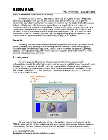 s FAQ: 00000068/PL Data: 30/01/2015 WinCC Professional – Swobodny zrzut ekranu System wizualizacji WinCC posiada szerokie oraz elastyczne metody konfiguracji sprawozdań procesowych. Często jednak odzwierciedlenie wartości poszczególnych parametrów zawartych na ekranie synoptycznym w formie raportu jest trudna bądź wymaga dużego nakładu pracy. Bardzo często najprostszym i w zupełności wystarczającym mechanizmem jest wykonanie sprawozdania w formie graficznej na ekranie procesowym, a następnie w odpowiednim momencie wykonanie jego zrzutu. Funkcja taka dostępna jest zarówno przez standardowe mechanizmy systemu operacyjnego jak i w obszarze funkcji systemowych WinCC. W takim wypadku najczęściej pojawiającą się niedogodnością jest brak możliwości ograniczenia obszaru przechwytywanego przez system. Zadanie Niniejszy dokument ma na celu przedstawienie prostej możliwości wykonania zrzutu ekranu podczas pracy aplikacji wizualizacyjnej w trybie Runtime. Cechą odróżniającą tą funkcjonalność od standardowego zrzutu ekranu, jest sposobność wskazania wybranego obszaru ekranu procesowego, który ma zostać przechwycony oraz wydrukowany w formie pliku lub bezpośrednio na drukarkę. Rozwiązanie W tym przypadku kluczem do osiągnięcia przedstawionego zadania jest wykorzystanie standardowej funkcji systemu operacyjnego z uwzględnieniem parametryzacji jej przez skrypt wywołany w WinCC – w trybie pracy aplikacji. Załóżmy więc, że chcemy przechwycić część wyświetlanego ekranu, gdzie punktem odniesienia będzie lewy górny wierzchołek prostokąta (x, y), natomiast jego zakres wskażą parametry (w, h) zgodnie z poniższym zrzutem ekranu: W celu uzyskania pożądanego efektu wykorzystamy zdarzenie skryptowe języka ANSI C, które pozwoli nam wywołać oraz sparametryzować odpowiednią aplikację systemu operacyjnego. Formuła naszego zdarzenia może wyglądać, np. w następujący sposób: www.siemens.pl/simatic Doradztwo techniczne: [email protected] 1 s FAQ: 00000068/PL Data: 30/01/2015 WinCC Professional – Swobodny zrzut ekranu Uwagi: Funkcja WinExec pozwala na uruchomienie dowolnej aplikacji. Jako parametry przyjmuje ona nazwę aplikacji (oraz jej ewentualne atrybuty), a także tryb wyświetlania okna wywoływanej aplikacji. Drugi parametr może przyjąć kilkanaście wartości w zależności od tego czy okno ma być zmaksymalizowane, zminimalizowane, ukryte, w trybie domyślnym (SW_SHOWNORMAL), etc. Więcej informacji na temat tego parametru można odszukać w następującej lokalizacji sieciowej: https://msdn.microsoft.com/en-us/library/windows/desktop/ms633548(v=vs.85).aspx Aplikacja, która została wykorzystana, czyli PrtScr.exe pozwala na wykonanie zrzutu ekranu oraz jego wydruk na domyślną drukarkę, może być to urządzeni fizyczne lub plik graficzny. Informacje na temat poprawnej parametryzacji odszukać można w poniższej lokalizacji sieciowej: http://support.automation.siemens.com/WW/view/en/22055344 Zastosowany atrybut C wraz z informacją na temat pozycji startowej oraz szerokości i wysokości przechwytywanego obrazu pozwala swobodnie wykonać zrzut ekranu oraz automatycznie wydrukować go na domyślną drukarkę. Więcej informacji na temat dostępnych atrybutów znajduje się w poniższej dokumentacji: https://www.automation.siemens.com/mdm/default.aspx?DocVersionId=1648442612 3&TopicId=2371018251 Rezultat Wynikiem pracy naszego krótkiego skryptu jest zrzut ekranu, którego lewy górny narożnik stanowi współrzędne na ekranie (x, y) = (20, 10), o wymiarach (w, h) = (800, 400). Wydruk do pliku PDF widoczny jest na zdjęciu poniżej: www.siemens.pl/simatic Doradztwo techniczne: [email protected] 2 s FAQ: 00000068/PL Data: 30/01/2015 WinCC Professional – Swobodny zrzut ekranu Przykład został przygotowany w środowisku WinCC Professional V12 SP1 pod Windows 7x64. Może on być jednak swobodnie zaadoptowany do klasycznej wersji WinCC v7.x. Więcej informacji na temat konfiguracji systemu WinCC można uzyskać w regionalnych biurach sprzedaży Siemens lub kontaktując się bezpośrednio z działem wsparcia technicznego Simatic. www.siemens.pl/simatic Doradztwo techniczne: [email protected] 3