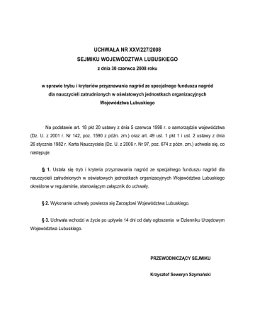 UCHWAŁA NR XXV/227/2008 SEJMIKU WOJEWÓDZTWA LUBUSKIEGO z dnia 30 czerwca 2008 roku w sprawie trybu i kryteriów przyznawania nagród ze specjalnego funduszu nagród dla nauczycieli zatrudnionych w oświatowych jednostkach organizacyjnych Województwa Lubuskiego Na podstawie art. 18 pkt 20 ustawy z dnia 5 czerwca 1998 r. o samorządzie województwa (Dz. U. z 2001 r. Nr 142, poz. 1590 z późn. zm.) oraz art. 49 ust. 1 pkt 1 i ust. 2 ustawy z dnia 26 stycznia 1982 r. Karta Nauczyciela (Dz. U. z 2006 r. Nr 97, poz. 674 z późn. zm.) uchwala się, co następuje: § 1. Ustala się tryb i kryteria przyznawania nagród ze specjalnego funduszu nagród dla nauczycieli zatrudnionych w oświatowych jednostkach organizacyjnych Województwa Lubuskiego określone w regulaminie, stanowiącym załącznik do uchwały. § 2. Wykonanie uchwały powierza się Zarządowi Województwa Lubuskiego. § 3. Uchwała wchodzi w Ŝycie po upływie 14 dni od daty ogłoszenia w Dzienniku Urzędowym Województwa Lubuskiego. PRZEWODNICZĄCY SEJMIKU Krzysztof Seweryn Szymański Załącznik do uchwały Nr XXV/227/2008 Sejmiku Województwa Lubuskiego z dnia 30 czerwca 2008 roku Regulamin w sprawie trybu i kryteriów przyznawania nagród ze specjalnego funduszu nagród dla nauczycieli zatrudnionych w oświatowych jednostkach organizacyjnych Województwa Lubuskiego § 1. 1. W budŜecie Województwa tworzy się specjalny fundusz nagród dla nauczycieli w wysokości 1% planowanych rocznych wynagrodzeń osobowych, z tym Ŝe: 1) 80% środków funduszu przeznacza się na nagrody dyrektora, 2) 20% środków funduszu przeznacza się na nagrody Zarządu Województwa Lubuskiego. 2. Środki niewykorzystane w ramach funduszu płac na dodatki motywacyjne mogą być przeznaczone na zwiększenie funduszu nagród. 3. Organ prowadzący szkoły/placówki moŜe dokonać zwiększenia funduszu nagród z przeznaczeniem na nagrody Zarządu Województwa Lubuskiego. § 2. 1. Nagrody ze specjalnego funduszu nagród mają charakter uznaniowy i są przyznawane w terminie do dnia 14 października kaŜdego roku z okazji Dnia Edukacji Narodowej. W szczególnie uzasadnionych przypadkach nagroda moŜe być przyznana na zakończenie roku szkolnego lub w innym terminie. 2. Nagrody mogą być przyznawane nauczycielom za szczególne oraz wybitne osiągnięcia w realizacji zadań statutowych jednostki oraz osiągnięcia dydaktyczno – wychowawcze i opiekuńcze w pracy zawodowej, po przepracowaniu w szkole/placówce co najmniej 1 roku. § 3. 1. W ramach środków funduszu, o których mowa w § 1 ust. 1 pkt 2, przyznawane są nagrody I i II stopnia Zarządu Województwa Lubuskiego. 2. Wysokość nagrody I stopnia Zarządu Województwa ustalana jest corocznie przez Zarząd Województwa Lubuskiego. 3. Wysokość nagrody II stopnia wynosi 50 % wartości nagrody I stopnia. 4. Wysokość nagrody dyrektora jest ustalana corocznie przez dyrektora szkoły/placówki. § 4. 1. Nagrody dla nauczycieli przyznaje się za szczególne osiągnięcia dydaktyczno – wychowawcze, a w szczególności: 1) w zakresie pracy dydaktycznej uwzględniając: a) opracowywanie innowacyjnych programów dydaktycznych i wychowawczych, b) stwierdzone, co najmniej dobre wyniki nauczania danego przedmiotu, c) pracę z uczniem zdolnym bądź mającym trudności w nauce, d) osiąganie przez szkołę bardzo dobrych wyników nauczania i wychowania, e) liczny udział uczniów w olimpiadach, konkursach i zawodach międzyszkolnych, regionalnych i krajowych oraz osiągnięcia uczniów na szczeblu pozaszkolnym, 2) w zakresie pracy wychowawczej uwzględniając : a) zaangaŜowanie nauczyciela w budowanie i realizację szkolnego programu wychowawczego, b) zaangaŜowanie nauczyciela w działalność pozalekcyjną szkoły, c) zainteresowanie uczniem i jego środowiskiem, współpracę z rodzicami i instytucjami wspierającymi szkołę/placówkę, d) przygotowanie i zrealizowanie znaczących zadań w procesie wychowawczym na potrzeby środowiska lokalnego i regionalnego, 3) w zakresie podnoszenia kwalifikacji i kompetencji zawodowych uwzględniając: a) doskonalenie własnego warsztatu pracy, b) aktywną pomoc w adaptacji zawodowej młodych nauczycieli, c) inicjowanie róŜnorodnych działań rady pedagogicznej, słuŜących podnoszeniu jakości pracy jednostki, d) kreatywną współpracę z innymi instytucjami, w tym placówkami oświatowymi, e) róŜnorodność ofert adresowanych do nauczycieli, a wynikających z potrzeb i oczekiwań środowiska oświatowego. 2. W przypadku nagród dla dyrektorów moŜna równieŜ uwzględnić: 1) bardzo dobrą organizację pracy szkoły/placówki, 2) inicjowanie róŜnorodnych działań słuŜących podnoszeniu jakości pracy szkoły/placówki, 3) umiejętność gospodarowania środkami finansowymi, pozyskiwanie środków pozabudŜetowych, 4) dbanie o bazę szkolną, 5) właściwe wykonywanie zadań wynikających z funkcji kierownika zakładu pracy oraz wzorową realizację misji szkoły. 3. Nauczyciele szkół/placówek typowani do nagrody Zarządu Województwa Lubuskiego powinni posiadać co najmniej dobrą ocenę pracy. § 5. Z wnioskiem o przyznanie nagrody dyrektora moŜe wystąpić dyrektor, rada pedagogiczna, rada rodziców oraz zakładowe organizacje związkowe. § 6. 1. Wnioski o przyznanie nagrody Zarządu Województwa Lubuskiego dla nauczycieli naleŜy składać w terminie do 20 września kaŜdego roku, a w przypadku nagród na zakończenie roku szkolnego do 15 maja. 2. Wzór wniosku, o którym mowa w ust. 1, określa załącznik do niniejszego regulaminu. 3. Z wnioskami o przyznanie nagrody Zarządu Województwa Lubuskiego dla nauczycieli jednostek oświatowych prowadzonych przez Województwo Lubuskie występują: 1)dyrektorzy tych jednostek, 2)Lubuski Kurator Oświaty bezpośrednio nadzorujący pracę szkoły/placówki, 3)Dyrektor właściwego Departamentu Urzędu Marszałkowskiego Województwa Lubuskiego, 4)instancje wojewódzkie nauczycielskich związków za