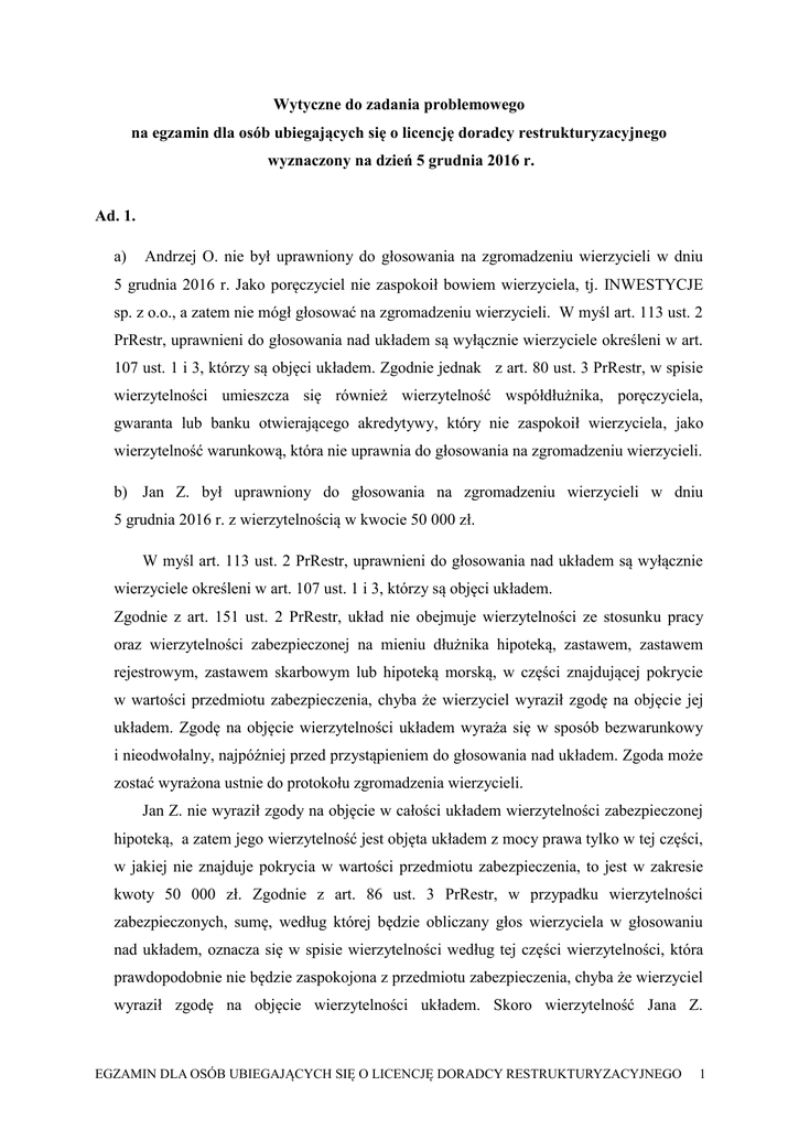 Wytyczne do zadania problemowego na egzamin dla osób ubiegających się o licencję doradcy restrukturyzacyjnego wyznaczony na dzień 5 grudnia 2016 r. Ad. 1. a) Andrzej O. nie był uprawniony do głosowania na zgromadzeniu wierzycieli w dniu 5 grudnia 2016 r. Jako poręczyciel nie zaspokoił bowiem wierzyciela, tj. INWESTYCJE sp. z o.o., a zatem nie mógł głosować na zgromadzeniu wierzycieli. W myśl art. 113 ust. 2 PrRestr, uprawnieni do głosowania nad układem są wyłącznie wierzyciele określeni w art. 107 ust. 1 i 3, którzy są objęci układem. Zgodnie jednak z art. 80 ust. 3 PrRestr, w spisie wierzytelności umieszcza się również wierzytelność współdłużnika, poręczyciela, gwaranta lub banku otwierającego akredytywy, który nie zaspokoił wierzyciela, jako wierzytelność warunkową, która nie uprawnia do głosowania na zgromadzeniu wierzycieli. b) Jan Z. był uprawniony do głosowania na zgromadzeniu wierzycieli w dniu 5 grudnia 2016 r. z wierzytelnością w kwocie 50 000 zł. W myśl art. 113 ust. 2 PrRestr, uprawnieni do głosowania nad układem są wyłącznie wierzyciele określeni w art. 107 ust. 1 i 3, którzy są objęci układem. Zgodnie z art. 151 ust. 2 PrRestr, układ nie obejmuje wierzytelności ze stosunku pracy oraz wierzytelności zabezpieczonej na mieniu dłużnika hipoteką, zastawem, zastawem rejestrowym, zastawem skarbowym lub hipoteką morską, w części znajdującej pokrycie w wartości przedmiotu zabezpieczenia, chyba że wierzyciel wyraził zgodę na objęcie jej układem. Zgodę na objęcie wierzytelności układem wyraża się w sposób bezwarunkowy i nieodwołalny, najpóźniej przed przystąpieniem do głosowania nad układem. Zgoda może zostać wyrażona ustnie do protokołu zgromadzenia wierzycieli. Jan Z. nie wyraził zgody na objęcie w całości układem wierzytelności zabezpieczonej hipoteką, a zatem jego wierzytelność jest objęta układem z mocy prawa tylko w tej części, w jakiej nie znajduje pokrycia w wartości przedmiotu zabezpieczenia, to jest w zakresie kwoty 50 000 zł. Zgodnie z art. 86 ust. 3 PrRestr, w przypadku wierzytelności zabezpieczonych, sumę, według której będzie obliczany głos wierzyciela w głosowaniu nad układem, oznacza się w spisie wierzytelności według tej części wierzytelności, która prawdopodobnie nie będzie zaspokojona z przedmiotu zabezpieczenia, chyba że wierzyciel wyraził zgodę na objęcie wierzytelności układem. Skoro wierzytelność Jana Z. EGZAMIN DLA OSÓB UBIEGAJĄCYCH SIĘ O LICENCJĘ DORADCY RESTRUKTURYZACYJNEGO 1 prawdopodobnie nie będzie zaspokojona z przedmiotu zabezpieczenia w kwocie 50 000 zł, to z tą sumą Jan Z. mógł głosować nad układem na zgromadzeniu wierzycieli. c) Głos oddany przez Franciszka P. - samoistnego prokurenta INWESTYCJE sp. z o.o. w imieniu tej spółki jest ważny. Do oddania głosu na zgromadzeniu wierzycieli przez prokurenta samoistnego nie jest wymagane odrębne pełnomocnictwo do głosowania nad układem. Zgodnie z art. 1091 § 1 k.c., prokura jest pełnomocnictwem udzielonym przez przedsiębiorcę podlegającego obowiązkowi wpisu do rejestru przedsiębiorców, które obejmuje umocowanie do czynności sądowych i pozasądowych, jakie są związane z prowadzeniem przedsiębiorstwa. Upoważnienie prokurenta do składania w imieniu przedsiębiorcy oświadczeń woli wynika z mocy ustawy i obejmuje także głosowanie nad układem. Ad. 2 W zgromadzeniu wierzycieli w dniu 5 grudnia 2016 r. uczestniczyła liczba wierzycieli wymagana do zawarcia układu. Zgodnie z art. 113 ust. 1 PrRestr, na zgromadzeniu wierzycieli można zawrzeć układ, jeżeli w zgromadzeniu uczestniczy co najmniej jedna piąta wierzycieli uprawnionych do głosowania nad układem. W myśl art. 113 ust. 2 PrRestr, uprawnieni do głosowania nad układem są wyłącznie wierzyciele określeni w art. 107 ust. 1 i 3, którzy są objęci układem. W zaprezentowanym stanie faktycznym udział w zgromadzeniu wierzycieli wzięli – osobiście lub oddając głosy na piśmie - następujący wierzyciele uprawnieni do głosowania nad układem, którzy oddali ważne głosy: - INWESTYCJE sp. z o.o., - Jan Z. - oraz trzech wierzycieli, którzy oddali głosy na piśmie. W zgromadzeniu wierzycieli uczestniczyło więc pięciu z czternastu wierzycieli uprawnionych do głosowania nad układem (Andrzej O., z uwagi na treść art. 80 ust. 3 EGZAMIN DLA OSÓB UBIEGAJĄCYCH SIĘ O LICENCJĘ DORADCY RESTRUKTURYZACYJNEGO 2 PrRestr, nie był uprawniony do głosowania na zgromadzeniu wierzycieli), a zatem więcej niż jedna piąta wierzycieli uprawnionych do głosowania nad układem. Ad.3 Układ został przyjęty. Art. 119 ust. 1 PrRestr stanowi, że uchwała zgromadzenia wierzycieli o przyjęciu układu zapada, jeżeli wypowie się za nią większość głosujących wierzycieli, którzy oddali ważny głos, mających łącznie co najmniej dwie trzecie sumy wierzytelności przysługujących głosującym wierzycielom. W opisanym stanie faktycznym ważne głosy za układem oddali następujący wierzyciele: - INWESTYCJE sp. z o.o. z wierzytelnością w wys. 175 000 zł; oraz trzech wierzycieli z sumą wierzytelności w łącznej wysokości 170 000 zł. Suma wierzytelności przysługująca wszystkim wierzycielom, którzy oddali ważny głos na zgromadzeniu wierzycieli w dniu 5 grudnia 2016 r. wynosiła 395 000 zł. Za przyjęciem układu głos oddała zatem większość głosujących wierzycieli, to jest czterech wierzycieli z sumą wierzytelności w łącznej wysokości 345 000 zł (INWESTYCJE sp. z o.o. oraz trzech wierzycieli głosujących na piśmie) z pięciu wierzycieli mających prawo głosu i biorących udział w głosowaniu na zgromadzeniu wierzycieli w dniu 5 grudnia 2016 r. Przy ustalaniu większości osobowej i kapitałowej wymaganej do przyjęcia układu nie powinni być uwzględniani wierzyciele, którzy nie mieli prawa głosu na zgromadzeniu wierzycieli. EGZAMIN DLA OSÓB UBIEGAJĄC