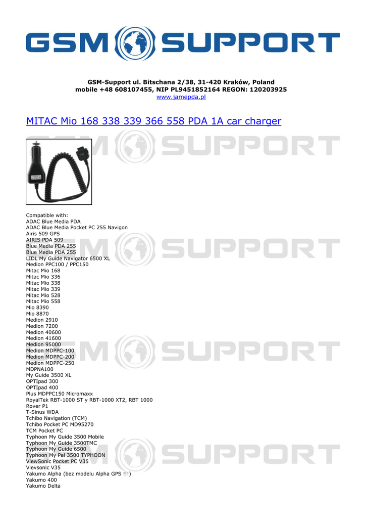 GSM-Support ul. Bitschana 2/38, 31-420 Kraków, Poland mobile +48 608107455, NIP PL9451852164 REGON: 120203925 www.jamepda.pl MITAC Mio 168 338 339 366 558 PDA 1A car charger Compatible with: ADAC Blue Media PDA ADAC Blue Media Pocket PC 255 Navigon Airis 509 GPS AIRIS PDA 509 Blue Media PDA 255 Blue Media PDA 255 LIDL My Guide Navigator 6500 XL Medion PPC100 / PPC150 Mitac Mio 168 Mitac Mio 336 Mitac Mio 338 Mitac Mio 339 Mitac Mio 528 Mitac Mio 558 Mio 8390 Mio 8870 Medion 2910 Medion 7200 Medion 40600 Medion 41600 Medion 95000 Medion MDPPC-100 Medion MDPPC-200 Medion MDPPC-250 MDPNA100 My Guide 3500 XL OPTIpad 300 OPTIpad 400 Plus MDPPC150 Micromaxx RoyalTek RBT-1000 ST y RBT-1000 XT2, RBT 1000 Rover P1 T-Sinus WDA Tchibo Navigation (TCM) Tchibo Pocket PC MD95270 TCM Pocket PC Typhoon My Guide 3500 Mobile Typhoon My Guide 3500TMC Typhoon My Guide 6500 Typhoon My Pal 3500 TYPHOON ViewSonic Pocket PC V35 Vievsonic V35 Yakumo Alpha (bez modelu Alpha GPS !!!) Yakumo 400 Yakumo Delta Yakumo Delta 200 Yakumo Delta 200 GPS Yakumo Delta 300 Yakumo Delta 300 GPS Yakumo Delta 300 GPS 2L Yakumo Delta 400 Yakumo Delta 400 GPS Car charger for your PDA, perfect for keeping your battery topped up whilst in the car, or keeping your palm going during a long journey. Simply fit it into the cigarette lighter port in your car, plug the tangle proof cable into your device and away you go. You’ll never run out of power again - great for business trips or long journeys! Green light indicates readiness for charging. Can be used with 12 VDC or 24 VDC systems. High quality, light weight, small, and unobtrusive. ©2012 www.jamepda.pl Powered by TCPDF (www.tcpdf.org)