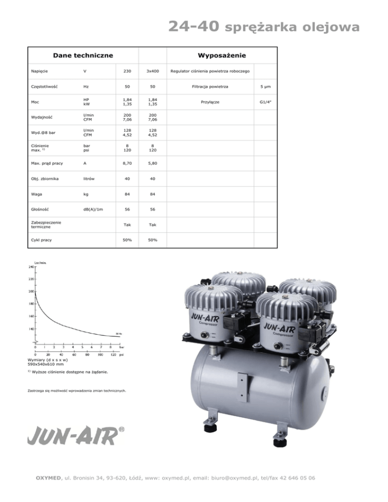 24-40 sprężarka olejowa Dane techniczne Napięcie V Częstotliwość Wyposażenie 230 3x400 Regulator ciśnienia powietrza roboczego Hz 50 50 Filtracja powietrza 5 µm Moc HP kW 1,84 1,35 1,84 1,35 Przyłącze G1/4‟ Wydajność l/min CFM 200 7,06 200 7,06 Wyd.@8 bar l/min CFM 128 4,52 128 4,52 Ciśnienie max. 1) bar psi 8 120 8 120 Max. prąd pracy A 8,70 5,80 Obj. zbiornika litrów 40 40 Waga kg 84 84 Głośność dB(A)/1m 56 56 Zabezpieczenie termiczne Tak Tak Cykl pracy 50% 50% Wymiary (d x s x w) 590x540x610 mm 1) Wyższe ciśnienie dostępne na żądanie. Zastrzega się możliwość wprowadzenia zmian technicznych. OXYMED, ul. Bronisin 34, 93-620, Łódź, www: oxymed.pl, email: [email protected], tel/fax 42 646 05 06