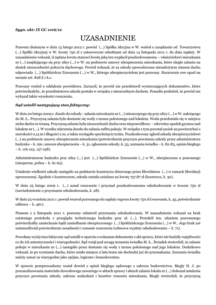 Sygn. akt: IX GC 1016/12 UZASADNIENIE Pozwem złożonym w dniu 13 lutego 2012 r. powód (...) Spółka Akcyjna w W. wniósł o zasądzenie od Towarzystwa (...) Spółki Akcyjnej w W. kwoty 750 zł z ustawowymi odsetkami od dnia 14 listopada 2011 r. do dnia zapłaty. W uzasadnieniu wskazał, iż żądana kwota stanowi kwotę jaką ten wypłacił poszkodowanemu – właścicielowi mieszkania nr (...) znajdującego się przy ulicy (...) w W. na podstawie umowy ubezpieczenia mieszkania, które uległo zalaniu na skutek nieszczelności pokrycia dachowego. Powód wskazał, że za szkody spowodowane nienależytym stanem dachu odpowiada (...) Spółdzielcze Zrzeszenie (...) w W., którego ubezpieczycielem jest pozwany. Roszczenie swe oparł na normie art. 828 § 1 k.c. Pozwany wniósł o oddalenie powództwa. Zarzucił, że powód nie przedstawił wystarczających dokumentów, które potwierdzałyby, że przedmiotowa szkoda postała w związku z nieszczelnym dachem. Ponadto podniósł, że powód nie wykazał także wysokości roszczenia. Sąd ustalił następujący stan faktyczny: W dniu 20 lutego 2009 r. doszło do szkody - zalania mieszkania nr (...) mieszczącego się przy ulicy (...) w W. należącego do M. Ł.. Przyczyną zalania było dostanie się wody z tarasu położonego nad lokalem. Woda przedostała się w miejscu styku dachu ze ścianą. Przyczyną zalania była nieszczelność dachu oraz nieprawidłowy – odwrotny spadek gzymsu nad lokalem nr (...). W wyniku zdarzenia doszło do zalania sufitu pokoju. W związku z tym powstał zaciek na powierzchni o szerokości 0,15 m i długości 2 m, a także wystąpiło spuchnięcie tynku. Poszkodowany zgłosił szkodę ubezpieczycielowi (...) na podstawie umowy ubezpieczenia mieszkania (potwierdzenie przyczyn powstania szkody przez administratora budynku – k. 29v, umowa ubezpieczenia – k. 31, zgłoszenie szkody, k. 33, zeznania świadka – k. 82-83, opinia biegłego – k. 116-123, 157-158). Administratorem budynku przy ulicy (...) jest (...) Spółdzielcze Zrzeszenie (...) w W., ubezpieczone u pozwanego (niesporne, polisa – k. 61-63). Ustalenie wielkości szkody nastąpiło na podstawie kosztorysu zbiorczego przez likwidatora (...) w ramach likwidacji uproszczonej. Zgodnie z kosztorysem, szkoda została ustalona na kwotę 757,87 zł (kosztorys, k. 30). W dniu 25 lutego 2009 r. (...) uznał roszczenie i przyznał poszkodowanemu odszkodowanie w kwocie 750 zł (zawiadomienie o przyznaniu odszkodowania, k. 28). W dniu 23 września 2011 r. powód wezwał pozwanego do zapłaty regresu kwoty 750 zł (wezwanie, k. 45, potwierdzenie odbioru – k. 46v). Pismem z 2 listopada 2011 r. pozwany odmówił przyznania odszkodowania. W uzasadnieniu wskazał na brak ostatniego protokołu z przeglądu technicznego budynku przy ul. (...). Protokół ten, zdaniem pozwannego potwierdzałby zaniechanie bądź zaniedbanie ubezpieczonego (...) Spółdzielczego Zrzeszenia (...) w W.. Jego brak zaś uniemożliwiał potwierdzenie zasadności i uznanie roszczenia (odmowa wypłaty odszkodowania – k. 71). Powołany wyżej stan faktyczny sąd ustalił w oparciu o wskazane dokumenty z akt sprawy, które nie budziły wątpliwości co do ich autentyczności i wiarygodności. Sąd wziął pod uwagę zeznania świadka M. Ł.. Świadek stwierdził, że zalanie pokoju w mieszkaniu nr (...) nastąpiło przez dostanie się wody z tarasu położonego nad jego lokalem. Dodatkowo wskazał, że po wymianie dachu, które miało miejsce 2 lata temu nie dochodzi już do przemakania. Zeznania świadka należy uznać za wiarygodne jako spójne, logiczne i konsekwentne. W sprawie przeprowadzony został dowód z opinii biegłego sądowego z zakresu budownictwa. Biegły H. J. po przeanalizowaniu materiału dowodowego zawartego w aktach sprawy i aktach zalania lokalu nr (...) dokonał ustalenia przyczyn powstania szkody, zakresu uszkodzeń i kosztów remontu mieszkania. Biegły stwierdził, że przyczyną powstania szkody była nieszczelność dachu oraz nieprawidłowy spadek gzymsu nad lokalem. W wyniku dostania się wody do lokalu zalaniu uległ sufit w pokoju. Koszt remontu biegły ocenił na kwotę 446,65 zł według cen z I kwartału 2013 r. Biegły podniósł, że oba koszty remontu, zarówno jego jak ten ustalony przez powoda są nierealne, gdyż jak to określił biegły „żadna ekipa za te pieniądze nie przyszłaby, bo byłoby to nieopłacalne, zakres robót był minimalny”. Stąd biegły ustalił koszty remontu jakie należałoby ponieść w przypadku usunięcia szkody sposobem gospodarczym. Biegły wskazał, że ustalenie kwoty pozwalającej dokonać remontu mieszkania zależne jest od cenników na podstawie, których się ją wylicza. Stąd w ocenie biegłego kwota 750 zł w przypadku usunięcia szkody metodą gospodarczą jest kwotą realną. Biegły uznał, że winę za powstałą szkodę ponosi administrator budynku. Wiedział on bowiem o przeciekaniu wody na tarasie, ale nic z tym nie zrobił aż do następnego roku. Biegły podniósł, że do zalewania mieszkania poszkodowanego dochodziło już wcześniej, zatem administrator posiadał wiedzę w tym zakresie. Opinię biegłego należy w pełni podzielić. Jest ona sporządzona w sposób profesjonalny z dużą dokładnością i rozeznaniem. Biegły wykorzystał przy tym posiadane doświadczenie. Jej wnioski są w pełni racjonalne, przekonywujące. Sąd zważył co następuje: Powództwo zasługuje na uwzględnienie w całości, tj. co do zapłaty kwoty 750 zł z ustawowymi odsetkami od dnia 14 listopada 2011 r. do dnia zapłaty. Dochodzona kwota stanowi odszkodowanie, jakie powód wypłacił poszkodowanemu w ramach zawartej umowy ubezpieczenia za szkodę, za której odpowiedzialność ponosiło (...) Spółdzielcze Zrzeszenie (...) w W. , które miało zawartą umowę ubezpieczenia odpowiedzialności cywilnej z pozwanym. Podstawą prawną jest tu przepis art. 828 § 1 k.c., zgodnie z którym jeżeli nie umówiono 