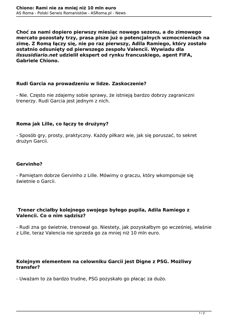 Chiono: Rami nie za mniej niż 10 mln euro AS Roma - Polski Serwis Romanistów - ASRoma.pl - News Choć za nami dopiero pierwszy miesiąc nowego sezonu, a do zimowego mercato pozostały trzy, prasa pisze już o potencjalnych wzmocnieniach na zimę. Z Romą łączy się, nie po raz pierwszy, Adila Ramiego, który zostało ostatnio odsunięty od pierwszego zespołu Valencii. Wywiadu dla ilssusidiario.net udzielił ekspert od rynku francuskiego, agent FIFA, Gabriele Chiono. Rudi Garcia na prowadzeniu w lidze. Zaskoczenie? - Nie. Często nie zdajemy sobie sprawy, że istnieją bardzo dobrzy zagraniczni trenerzy. Rudi Garcia jest jednym z nich. Roma jak Lille, co łączy te drużyny? - Sposób gry, prosty, praktyczny. Każdy piłkarz wie, jak się poruszać, to sekret drużyn Garcii. Gervinho? - Pamiętam dobrze Gervinho z Lille. Mówimy o graczu, który wkomponuje się świetnie o Garcii. Trener chciałby kolejnego swojego byłego pupila, Adila Ramiego z Valencii. Co o nim sądzisz? - Rudi zna go świetnie, trenował go. Niestety, jak pozyskałbym go wcześniej, właśnie z Lille, teraz Valencia nie sprzeda go za mniej niż 10 mln euro. Kolejnym elementem na celowniku Garcii jest Digne z PSG. Możliwy transfer? - Uważam to za bardzo trudne, PSG pozyskało go płacąc za dużo. 1/2 Chiono: Rami nie za mniej niż 10 mln euro AS Roma - Polski Serwis Romanistów - ASRoma.pl - News Mógłby przyjść na wypożyczenie? - Nie gra zbyt dużo, to prawda, jednak nie sądzę, że PSG chce go oddać na wypożyczenie do Włoch, najwyżej do Ligue 1. Autor: abruzzi 2/2 Powered by TCPDF (www.tcpdf.org)