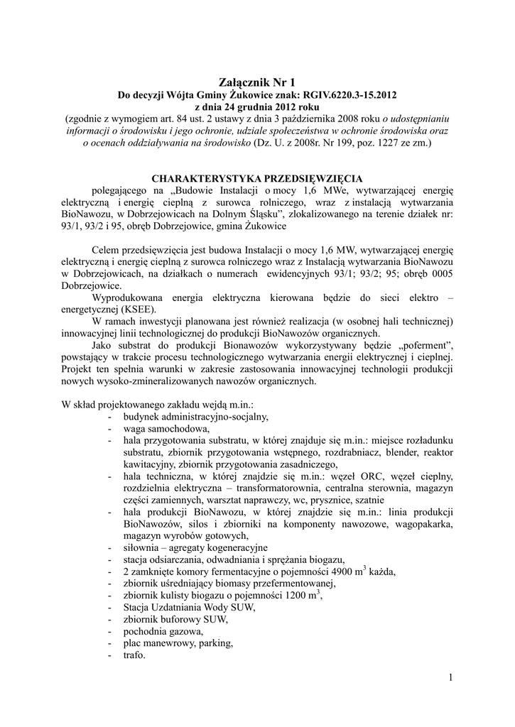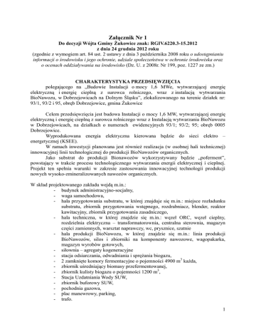 Załącznik Nr 1 Do decyzji Wójta Gminy Żukowice znak: RGIV.6220.3-15.2012 z dnia 24 grudnia 2012 roku (zgodnie z wymogiem art. 84 ust. 2 ustawy z dnia 3 października 2008 roku o udostępnianiu informacji o środowisku i jego ochronie, udziale społeczeństwa w ochronie środowiska oraz o ocenach oddziaływania na środowisko (Dz. U. z 2008r. Nr 199, poz. 1227 ze zm.) CHARAKTERYSTYKA PRZEDSIĘWZIĘCIA polegającego na „Budowie Instalacji o mocy 1,6 MWe, wytwarzającej energię elektryczną i energię cieplną z surowca rolniczego, wraz z instalacją wytwarzania BioNawozu, w Dobrzejowicach na Dolnym Śląsku”, zlokalizowanego na terenie działek nr: 93/1, 93/2 i 95, obręb Dobrzejowice, gmina Żukowice Celem przedsięwzięcia jest budowa Instalacji o mocy 1,6 MW, wytwarzającej energię elektryczną i energię cieplną z surowca rolniczego wraz z Instalacją wytwarzania BioNawozu w Dobrzejowicach, na działkach o numerach ewidencyjnych 93/1; 93/2; 95; obręb 0005 Dobrzejowice. Wyprodukowana energia elektryczna kierowana będzie do sieci elektro – energetycznej (KSEE). W ramach inwestycji planowana jest również realizacja (w osobnej hali technicznej) innowacyjnej linii technologicznej do produkcji BioNawozów organicznych. Jako substrat do produkcji Bionawozów wykorzystywany będzie „poferment”, powstający w trakcie procesu technologicznego wytwarzania energii elektrycznej i cieplnej. Projekt ten spełnia warunki w zakresie zastosowania innowacyjnej technologii produkcji nowych wysoko-zmineralizowanych nawozów organicznych. W skład projektowanego zakładu wejdą m.in.: - budynek administracyjno-socjalny, - waga samochodowa, - hala przygotowania substratu, w której znajduje się m.in.: miejsce rozładunku substratu, zbiornik przygotowania wstępnego, rozdrabniacz, blender, reaktor kawitacyjny, zbiornik przygotowania zasadniczego, - hala techniczna, w której znajdzie się m.in.: węzeł ORC, węzeł cieplny, rozdzielnia elektryczna – transformatorownia, centralna sterownia, magazyn części zamiennych, warsztat naprawczy, wc, prysznice, szatnie - hala produkcji BioNawozu, w której znajdzie się m.in.: linia produkcji BioNawozów, silos i zbiorniki na komponenty nawozowe, wagopakarka, magazyn wyrobów gotowych, - siłownia – agregaty kogeneracyjne - stacja odsiarczania, odwadniania i sprężania biogazu, - 2 zamknięte komory fermentacyjne o pojemności 4900 m3 każda, - zbiornik uśredniający biomasy przefermentowanej, - zbiornik kulisty biogazu o pojemności 1200 m3, - Stacja Uzdatniania Wody SUW, - zbiornik buforowy SUW, - pochodnia gazowa, - plac manewrowy, parking, - trafo. 1 Planowane przedsięwzięcie realizowane będzie na obszarze o pow. ok. 0,9 ha (w tym powierzchnia zabudowy – 0,22 ha), wydzielonym na działkach ewidencyjnych: 93/1, 93/2 i 95, położonych w Obrębie 0005 Dobrzejowice. Realizacja przedsięwzięcia nie będzie związana z koniecznością wycinki drzew. Planuje się jedynie (w ramach osobnego przedsięwzięcia) dosadzenie drzew oraz usypanie wału ziemnego pokrytego trawą o wysokości 2 metrów od strony północnej i północno – zachodniej, na granicy w/w działek i dróg gminnych. Na granicy, wydzielonego ogrodzeniem terenu przedsięwzięcia będą posadzone dodatkowo drzewa oraz niska roślinność krzewiasta (w ramach planowanego przedsięwzięcia). Substraty naturalne (kiszonki roślin energetycznych) dowożone będą sukcesywnie z zewnętrznych placów składowych, położonych w odległości do 10 km. Wykorzystana będzie do tego celu droga dojazdowa, przebiegająca od strony nieuciążliwej dla mieszkańców Dobrzejowic, z kierunku miejscowości Wiekowice, Kromolin oraz nieuciążliwy również dla mieszkańców tej miejscowości dojazd do miejsca planowanej inwestycji z drogi wojewódzkiej Głogów – Bytom Odrzański, z wjazdem na wysokości miejscowości Czerna koło stacji kolejowej Czerna. Realizacja powyższych zapisów będzie możliwa po dokonaniu na koszt inwestora przebudowy dróg służących działalności przedsięwzięcia (w szczególności drogi gminnej nr 100053D i drogi powiatowej nr 1025D) po wcześniejszym uzgodnieniu parametrów dróg oraz zakresu prac z Zarządcami poszczególnych odcinków dróg publicznych. Nie będzie wykorzystywana do transportu droga powiatowa nr 1025D, przebiegająca wewnątrz miejscowości Dobrzejowice. Drogi i parking na terenie przedsięwzięcia będą utwardzone, pokryte asfaltem, kostką oraz wyposażone we wpusty uliczne z systemem Ecodrain. Pozostały obszar będzie obsiany trawą. W trakcie realizacji inwestycji, na terenie budowy zostanie umieszczonych kilka kabin sanitarnych typu TOI - TOI oraz kontenery na ewentualne materiały odpadowe. Materiały te będą gromadzone w sposób bezpieczny dla środowiska, segregowane i przekazywane na bieżąco, zgodnie z ich przeznaczeniem do dalszej przeróbki lub na składowisko odpadów. Proces technologiczny wytwarzania energii elektrycznej, począwszy od momentu wprowadzenia substratów do fermentorów, a skończywszy na produkcji energii elektrycznej i BioNawozu będzie bezodpadowy i bezodorowy. System sterowania będzie umieszczony w budynku technicznym, a Centralna Sterownia dla całego Zakładu Bioenergetycznego będzie umieszczona w Hali Technicznej, zlokalizowanej pomiędzy Halą Przygotowania Substratów, a Halą Produkcji BioNawozów. Kiszonki z roślin energetycznych zakiszane będą w rękawach foliowych, składowanych bezpośrednio u producenta i dostawcy. Stamtąd sukcesywnie będą dowożone do hermetycznej Hali Przygotowania Substratów znajdującej się na terenie zakładu. Blok fermentacyjny będzie składał się z 2 Zamkniętych Zbiorników Fermentacyjnych typu COCCUS, Calix, o konstrukcji pionowej i pojemności 4 900 m3 każdy. W bloku fermentacyjnym będzie powstawał biogaz, jako produkt pośredni fermentacji metanowej substratów roślinnych (głównie buraka energetycznego, kukurydzy, żyta, sorgo cukrowego, 