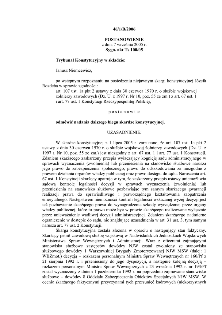46/1/B/2006 POSTANOWIENIE z dnia 7 września 2005 r. Sygn. akt Ts 100/05 Trybunał Konstytucyjny w składzie: Janusz Niemcewicz, po wstępnym rozpoznaniu na posiedzeniu niejawnym skargi konstytucyjnej Józefa Rozdeba w sprawie zgodności: art. 107 ust. 1a pkt 2 ustawy z dnia 30 czerwca 1970 r. o służbie wojskowej żołnierzy zawodowych (Dz. U. z 1997 r. Nr 10, poz. 55 ze zm.) z art. 67 ust. 1 i art. 77 ust. 1 Konstytucji Rzeczypospolitej Polskiej, p o s t a n a w i a: odmówić nadania dalszego biegu skardze konstytucyjnej. UZASADNIENIE: W skardze konstytucyjnej z 1 lipca 2005 r. zarzucono, że art. 107 ust. 1a pkt 2 ustawy z dnia 30 czerwca 1970 r. o służbie wojskowej żołnierzy zawodowych (Dz. U. z 1997 r. Nr 10, poz. 55 ze zm.) jest niezgodny z art. 67 ust. 1 i art. 77 ust. 1 Konstytucji. Zdaniem skarżącego zaskarżony przepis wyłączający kognicję sądu administracyjnego w sprawach wyznaczenia (zwolnienia) lub przeniesienia na stanowisko służbowe narusza jego prawo do zabezpieczenia społecznego, prawo do odszkodowania za niezgodne z prawem działania organów władzy publicznej oraz prawo dostępu do sądu. Naruszenia art. 67 ust. 1 Konstytucji skarżący upatruje w tym, że zaskarżony przepis ustawy uniemożliwia sądową kontrolę legalności decyzji w sprawach wyznaczenia (zwolnienia) lub przeniesienia na stanowisko służbowe pozbawiając tym samym skarżącego gwarancji realizacji prawa do sprawiedliwego i praworządnego kształtowania zaopatrzenia emerytalnego. Następstwem niemożności kontroli legalności wskazanej wyżej decyzji jest też pozbawienie skarżącego prawa do wynagrodzenia szkody wyrządzonej przez organy władzy publicznej, które to prawo może być w prawie skarżącego realizowane wyłącznie przez unieważnienie wadliwej decyzji administracyjnej. Zdaniem skarżącego nadmierne ograniczenie w dostępie do sądu, nie znajdujące uzasadnienia w art. 31 ust. 3, tym samym narusza art. 77 ust. 2 Konstytucji. Skarga konstytucyjna została złożona w oparciu o następujący stan faktyczny. Skarżący pełnił zawodową służbę wojskową w Nadwiślańskich Jednostkach Wojskowych Ministerstwa Spraw Wewnętrznych i Administracji. Wraz z oficerami zajmującymi stanowiska służbowe zastępców dowódcy NJW został zwolniony ze stanowiska służbowego dowódcy 1 Warszawskiej Brygady Zmotoryzowanej NJW MSW (dalej: 1 WBZmot.) decyzją – rozkazem personalnym Ministra Spraw Wewnętrznych nr 160/Pf z 21 sierpnia 1992 r. i przeniesiony do jego dyspozycji, a następnie kolejną decyzją – rozkazem personalnym Ministra Spraw Wewnętrznych z 23 września 1992 r. nr 193/Pf został wyznaczony z dniem 1 października 1992 r. na poprzednio zajmowane stanowisko służbowe – dowódcy 8 Oddziału Zabezpieczenia Obiektów Specjalnych NJW MSW. W ocenie skarżącego faktycznymi przyczynami tych przesunięć kadrowych (niekorzystnych dla niego ze względów finansowych i emerytalnych) były wyłącznie doraźne cele polityczne. Skarżący, będąc jeszcze w czynnej służbie wojskowej, wnosił o unieważnienie ww. krzywdzących go decyzji – rozkazów personalnych i przywrócenie mu uprawnień dowódcy 1 WBZmot. Minister Spraw Wewnętrznych i Administracji odmówił wszczęcia postępowania w sprawie stwierdzenia nieważności ww. decyzji, a następnie utrzymał je w mocy. W ówczesnej sytuacji prawnej i faktycznej (pozostawanie skarżącego w czynnej służbie wojskowej) nie istniały skuteczne możliwości dochodzenia przez niego naruszonych praw. Pojawiły się one z chwilą rozformowania NJW i przejścia skarżącego do rezerwy. Dlatego wystąpił on 30 stycznia 2002 r. do Ministra Spraw Wewnętrznych i Administracji o wynagrodzenie szkody jaka mu została wyrządzona w wyniku bezprawnych działań urzędu MSW oraz o wydanie decyzji ustalającej podstawę wymiaru emerytury do wysokości uposażenia należnego na stanowisku dowódcy 1 WBZmot na dzień zwolnienia skarżącego ze służby wojskowej. We wniosku jako jego przyczynę skarżący wskazał na istnienie w obrocie prawnym wadliwych, krzywdzących go decyzji – rozkazów personalnych. Minister Spraw Wewnętrznych i Administracji decyzją nr 17-402003 z 3 lutego 2003 r. odmówił wszczęcia postępowania w sprawie stwierdzenia nieważności przedmiotowych decyzji – rozkazów personalnych, argumentując to groźbą wystąpienia przesłanki określonej w art. 156 § 1 pkt 3 kodeksu postępowania administracyjnego. Skarżący wniósł o ponowne rozpatrzenie sprawy, kontrargumentując brakiem jej tożsamości, wyrażającym się zmienionym stanem faktycznym oraz zmienionym przedmiotem sprawy. Minister Spraw Wewnętrznych i Administracji utrzymał zaskarżony akt decyzją nr 44-97-2003 z 31 marca 2003 r. Kwestionowane przez skarżącego decyzje – rozkazy personalne wydano pod rządami ustawy z dnia 30 czerwca 1970 r. o służbie wojskowej żołnierzy zawodowych (Dz. U. z 1992 r. Nr 8, poz. 31 ze zm.), która dopuszczała możliwość kontroli sądowej decyzji kadrowych w wojsku. Dlatego też skarżący, mając na uwadze fakt, iż postępowanie prowadzone w ramach nadzoru prowadzi się wg prawa materialnego i procesowego, obowiązującego w dacie wydania decyzji, złożył dnia 16 maja 2003 r. do Naczelnego Sądu Administracyjnego skargę na decyzje MSWiA oraz wniósł o stwierdzenie z przyczyn określonych w art. 156 § 1 pkt 1 i 2 k.p.a. nieważności decyzji – rozkazu personalnego MSW nr 160/Pf z 21 sierpnia 1992 r. i uchylenie podtrzymujących go decyzji Ministra Spraw Wewnętrznych i Administracji. Postanowieniem z 23 września 2003 r. Naczelny Sąd Administracyjny odrzucił skargę skarżącego stwierdzając, iż zgodnie z art. 107 ust. 1a pkt 2 ustawy z 30 czerwca 1970 r. o służbie wojskowej żołnierzy zawodowych skarga do NSA nie może być wniesiona na decyzje w sprawie wyznaczenia (zwolnienia) lub przeniesienia na stanowisko służbowe. Na powyższe postanowienie Naczelnego Sądu Administracyj