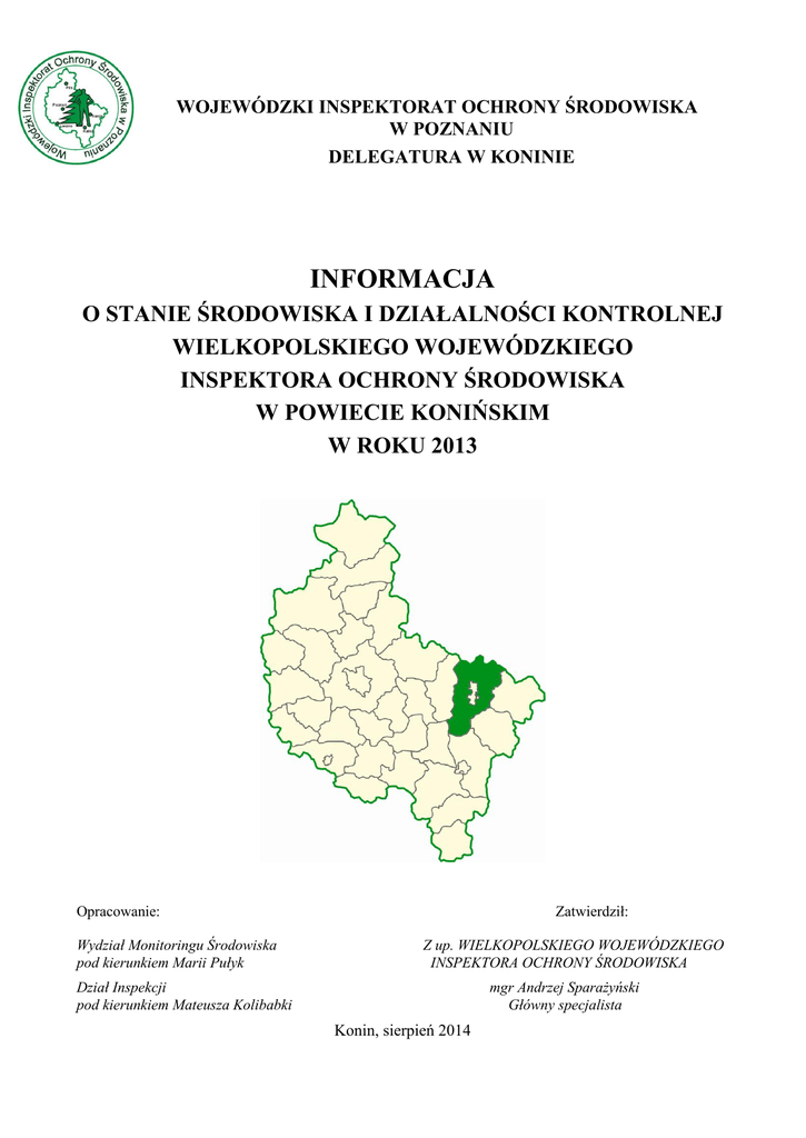 WOJEWÓDZKI INSPEKTORAT OCHRONY ŚRODOWISKA W POZNANIU DELEGATURA W KONINIE INFORMACJA O STANIE ŚRODOWISKA I DZIAŁALNOŚCI KONTROLNEJ WIELKOPOLSKIEGO WOJEWÓDZKIEGO INSPEKTORA OCHRONY ŚRODOWISKA W POWIECIE KONIŃSKIM W ROKU 2013 Zatwierdził: Opracowanie: Wydział Monitoringu Środowiska pod kierunkiem Marii Pułyk Z up. WIELKOPOLSKIEGO WOJEWÓDZKIEGO INSPEKTORA OCHRONY ŚRODOWISKA Dział Inspekcji pod kierunkiem Mateusza Kolibabki mgr Andrzej Sparażyński Główny specjalista Konin, sierpień 2014 2 SPIS TREŚCI 1. WPROWADZENIE ..................................................................................................................... 4 2. WYBRANE CECHY POWIATU ............................................................................................... 5 3. STAN ŚRODOWISKA................................................................................................................ 8 3.1. Monitoring jakości powietrza ................................................................................................ 8 3.2. Monitoring jakości wód......................................................................................................... 9 3.2.1. Monitoring jakości wód powierzchniowych .................................................................. 9 3.2.2. Monitoring jakości wód podziemnych ......................................................................... 17 3.3. Monitoring jakości gleby i ziemi......................................................................................... 18 3.4. Monitoring hałasu................................................................................................................ 18 3.5. Monitoring pól elektromagnetycznych ............................................................................... 19 3.6. Monitoring gospodarki odpadami ....................................................................................... 20 3.7. Podsumowanie i wnioski ..................................................................................................... 23 4. DZIAŁALNOŚĆ KONTROLNA .............................................................................................. 26 5. POWAŻNE AWARIE ............................................................................................................... 28 6. PODSUMOWANIE WYNIKÓW DZIAŁALNOŚCI KONTROLNEJ I POWAŻNYCH AWARII ................................................................................................................................... 28 3 1. WPROWADZENIE Opracowanie ma na celu przedstawienie stanu środowiska oraz wyników działalności kontrolnej Wielkopolskiego Wojewódzkiego Inspektora Ochrony Środowiska na terenie powiatu konińskiego w roku 2013. Do jego przygotowania wykorzystano badania własne WIOŚ w Poznaniu, wyniki badań będące w posiadaniu WIOŚ oraz ustalenia z kontroli użytkowników środowiska, prowadzonych przez inspektorów WIOŚ. Ostateczna ocena stanu środowiska w 2013 roku zostanie opublikowana w IV kwartale 2014 roku w „Raporcie o stanie środowiska w Wielkopolsce w roku 2013” Bieżące informacje dotyczące stanu środowiska na terenie całego wielkopolskiego znaleźć można na stronie internetowej www.poznan.wios.gov.pl. województwa Zadania w zakresie ochrony przyrody, w tym ustanawianie form ochrony przyrody oraz sprawowanie nadzoru nad przestrzeganiem określonych ustawą zakazów w stosunku do tych form, realizuje Regionalny Konserwator Przyrody. 4 2. WYBRANE CECHY POWIATU Powiat koniński ziemski położony jest w południowo-wschodniej części województwa wielkopolskiego, obejmuje obszar o powierzchni 1578 km2, a zamieszkuje go 128698 osób (stan na dzień 31 grudnia 2013 r., dane wg GUS). Według podziału fizyczno-geograficznego J. Kondrackiego powiat ten położony jest: – w makroregionie Pojezierze Wielkopolskie: mezoregiony Pojezierze Gnieźnieńskie, Równina Wrzesińska, Pojezierze Kujawskie oraz – w makroregionie Nizina Południowowielkopolska: mezoregiony Dolina Konińska, Kotlina Kolska, Równina Rychwalska, Wysoczyzna Turecka. Zagospodarowanie przestrzenne powiatu ma charakter rolniczo-przemysłowy. Ponad 70% obszaru stanowią grunty rolne. Administracyjnie powiat podzielony jest na: pięć gmin miejsko-wiejskich: Golina, Kleczew, Rychwał, Sompolno, Ślesin; dziewięć gmin wiejskich: Grodziec, Kazimierz Biskupi, Kramsk, Krzymów, Rzgów, Skulsk, Stare Miasto, Wierzbinek, Wilczyn. Ponad 90,4% ludności powiatu korzysta z sieci wodociągowej, a 32,2% z sieci kanalizacyjnej (dane za 2012 rok wg GUS). W ewidencji WIOŚ w Poznaniu znajduje się 21 komunalnych, mechaniczno-biologicznych oczyszczalni ścieków eksploatowanych na terenie powiatu konińskiego. Dane o ilości ścieków komunalnych pochodzą z Wykazów zawierających zbiorcze zestawienia informacji o zakresie korzystania ze środowiska oraz o wysokości należnych opłat. Lp. Gmina 1. Golina 2. Kazimierz Biskupi Zakład Usług Wodnych w Koninie Oczyszczalnia w Golinie Referat Wodociągów i Kanalizacji Urzędu Gminy w Kazimierzu Biskupim Oczyszczalnia w Kazimierzu Biskupim Gmina Kleczew Oczyszczalnia Jabłonka 3. 4. Zakład/Miejscowość Kleczew 5. 6. Kramsk 7. Krzymów 8. Stare Miasto 9. Rychwał 10. 11. Rzgów 12. Skulsk 13. Sompolno Zakład Gospodarki Komunalnej i Mieszkaniowej Sp. z o.o. w Kleczewie Oczyszczalnia w Kleczewie Zakład Gospodarki Komunalnej i Mieszkaniowej Sp. z o.o. w Kleczewie Oczyszczalnia w Budzisławiu Kościelnym Gminne Przedsiębiorstwo Komunalne w Kramsku Oczyszczalnia Dębicz Zakład Usług Wodnych w Koninie Oczyszczalnia w Brzezińskich Holendrach Zakład Usług Wodnych w Koninie Oczyszczalnia w Modle Królewskiej Przedsiębiorstwo Gospodarki Komunalnej i Mieszkaniowej w Rychwale Oczyszczalnia w Rychwale ul. Żurawin Oczyszczalnia w Rzgowie Gmina Rzgów Oczyszczalnia w Sławsku Zakład Gospodarki Komunalnej w Skulsku Oczyszczalnia w Lisewie Przedsiębiorstwo Usług Komunalnych Sp.