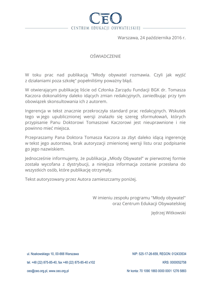 Warszawa, 24 października 2016 r. OŚWIADCZENIE W toku prac nad publikacją "Młody obywatel rozmawia. Czyli jak wyjść z działaniami poza szkołę" popełniliśmy poważny błąd. W otwierającym publikację liście od Członka Zarządu Fundacji BGK dr. Tomasza Kaczora dokonaliśmy daleko idących zmian redakcyjnych, zaniedbując przy tym obowiązek skonsultowania ich z autorem. Ingerencja w tekst znacznie przekroczyła standard prac redakcyjnych. Wskutek tego w jego upublicznionej wersji znalazło się szereg sformułowań, których przypisanie Panu Doktorowi Tomaszowi Kaczorowi jest nieuprawnione i nie powinno mieć miejsca. Przepraszamy Pana Doktora Tomasza Kaczora za zbyt daleko idącą ingerencję w tekst jego autorstwa, brak autoryzacji zmienionej wersji listu oraz podpisanie go jego nazwiskiem. Jednocześnie informujemy, że publikacja „Młody Obywatel” w pierwotnej formie została wycofana z dystrybucji, a niniejsza informacja zostanie przesłana do wszystkich osób, które publikację otrzymały. Tekst autoryzowany przez Autora zamieszczamy poniżej. W imieniu zespołu programu "Młody obywatel" oraz Centrum Edukacji Obywatelskiej Jędrzej Witkowski ul. Noakowskiego 10, 00-666 Warszawa tel. +48 (22) 875-85-40, fax +48 (22) 875-85-40 x102 [email protected], www.ceo.org.pl NIP: 525-17-26-659, REGON: 012433534 KRS: 0000052758 Nr konta: 70 1090 1883 0000 0001 1276 5883 Brniemy sobie przez naszą rzeczywistość. Codziennie, zwykle nie zauważając. A jak już zauważymy, to omijamy jak najszerszym łukiem. Bo przecież mamy problemy czy sprawy do załatwienia: swoje, własne, niecierpiące zwłoki. Nie da rady inaczej… A jednak DA RADĘ! Od kilku już lat uczestnicy programu „Młody Obywatel” – opiekunowie, lecz przede wszystkim młodzież – pokazują jak. Pokazują, jak otworzyć oczy, rozejrzeć się dookoła, jak dostrzec, że wspólne to nie niczyje, lecz nasze, i że nasze to własne. Nasze otoczenie, nasze tradycje, nasza okolica, nasze… Długo by wymieniać. I co najważniejsze, dowodzą, że można coś z tym zrobić. Ja mogę, ty możesz, my możemy. Zebrać się razem, poszukać przyjaciół, wspólników, wsparcia. I zrobić wspólnie coś fajnego, co choćby da satysfakcję, radość robienia, a może zostanie na dłużej. Bo okazuje się, że ludziom też zależy, potrzebują tylko kuksańca, bodźca do działania, przykładu, że można. Współtworząc program „Młody Obywatel” chcieliśmy siłami Fundacji BGK wspierać to otwarcie oczu i otwarcie się. Chcemy, by młodzi ludzie niepostrzeżenie dla siebie poznali, jak dostrzegać tak problemy w najbliższym otoczeniu, jak i okazje, które ono stwarza. By nabyli doświadczeń, jak współpracować z innymi, czasem bardzo różnymi od siebie ludźmi. Pragniemy dać im okazję, by nauczyć się jak działać skutecznie, wyznaczać cele, planować ich osiągnięcie, realizować plany oraz ocenić ich realizację. By zacząć coś złożonego i doprowadzić do końca. To przyda się później w dorosłym życiu, tak prywatnym, jak i społecznym, publicznym. Powodzenia!!! dr Tomasz Kaczor członek Zarządu Fundacji BGK Główny Ekonomista Banku Gospodarstwa Krajowego ul. Noakowskiego 10, 00-666 Warszawa tel. +48 (22) 875-85-40, fax +48 (22) 875-85-40 x102 [email protected], www.ceo.org.pl NIP: 525-17-26-659, REGON: 012433534 KRS: 0000052758 Nr konta: 70 1090 1883 0000 0001 1276 5883