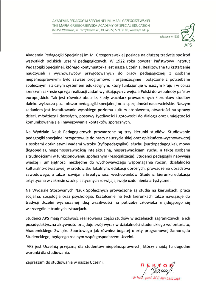 Akademia Pedagogiki Specjalnej im M. Grzegorzewskiej posiada najdłuższą tradycję spośród wszystkich polskich uczelni pedagogicznych. W 1922 roku powstał Paostwowy Instytut Pedagogiki Specjalnej, którego kontynuatorką jest nasza Uczelnia. Realizowane tu kształcenie nauczycieli i wychowawców przygotowanych do pracy pedagogicznej z osobami niepełnosprawnymi było zawsze programowo i organizacyjnie połączone z potrzebami społecznymi i z całym systemem edukacyjnym, który funkcjonuje w naszym kraju i w coraz szerszym zakresie sprzyja realizacji zadao wynikających z wejścia Polski do wspólnoty paostw europejskich. Tak jest również obecnie, kiedy wachlarz prowadzonych kierunków studiów daleko wykracza poza obszar pedagogiki specjalnej oraz specjalności nauczycielskie. Naszym zadaniem jest kształtowanie wysokiego poziomu kultury absolwenta, otwartości na sprawy dzieci, młodzieży i dorosłych, postawy życzliwości i gotowości do dialogu oraz umiejętności komunikowania się i nawiązywania kontaktów społecznych. Na Wydziale Nauk Pedagogicznych prowadzone są trzy kierunki studiów. Studiowanie pedagogiki specjalnej przygotowuje do pracy nauczycielskiej oraz opiekuoczo-wychowawczej z osobami dotkniętymi wadami wzroku (tyflopedagogika), słuchu (surdopedagogika), mowy (logopedia), niepełnosprawnością intelektualną, niesprawnościami ruchu, a także osobami z trudnościami w funkcjonowaniu społecznym (resocjalizacja). Studenci pedagogiki nabywają wiedzę i umiejętności niezbędne do wychowawczego wspomagania rodzin, działalności kulturalno-oświatowej w środowisku lokalnym, edukacji dorosłych, prowadzenia doradztwa zawodowego, a także rozwijania kreatywności wychowanków. Studenci kierunku edukacja artystyczna w zakresie sztuk plastycznych rozwijają swoje uzdolnienia artystyczne. Na Wydziale Stosowanych Nauk Społecznych prowadzone są studia na kierunkach: praca socjalna, socjologia oraz psychologia. Kształcenie na tych kierunkach także nawiązuje do tradycji Uczelni wyznaczanej ideą wrażliwości na potrzeby człowieka znajdującego się w szczególnie trudnych sytuacjach. Studenci APS mają możliwośd realizowania części studiów w uczelniach zagranicznych, a ich pozadydaktyczna aktywnośd znajduje swój wyraz w działalności studenckiego wolontariatu, Akademickiego Związku Sportowego jak również bogatej oferty programowej Samorządu Studenckiego, będącego realnym współgospodarzem Uczelni. APS jest Uczelnią przyjazną dla studentów niepełnosprawnych, którzy znajdą tu dogodne warunki dla studiowania. Zapraszam do studiowania w naszej Uczelni.