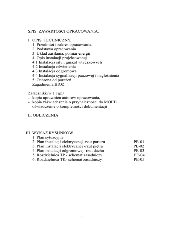 SPIS ZAWARTOŚCI OPRACOWANIA. I. OPIS TECHNICZNY. 1. Przedmiot i zakres opracowania. 2. Podstawa opracowania. 3. Układ zasilania, pomiar energii 4. Opis instalacji projektowanej 4.1 Instalacja siły i gniazd wtyczkowych 4.2 Instalacja oświetlenia 4.3 Instalacja odgromowa 4.4 Instalacja sygnalizacji pauzowej i nagłośnienia 5. Ochrona od porażeń Zagadnienia BIOZ Załączniki:/w 1 egz./ – kopia uprawnień autorów opracowania, – kopia zaświadczenia o przynależności do MOIIB – oświadczenie o kompletności dokumentacji II. OBLICZENIA III. WYKAZ RYSUNKÓW. 1. Plan sytuacyjny 2. Plan instalacji elektrycznej -rzut parteru 3. Plan instalacji elektrycznej -rzut piętra 4. Plan instalacji odgromowej -rzut dachu 5. Rozdzielnica TP - schemat zasadniczy 6. Rozdzielnica TK- schemat zasadniczy 1 PE-01 PE-02 PE-03 PE-04 PE-05 I. OPIS TECHNICZNY. 1. Przedmiot i zakres opracowania. Przedmiotem opracowania jest projekt wewnętrznej instalacji elektrycznej dla projektowanej rozbudowy Zespołu Szkół Technicznych w Kolnie przy ul. Teofila Kubraka dz. Nr 1417.. Zakres opracowania obejmuje wewnętrzną instalację siły, oświetlenia, gniazd wtyczkowych, sygnalizacji pauzowej oraz instalację odgromową. Projekt związany z rozbudową obejmujący przebudowę kolidującej sieci enn został ujęty w oddzielnym opracowaniu i stanowi integralną częśc dokumentacji elektrycznej. 2. Podstawa opracowania. Projekt sporządzono w oparciu o następujące dane: - zlecenie Inwestora – Zespół Szkół Technicznych w Kolnie, - warunki techniczne zasilania opracowane przez Zakład Sieci- Łomża , - inwentaryzacja obiektu dla potrzeb niniejszego opracowania, - ustalenia oraz wytyczne opracowane przez Inwestora, - aktualna mapa dla celów projektowych, - projekty branżowe w zakresie architektury i instalacji sanitarnych, uzgodnienia międzybranżowe, - materiały informacyjne producentów zastosowanego osprzętu, - obowiązujące przepisy oraz informacje zawarte w normach. 3. Układ zasilania. Instalacja pomieszczeń objętych niniejszym opracowaniem zasilana będzie z projektowanej rozdzielnicy TP zlokalizowanej w pobliżu wejścia głównego na poziomie przyziemia. Linia zasilajaca rozdzielnicę TP wyprowadzona będzie zalicznikowo z rozdzielnicy głównej RGNN -”Warsztaty”. Realizację postanowień warunków technicznych zasilania wynikających ze wzrostu przydziału mocy określa umowa podpisana między Inwestorem a ZEB Dystrybucja Sp. z o.o. -Zakład Sieci Łomża. Sieć zasilająca energetyki pracuje w układzie TN-C. Instalacja wewnętrzna wykonana będzie w układzie sieci TN-S. 2 4. Opis instalacji. Zasilanie rozdzielnicy TP wykonane będzie kablem typu YKY 4x35mm2 wyprowadzonym z rozdzielnicy głównej „Warsztaty”. Dla wyprowadzenia linii w rozdzielnicy RGNN należy zabudowac rozłącznik bezpiecznikowy typu LTS-160/00 [Moeller] z wkładkami gG63A. Kabel układany będzie wewnątrz budynku oraz częściowo w ziemi, wg trasy przedstawionej na planie sytuacyjnym. W budynku kabel prowadzony będzie po ścianach na uchwytach odstępowych. Kabel w ziemi układac na głębokości 0.7m. Zasady układania kabli w ziemi określają szczegółowe warunki wykonania i odbioru robót elektrycznych oraz przedmiotowe normy. W rozdzielnicy należy wykonac rozdział przewodu PEN a punkt rozdziału uziemic przez połączenie z uziomem instalacji odgromowej. Dla sali komputerowej przewidziano wydzieloną rozdzielnicę TK z której zasilane będą obwody komputerowe. Projektowana instalacja wewnętrzna wykonana będzie w układzie sieci TN-S przewodami miedzianymi układanymi pod tynkiem. Projektowana instalacja sygnalizacji pauzowej nawiązywać będzie do instalacji w budynku istniejącym szkoły. 4.1 INSTALACJA SIŁY I GNIAZD WTYCZKOWYCH. Instalacja siły obejmuje zasilanie obrabiarek, urządzeń wentylacji mechanicznej oraz windy dla niepełnosprawnych. Instalacja wykonana będzie przewodami miedzianymi pod tynkiem. Urządzenia wentylacji obejmują wentylatory dachowe sterowane wyłącznikami typu M612 zlokalizowanymi w pomieszczeniach objętych wentylacją. Obrabiarki numeryczne zasilane będą poprzez gniazda 16A/400V w obudowie z rozłącznikiem. Zasilanie windy osobowej należy wykonac w oparciu o wytyczne zawarte w DTR dostawcy urządzenia. Przedstawione w projekcie zasilanie oparto na wytycznych firmy RadoN s.c. dla windy typu VIP 11. Instalacja gniazd wtyczkowych typu DATA w pomieszczeniach serwera, obrabiarek numerycznych oraz sali komputerowej zasilana będzie z wydzielonej tablicy TK zlokalizowanej w pomieszczeniu serwera. Instalację do gniazd komputerowych należy prowadzic w kanale instalacyjnym z przegrodą dla separacji sieci logicznej. Instalacja gniazd wtyczkowych DATA oraz ogólnego przeznaczenia wykonana będzie przewodami YDY 3x2.5mm2 układanymi pod tynkiem. Obwody gniazd zasilane będą poprzez wyłączniki różnicowo-prądowe dI=0.03A o działaniu bezpośrednim. 3 W instalacji należy stosować wyłącznie gniazda wyposażone w kołki uziemiające dla podłączenia żył ochronnych przewodów zasilających. 4.2 INSTALACJA OŚWIETLENIA. Instalacja oświetlenia wykonana będzie przewodami YDY 1.5 układanymi pod tynkiem. Do oświetlenia podstawowego przewidziano oprawy świetlówkowe 2x36W montowane bezpośrednio do sufitu. W pomieszczeniach sanitarnych projektuje się oprawy typu plafoniera z kompaktowym żródłem światła. Wydzielone oprawy w ciągach komunikacyjnych wyposażone będą w inwertery 3h dla oświetlenia drogi ewakuacyjnej. Oprawy oświetlenia awaryjnego załączane będą samoczynnie po zaniku napięcia w sieci zasilania podstawowego. Dla pomieszczeń sanitarnych przewidziano oprawy i osprzęt min IP44. Rozmieszczenie opraw, typy i ilość przedstawiono na planach instalacji. 4.3 INSTALACJA ODGROMOWA Dla projektowanego budynku przewidziano instalację odgromową nawiązującą poprzez łącznik do części istniejącej budynków szkoły. W instalacji projektuje s