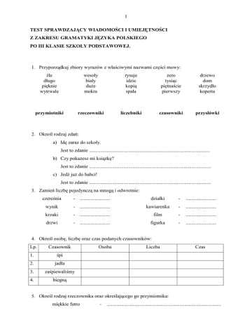 1 TEST SPRAWDZAJĄCY WIADOMOŚCI I UMIEJĘTNOŚCI Z ZAKRESU GRAMATYKI JĘZYKA POLSKIEGO PO III KLASIE SZKOŁY PODSTAWOWEJ. 1. Przyporządkuj zbiory wyrazów z właściwymi nazwami części mowy: źle długo pięknie wytrwale wesoły biały duże mokra rysuje idzie kopią spała zero tysiąc piętnaście pierwszy drzewo dom skrzydło koperta przymiotniki rzeczowniki liczebniki czasowniki przysłówki 2. Określ rodzaj zdań: a) Idę zaraz do szkoły. Jest to zdanie ............................................................................................... b) Czy pokażesz mi książkę? Jest to zdanie ................................................................................................ c) Jedź już do babci! Jest to zdanie ................................................................................................ 3. Zamień liczbę pojedynczą na mnogą i odwrotnie: czereśnia - ........................ działki - ........................ wynik - ........................ kawiarenka - ........................ krzaki - ........................ film - ........................ drzwi - ........................ figurka - ........................ 4. Określ osobę, liczbę oraz czas podanych czasowników: Lp. Czasownik 1. śpi 2. jadła 3. zaśpiewaliśmy 4. biegną Osoba Liczba Czas 5. Określ rodzaj rzeczownika oraz określającego go przymiotnika: miękkie futro - .......................................................................................... mądra sowa - 2 .......................................................................................... dobry przyjaciel - .......................................................................................... wygodne krzesło - .......................................................................................... wesoła klasa - .......................................................................................... żytnia mąka - .......................................................................................... 6. Zastosuj stopniowanie przymiotników: jasny - ............................................ - ............................................ twardy - ............................................ - ............................................ krótka - ............................................ - ............................................ wolny - ............................................ - ............................................ przyjemne - ............................................ - ............................................ 7. Od podanych: a) przymiotników utwórz przysłówki: zielony - .............................................................................. chudy - .............................................................................. gruby - .............................................................................. głośny - .............................................................................. b) rzeczowników utwórz przymiotniki: czereśnia - kompot.............................................................................. wanilia - jogurt..................................................................................... pomidor - zupa ...................................................................................... komputer - program........................................................................................ 8. Do podanych wyrazów dopisz wyrazy o znaczeniu przeciwnym: smutny - ............................ ciemny - ............................ brzydki - ............................ szybki - ............................ 9. Odmień w czasie teraźniejszym, w liczbie pojedynczej i mnogiej przez osoby czasownik znać: Liczba pojedyncza Liczba mnoga Os.1 ja......................................................... Os.1 my........................................................... Os.2 ty ........................................................ Os.2 wy........................................................... Os.3 on......................................................... Os.3 oni........................................................... Os.3 ona........................................................ Os.3 one........................................................... Os.3 ono......................................................... 10. Poniższe zdania napisz w czasie przeszłym: a) Jacek bawi się piłką. 3 .......................................................................................................................................... b) Dzieci zbierają jagody. .......................................................................................................................................... c) Dzieci spacerują po lesie. .......................................................................................................................................... 11. Rozwiń poniższe zdanie: Kasia bawi się ................................................................................................................. 12. Utwórz rodzinę wyrazów od wyrazów: kot: ............................................................................................................................................. dom ............................................................................................................................................. dziecko........................................................................................................................................ 13. Uzupełnij o liczebniki: Wtorek to (który?) ..............................................................................dzień tygodnia. Rok ma (ile?) ........................................... miesięcy Wrzesień to (który?) ........................................... miesiąc roku. POWODZENIA!