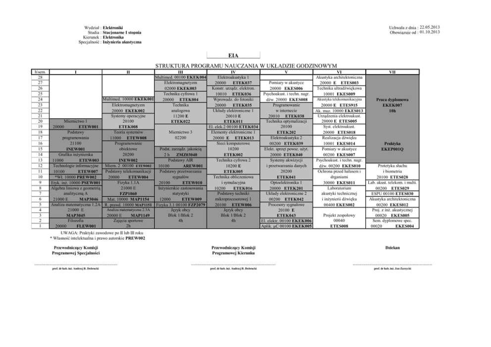 Wydział : Studia : Kierunek : Specjalność : Uchwała z dnia : 22.05.2013 Obowiązuje od : 01.10.2013 Elektroniki Stacjonarne I stopnia Elektronika Inżynieria akustyczna EIA STRUKTURA PROGRAMU NAUCZANIA W UKŁADZIE GODZINOWYM h\sem. 28 27 26 25 24 23 22 21 20 19 18 17 16 15 14 13 12 11 10 9 8 7 6 5 4 3 2 1 I Miernictwo 1 20000 ETEW001 Podstawy programowania 21100 INEW001 Grafika inżynierska 11000 ETEW003 Technologie informacyjne 10100 ETEW007 *Wł. 10000 PREW002 Etyk. inż. 10000 PSEW001 Algebra liniowa z geometrią analityczną A 21000 E MAP3046 Analiza matematyczna 1.2A 21000 E MAP3045 Filozofia 20000 FLEW001 II III IV V VI Multimed. 00100 EKEK004 Elektroakustyka 1 Akustyka architektoniczna Elektromagnetyzm Pomiary w akustyce 20000 ETEK037 20000 E ETES003 Konstr. urządz. elektron. Technika ultradźwiękowa 02000 EKEK003 20000 EKES006 Technika cyfrowa 1 Psychoakust. i techn. nagr. 10010 ETEK036 10001 EKES009 Multimed. 10000 EKEK001 Akustyka telekomunikacyjna Wprowadz. do fotoniki 20000 ETEK004 dźw. 20000 EKES008 Elektromagnetyzm Technika Programowanie 20000 ETEK035 20000 E ETES915 analogowa Układy elektroniczne 1 w internecie 20000 EKEK002 Ak. muz. 10000 EKES013 Systemy operacyjne Urządzenia elektroakust. 11200 E 20010 E 20010 ETEK038 20100 Technika optymalizacji 20000 E ETES005 ETEK022 ETEK011 20100 Syst. elektroakust. ETEK008 El. elek.2 00100 ETEK034 Teoria systemów Miernictwo 3 Elementy elektroniczne 1 ETEK202 20000 ETES018 02200 Elektroakustyka 2 Realizacja dźwięku 11000 ETEW008 20000 E ETEK013 Programowanie Sieci komputerowe 00200 ETEK039 10001 EKES014 obiektowe Podst. zarządz. jakością 10200 Elekt. sprzęt powsz. użyt. Pomiary w akustyce 20200 2h ZMZ03040 ETEK002 20000 ETEK040 00200 EKES007 Podstawy AIR Technika cyfrowa 2 Systemy akwizycji Psychoakust. i techn. nagr. INEW002 Miern. 2 00100 ETEW002 i przetwarzania danych 10100 AREW001 10200 E dźw. 00200 EKES010 Podstawy telekomunikacji Podstawy przetwarzania 20200 Ochrona przed hałasem i ETEK005 sygnałów Technika obliczeniowa drganiami 20000 ETEW004 ETEK041 Fizyka 1.1A i symulacyjna Optoelektronika 1 20100 ETEW010 30000 EKES011 Laboratorium 21000 E Inżynierskie zastosowania 10200 ETEK016 20000 ETEK201 statystyki Podstawy techniki Układy elektroniczne 2 akustyki technicznej FZP1060 mikroprocesorowej 1 i inżynierii dźwięku Mat. 10000 MAP1154 12000 ETEW009 00200 ETEK042 Procesory sygnałowe R. prawd. 10000 MAP1151 Fizyka 3.1 00100 FZP2079 20100 ETEW006 00400 EKES002 Analiza matematyczna 2.3A Język obcy Język obcy 20100 E Blok 1/Blok 2 Blok 1/Blok 2 Projekt zespołowy 20000 E MAP1149 ETEK043 Zajęcia sportowe 4h 4h 00040 El. elektr. 00100 EKEK006 2h Aplik. µC 00100 EKEK005 ETES008 VII Praca dyplomowa EKEK007 10h Praktyka EKEP001Q Protetyka słuchu i biometria 20100 ETES028 Lab. akust. telekom. i multi. 00200 ETES029 ESPU 00100 ETES030 Akustyka architektoniczna 00200 EKES012 Proj. z inż. akustycznej 00020 EKES005 Sem. dyplomowe spec. 00020 EKES004 UWAGA: Praktyki zawodowe po II lub III roku * Własność intelektualna i prawo autorskie PREW002 Przewodniczący Komisji Programowej Specjalności Przewodniczący Komisji Programowej Kierunku Dziekan .................................................................. ................................................................... ............................................................... prof. dr hab. inż. Andrzej B. Dobrucki prof. dr hab. inż. Andrzej B. Dobrucki prof. dr hab. inż. Jan Zarzycki Wydział : Studia : Kierunek : Specjalność : Uchwała z dnia : 22.05.2013 Obowiązuje od : 01.10.2013 Elektroniki Stacjonarne I stopnia Elektronika Inżynieria akustyczna EIA STRUKTURA PROGRAMU NAUCZANIA W UKŁADZIE PUNKTOWYM ECTS\ sem. 30 29 28 27 26 25 24 23 22 21 20 19 18 17 16 15 14 13 12 11 10 9 8 7 6 5 4 3 2 1 I Miernictwo 1 4 Podstawy programowania 5 Grafika inżynierska 4 Technologie informacyjne 2 Włas. intelekt. i praw. aut. 1 Etyka inżynierska 1 Algebra liniowa z geometrią analityczną A 4 Analiza matematyczna 1.2A 8 Filozofia 1 II III IV V VI Multimedia 1 Elektromagnetyzm 1 Systemy operacyjne 2 Teoria systemów 3 Multimedia 1 Elektroakustyka 1 2 Konstrukcjia urządzeń elektronicznych 2 Wprowadzenie do fotoniki 2 Układy elektroniczne 1 3 Elem. elektron. 2 1 Elementy elektroniczne 1 3 Sieci komputerowe 3 Pomiary w akustyce 2 Psychoakustyka i techn. nagr. dźw. 2 Programowanie w internecie 4 Akustyka architektoniczna 3 Technika ultradźwiękowa 2 Akustyka telekomunikacyjna 2 Realizacja dźwięku 2 Urządzenia elektroakustyczne 2 Systemy elektroakust. 2 Akustyka muzyczna 2 Ochrona przed hałasem i drganiami 3 Laboratorium akustyki technicznej i inżynierii dźwięku 4 Pomiary w akustyce 2 Psychoakustyka i techn. nagr. dźw. 2 Technika analogowa 1 4 Programowanie obiektowe 6 Miernictwo 2 2 Podstawy telekomunikacji 2 Miernictwo 3 2 Podstawy zarządzania jakością 2 Podstawy AIR 2 Podstawy przetwarzania sygnałów 5 Fizyka 1.1A 5 Matematyka 1 Rach. prawdopod. 1 Analiza matematyczna 2.3A 5 Zajęcia sportowe Elektromagnetyzm 3 Technika cyfrowa 1 2 1 Inżynierskie zastosowania statystyki 5 Fizyka 3.1 2 Język obcy Blok 1/Blok 2 2 Technika cyfrowa 2 4 Technika obliczeniowa i symulacyjna 4 Podstawy techniki mikroprocesorowej 1 3 Język obcy Blok 1/Blok 2 3 Technika optymalizacji 3 Elektroakustyka 2 2 Elektroniczny sprzęt powsz. użytku 2 Systemy akwizycji i przetwarzania danych 4 Optoelektronika 1 3 Układy elektroniczne 2 2 Procesory sygnałowe 3 Aplikacje µC 2 El. elektroniczne 3 1 VII Projekt zespołowy 4 Praca dyplomowa 10 Praktyka 6 Projekt z inżynierii akustycznej 3 Lab. akust. telekom. i multimed. 2 ESPU 1 Protetyka słuchu i biometria 4 Akustyka architekton. 2 Seminarium dyplomowe specjalnościowe 2 Przewodniczący Komisji Programowej Specjalności Przewodniczący Komisji Programowej Kierunku Dziekan .................................................................. ................................................................... ...........