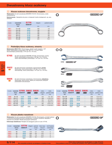 Dwustronny klucz oczkowy Klucze oczkowe dwustronne, wygięte Wykonanie: Ze stali wanadowej GEDORE 31CrV3. Chromowany, oczka cienkościenne. Zastosowanie: Specjalnie do prac w miejscach trudno dostępnych, np. przy silnikach. nr zam. 5776 rozwartość klucza mm 0011 0012 0013 0014 0015 0016 0019 11 x 13 13 x 15 13 x 17 14 x 17 15 x 17 16 x 18 19 x 22 długość grubość oczka mm mm 150 185 185 185 185 185 230 7,0 8,5 8,5 8,5 8,5 8,5 10,0 16,94 20,02 21,42 21,42 21,42 25,80 27,00 (522) Podwójny klucz oczkowy, otwarty Wykonanie: DIN 3118. Chromowany, główki oczek wygięte o 15°. Otwór sześciokątny przesunięty o 30° (do 12 x 14 mm), otwór dwunastokątny przesunięty o 15° (od 13 x 15 mm). 5765 Ze stali wanadowej GEDORE 31CrV3, chromowany, prosty. Otwór sześciokątny przesunięty o 30° (do 12 x 14 mm), otwór dwunastokątny przesunięty o 15° (od 13 x 15 mm). 5 Narzędzia ręczne 5765 5802 P Q Ze stali chromowo-wanadowej, chromowanej, proste. Sześciokąt, otwór przesunięty o 30° (do 12 x 14 mm), dwunastokąt, otwór przesunięty o 15° (od 13 x 15 mm). 5802 5805 P Q Ze stali chromowo-wanadowej, chromowanej, odsadzony. Sześciokąt, otwór prosty. Idealny do skręcanych połączeń przewodów hamulcowych. 5805 nr zam. rozwartość klucza mm 0008 0010 0011 0012 0013 0014 8 x 10 10 x 11 11 x 13 12 x 14 13 x 15* 14 x 17 5765 5802 5805 14,26 15,41 15,71 16,02 17,49 17,49 16,65 16,65 18,20 18,20 18,20 – – 33,60 – – – – (522) (529) (529) maks. długość mm maks. grubość oczka mm nr zam. rozwartość klucza mm 140 168 160 170 182 195 7,0/ 8,0 11,0/11,0 8,7/10,5 9,5/11,2 10,5/11,8 11,2/12,2 0016 0017 0019 0022 0024 0030 16 x 18* 17 x 19 19 x 22 22 x 24 24 x 27 30 x 32 5765 5802 5805 – 19,62 23,62 26,50 32,50 42,50 23,00 23,25 27,35 – 39,60 51,10 – – – – – – (522) (529) (529) maks. długość mm maks. grubość oczka mm 208 210 230 250 270 300 12,0/13,2 12,2/13,2 13,8/15,8 15,2/16,2 16,2/18,0 21,0/23,0 * Wielkość nienormowana. Klucze płasko-nasadowe Wykonanie: Ze stali wanadowej GEDORE 31CrV3. Chromowany, smukła budowa z ruchomą końcówką do kluczy nasadowych i profilem UnitDrive. Nasadka z otworem do pokrętła. Główki precyzyjnie szlifowane. Informacje dodatkowe: Pokrętło do dociągania patrz (nr zam. 5716). nr zam. rozwartość klucza mm 0010 0013 0017 0019 10 13 17 19 5779 16,56 18,40 22,00 24,51 długość grubość szczęk mm mm 179 208 255 283 4,7 6,0 7,5 8,0 klucz nasadowy ∅ zewn. mm do ∅ trzpienia obrotowego mm 15,5 19,2 24,2 26,7 5 5 8 8 (522) 5/114 Nie wszystkie artykuły są dostępne w każdym kraju. Stałe stany magazynowe są dostępne w ciągu 48 godz. Ceny podane w euro za 1 sztukę bez podatku VAT (jeśli nie podano inaczej).