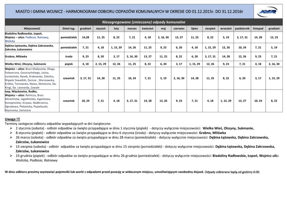 MIASTO I GMINA WOJNICZ - HARMONOGRAM ODBIORU ODPADÓW KOMUNALNYCH W OKRESIE OD 01.12.2015r. DO 31.12.2016r Niesegregowane (zmieszane) odpady komunalne Miejscowość Dzień tyg. grudzień styczeń luty marzec kwiecień maj czerwiec lipiec sierpień wrzesień październik listopad grudzień poniedziałek 14,28 11, 25 8, 22 7, 21 4, 18 2, 16, 30 13, 27 11, 25 8, 22 5, 19 3, 17, 31 14, 28 12, 23 poniedziałek 7, 21 4, 18 1, 15, 29 14, 26 11, 25 9, 23 6, 20 4, 18 1, 15, 29 12, 26 10, 24 7, 21 5, 19 Grabno, Milówka środa 9, 23 8, 20 3, 17 2, 16, 30 13, 27 11, 25 8, 22 6, 20 3, 17, 31 14, 28 12, 26 9, 23 7, 21 Wielka Wieś, Olszyny, Sukmanie piątek 4, 18 2, 15, 29 12, 26 11, 25 8, 22 6, 20 3, 17 1, 15, 29 12, 26 9, 23 7, 21 4, 18 2, 16, 30 czwartek 3, 17, 31 14, 28 11, 25 10, 24 7, 21 5, 19 2, 16, 30 14, 28 11, 25 8, 22 6, 20 3, 17 1, 15, 29 czwartek 10, 24 7, 21 4, 18 3, 17, 31 14, 28 12, 26 9, 23 7, 21 4, 18 1, 15, 29 13, 27 10, 24 8, 22 Biadoliny Radłowskie, Łopoń, Wojnicz – ulice: Podlesie, Ratnawy, Wolicka Dębina Łętowska, Dębina Zakrzowska, Zakrzów, Łukanowice Wojnicz – ulice: Braci Gładyszów, Długa, Folwarczna, Goszczyńskiego, Leśna, Loretańska, Rynek, Krakowska, Szkolna, Wąwóz Szwedzki, Zacisze , Warszawska, Krótka, Tarnowska, Nowa, Słoneczna, Św. Kingi, Św. Leonarda, Zawale Isep, Więckowice, Rudka, Wojnicz – ulice: Rolnicza, Braci Mirochnów, Jagiellońska, Kąpielowa, Konopnickiej, Krzywa, Nadbrzeżna, Ogrodowa, Plebańska, Popiełuszki, Reymonta, Zamoście Uwaga !!! Terminy zastępcze odbioru odpadów wypadających w dni świąteczne: 2 stycznia (sobota) - odbiór odpadów za święto przypadające w dniu 1 stycznia (piątek) - dotyczy wyłącznie miejscowości: Wielka Wieś, Olszyny, Sukmanie, 8 stycznia (piątek) - odbiór odpadów za święto przypadające w dniu 6 stycznia (środa) - dotyczy wyłącznie miejscowości: Grabno, Milówka 26 marca (sobota) - odbiór odpadów za święto przypadające w dniu 28 marca (poniedziałek) - dotyczy wyłącznie miejscowości: Dębina Łętowska, Dębina Zakrzowska, Zakrzów, Łukanowice 13 sierpnia (sobota) - odbiór odpadów za święto przypadające w dniu 15 sierpnia (poniedziałek) - dotyczy wyłącznie miejscowości: Dębina Łętowska, Dębina Zakrzowska, Zakrzów, Łukanowice 23 grudnia (piątek) - odbiór odpadów za święto przypadające w dniu 26 grudnia (poniedziałek) - dotyczy wyłącznie miejscowości: Biadoliny Radłowskie, Łopoń, Wojnicz ulic: Wolicka, Podlesie, Ratnawy W dniu odbioru prosimy wystawiać pojemniki lub worki z odpadami przed posesję w widocznym miejscu, umożliwiającym swobodny dojazd. Odpady odbierane będą od godziny 6:00. MIASTO I GMINA WOJNICZ - HARMONOGRAM ODBIORU ODPADÓW KOMUNALNYCH W OKRESIE OD 01.12.2015r. DO 31.12.2016r Selektywnie zbierane odpady komunalne: tworzywa sztuczne, metal, papier, szkło, niebezpieczne Miejscowość Dzień tyg. grudzień styczeń luty marzec kwiecień maj czerwiec lipiec sierpień wrzesień październik listopad grudzień poniedziałek 7 4 1, 29 26 25 23 20 18 15 12 10 7 5 wtorek 8 5 2 1, 29 26 24 21 19 16 13 11 8 6 czwartek 10 7 4 3, 31 28 28 23 21 18 15 13 10 8 wtorek 29 26 23 22 19 17 14 12 9 6 4 2, 29 27 Grabno poniedziałek 21 18 15 14 11 9 6 4 1, 29 26 24 21 19 Milówka czwartek 24 21 18 17 14 12 9 7 4 1, 29 27 24 22 środa 16 13 10 9 6 4 1, 29 27 24 21 19 16 14 czwartek 17 14 11 10 7 5 2, 30 28 25 22 20 17 15 piątek 11 8 5 4 1, 29 27 24 22 19 16 14 14 9 środa 9 8 3 2, 30 27 25 22 20 17 14 12 9 7 wtorek 15 12 9 8 5 2, 31 28 26 23 20 18 15 13 piątek 18 15 12 11 8 6 3 1, 29 26 23 21 18 16 Biadoliny Radłowskie Łopoń Wojnicz – ulice: Wolicka, Podlesie, Ratnawy Dębina Łętowska, Dębina Zakrzowska, Zakrzów Łukanowice Wielka Wieś Olszyny, Sukmanie Wojnicz – ulice: Braci Gładyszów, Długa, Folwarczna, Goszczyńskiego, Krakowska, Leśna, Loretańska, Rynek, Szkolna, Św. Kingi, Wąwóz Szwedzki, Zacisze Wojnicz – ulice: Warszawska, Krótka, Tarnowska, Nowa, Słoneczna, Św. Leonarda, Zawale Wojnicz – ulice: Braci Mirochnów, Jagiellońska, Kąpielowa, Konopnickiej, Krzywa, Nadbrzeżna, Ogrodowa, Plebańska, Popiełuszki, Reymonta, Rolnicza, Zamoście Isep, Więckowice, Rudka Uwaga !!! Terminy zastępcze odbioru odpadów wypadających w dni świąteczne: 8 stycznia (piątek) - odbiór odpadów za święto przypadające w dniu 6 stycznia (środa) - dotyczy wyłącznie miejscowości: Wojnicz ulic: Warszawska, Krótka, Tarnowska, Nowa, Słoneczna, Zawale, Św. Leonarda 26 marca (sobota) - odbiór odpadów za święto przypadające w dniu 28 marca (poniedziałek) - dotyczy wyłącznie miejscowości: Biadoliny Radłowskie, 2 maja (poniedziałek – odbiór odpadów za święto przypadające w dniu 3 maja (wtorek) – dotyczy wyłącznie miejscowości: Wojnicz ulic: Rolnicza, Braci Mirochnów, Jagiellońska, Kąpielowa, Konopnickiej, Krzywa, Nadbrzeżna, Ogrodowa, Plebańska, Popiełuszki, Reymonta, Zamoście, 28 maja (sobota) – odbiór odpadów za święto przypadające w dniu 26 maja (czwartek) – dotyczy miejscowości: Dębina Łętowska, Dębina Zakrzewska, Zakrzów, 2 listopada (środa) - odbiór odpadów za święto przypadające w dniu 1 listopada (wtorek) - dotyczy wyłącznie miejscowości: Łukanowice, 14 listopada (poniedziałek) - odbiór odpadów za święto przypadające w dniu 11 listopada (piątek) - dotyczy wyłącznie miejscowości: Wojnicz ulic: Św. Kingi, Braci Gładyszów, Długa, Folwarczna, Goszczyńskiego, Leśna, Loretańska, Rynek, Krakowska, Szkolna, Wąwóz Szwedzki, Zacisze W dniu odbioru prosimy wystawiać pojemniki lub worki z odpadami przed posesję w widocznym miejscu, umożliwiającym swobodny dojazd. Odpady odbierane będą od godziny 6:00. MIASTO I GMINA WOJNICZ - HARMONOGRAM ODBIORU ODPADÓW KOMUNALNYCH W OKRESIE OD 01.12.2015r. DO 31.12.2016r Odpady zielone Miejscowość Biadoliny Radłowskie, Łopoń, Wojnicz – ulice: Podlesie, Ratnawy, Wolicka Dębina Łętowska, Dębina Zakrzowsk