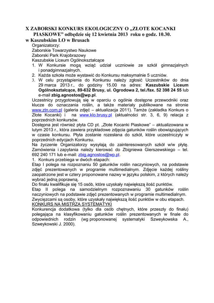 X ZABORSKI KONKURS EKOLOGICZNY O „ZŁOTE KOCANKI PIASKOWE” odbędzie się 12 kwietnia 2013 roku o godz. 10.30. w Kaszubskim LO w Brusach Organizatorzy: Zaborskie Towarzystwo Naukowe Zaborski Park Krajobrazowy Kaszubskie Liceum Ogólnokształcące 1. W Konkursie mogą wziąć udział uczniowie ze szkół gimnazjalnych i ponadgimnazjalnych. 2. Każda szkoła może wystawić do Konkursu maksymalnie 5 uczniów. 3. W celu przystąpienia do Konkursu należy zgłosić Uczestników do dnia 29 marca 2013 r., do godziny 15.00 na adres: Kaszubskie Liceum Ogólnokształcące, 89-632 Brusy, ul. Ogrodowa 2, tel./fax. 52 398 24 55 lub e-mail [email protected]. Uczestnicy przygotowują się w oparciu o ogólnie dostępne przewodniki oraz klucze do oznaczania roślin, a także materiały publikowane na stronie www.ztn.com.pl (galeria zdjęć – aktualizacja 2011). Tamże (zakładka Konkurs o Złote Kocanki) i na www.klo.brusy.pl (aktualności str. 3, 6, 9) relacja z poprzednich konkursów. Dostępna jest również płyta CD pt. „Złote Kocanki Piaskowe” – aktualizowana w lutym 2013 r., która zawiera przykładowe zdjęcia gatunków roślin obowiązujących w czasie konkursu. Płyta zostanie rozesłana do szkół, które uczestniczyły w poprzednich edycjach Konkursu. Na życzenie Organizatorzy wysyłają do zainteresowanych szkół w/w płytę. Zamówienia i zapytania należy kierować do Zbigniewa Gierszewskiego – tel. 692 240 171 lub e-mail: [email protected]. 1. Konkurs przebiega w dwóch etapach: Etap I polega na rozpoznaniu 50 gatunków roślin naczyniowych, na podstawie zdjęć prezentowanych w programie multimedialnym. Zdjęcie każdej rośliny zaopatrzone jest w cztery proponowane nazwy w języku polskim, z których należy wybrać jedną poprawną. Do finału kwalifikuje się 15 osób, które uzyskały największą ilość punktów. Etap II polega na samodzielnym rozpoznawaniu 30 gatunków roślin naczyniowych na podstawie zdjęć prezentowanych w programie multimedialnym. Zwycięzcami są osoby, które uzyskały największą ilość punktów w obu etapach. KONKURS NA MISTRZA SYSTEMATYKI Konkurencja dodatkowa (tylko dla osób chętnych, które przeszły do finału) polegająca na klasyfikowaniu gatunków roślin prezentowanych w finale do odpowiednich rodzin (wg proponowanej systematyki Szweykowska A., Szweykowski J. 2000).