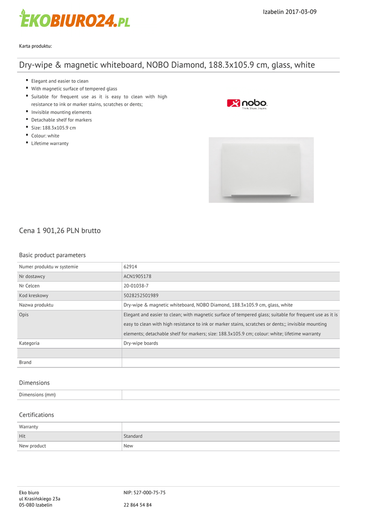 Izabelin 2017-03-09 Karta produktu: Dry-wipe & magnetic whiteboard, NOBO Diamond, 188.3x105.9 cm, glass, white Elegant and easier to clean With magnetic surface of tempered glass Suitable for frequent use as it is easy to clean with high resistance to ink or marker stains, scratches or dents; Invisible mounting elements Detachable shelf for markers Size: 188.3x105.9 cm Colour: white Lifetime warranty Cena 1 901,26 PLN brutto Basic product parameters Numer produktu w systemie 62914 Nr dostawcy ACN1905178 Nr Celcen 20-01038-7 Kod kreskowy 5028252501989 Nazwa produktu Dry-wipe & magnetic whiteboard, NOBO Diamond, 188.3x105.9 cm, glass, white Opis Elegant and easier to clean; with magnetic surface of tempered glass; suitable for frequent use as it is easy to clean with high resistance to ink or marker stains, scratches or dents;; invisible mounting elements; detachable shelf for markers; size: 188.3x105.9 cm; colour: white; lifetime warranty Kategoria Dry-wipe boards Brand Dimensions Dimensions (mm) Certifications Warranty Hit Standard New product New Eko biuro ul Krasińskiego 23a 05-080 Izabelin NIP: 527-000-75-75 22 864 54 84 Izabelin 2017-03-09 Karta katalogowa produktu cd. Dry-wipe & magnetic whiteboard, NOBO Diamond, 188.3x105.9 cm, glass, white Feature Offer from Kind Glass Product Glass board Material Glass Type Dry-wipe & magnetic Procurement vocabulary CPV 30195900-1 Tablice do pisania i tablice magnetyczne Colour Colour White Serdecznie zapraszamy do współpracy Eko biuro zespół. Eko biuro ul Krasińskiego 23a 05-080 Izabelin NIP: 527-000-75-75 22 864 54 84