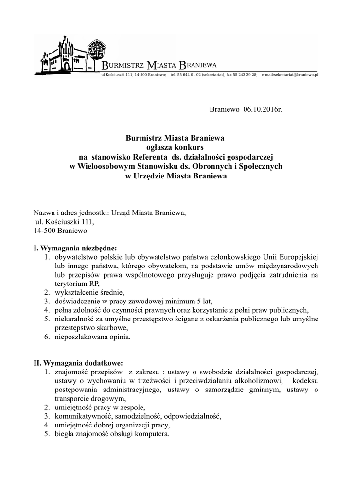 Braniewo 06.10.2016r. Burmistrz Miasta Braniewa ogłasza konkurs na stanowisko Referenta ds. działalności gospodarczej w Wieloosobowym Stanowisku ds. Obronnych i Społecznych w Urzędzie Miasta Braniewa Nazwa i adres jednostki: Urząd Miasta Braniewa, ul. Kościuszki 111, 14-500 Braniewo I. Wymagania niezbędne: 1. obywatelstwo polskie lub obywatelstwo państwa członkowskiego Unii Europejskiej lub innego państwa, którego obywatelom, na podstawie umów międzynarodowych lub przepisów prawa wspólnotowego przysługuje prawo podjęcia zatrudnienia na terytorium RP, 2. wykształcenie średnie, 3. doświadczenie w pracy zawodowej minimum 5 lat, 4. pełna zdolność do czynności prawnych oraz korzystanie z pełni praw publicznych, 5. niekaralność za umyślne przestępstwo ścigane z oskarżenia publicznego lub umyślne przestępstwo skarbowe, 6. nieposzlakowana opinia. II. Wymagania dodatkowe: 1. znajomość przepisów z zakresu : ustawy o swobodzie działalności gospodarczej, ustawy o wychowaniu w trzeźwości i przeciwdziałaniu alkoholizmowi, kodeksu postępowania administracyjnego, ustawy o samorządzie gminnym, ustawy o transporcie drogowym, 2. umiejętność pracy w zespole, 3. komunikatywność, samodzielność, odpowiedzialność, 4. umiejętność dobrej organizacji pracy, 5. biegła znajomość obsługi komputera. III. Zakres zadań wykonywanych na stanowisku: 1) Prowadzenie ewidencji działalności gospodarczej osób fizycznych 2) Przyjmowanie wniosków przedsiębiorców do rejestracji w CEIDG w formie papierowej i elektronicznej. 3) Przekształcanie wniosków przedsiębiorców do CEIDG na formę dokumentu elektronicznego i podpisywanie przekształconych wniosków podpisem elektronicznym (rejestracja przedsiębiorcy, zmiana, zawieszenie, wznowienie, wykreślenie). 4) Weryfikacja wniosków pod względem poprawności, ich korygowanie i przekształcanie. 5) Wydawanie na żądanie przedsiębiorcy wpisów do CEIDG. 6) Wzywanie przedsiębiorców do skorygowania i uzupełniania wniosków. 7) Współpraca z CEIDG w ramach rejestracji przedsiębiorcy w Krajowym Rejestrze Urzędowym podmiotów gospodarki narodowej, ewidencji podatników i płatników NIP, ZUS, KRUS. 8) Wykonywanie zadań z zakresu udzielania licencji na przewozy taksówkowe w zakresie określonym ustawą o transporcie drogowym. 9) Wprowadzanie do CEIDG pełnomocnictw, licencji na taxi. 10) Wykonywanie czynności urzędowo-technicznych polegających za zapewnieniu zainteresowanym dostępu do: - wglądu do Polskiej Klasyfikacji Działalności Gospodarczej, - urzędowych formularzy wniosków wymaganych ustawą. 11) Archiwizacja wniosków elektronicznych i papierowych. 12) Wydawanie zaświadczeń archiwalnych dotyczących prowadzenia działalności gospodarczej. 13) Prowadzenie rejestru podmiotów gospodarczych wykreślonych z ewidencji działalności gospodarczej w Urzędzie obowiązujących do dnia 31.12.2011 r. IV. Informacja o warunkach pracy na stanowisku: 1. praca administracyjno -biurowa, 2. praca wykonywana przy monitorze ekranowym powyżej 4 godzin dziennie, 3. czas pracy : pełen etat, 4. przewidywany termin rozpoczęcia pracy : 01.11.2016r. V. Wymagane dokumenty: 1. życiorys /CV/, 2. list motywacyjny w tym dane kontaktowe: telefon i e-mail, 3. kserokopie dokumentów potwierdzających wykształcenie i posiadane kwalifikacje, 4. kserokopie świadectw pracy i innych dokumentów potwierdzających posiadany staż pracy, 5. oświadczenie kandydata o korzystaniu z pełni praw publicznych oraz o pełnej zdolności do czynności prawnych, 6. oświadczenie o niekaralności za umyślne przestępstwo ścigane z oskarżenia publicznego lub umyślne przestępstwo skarbowe, 7. oświadczenie kandydata o wyrażeniu zgody na przetwarzanie danych osobowych zawartych w ofercie pracy do celów rekrutacji zgodnie z ustawą z dnia 27.08.1997r. o ochronie danych osobowych / t.j. Dz.U. z 2016r. poz. 922/, VI. Informacja o wskaźniku zatrudnienia osób niepełnosprawnych Wskaźnik zatrudnienia osób niepełnosprawnych w Urzędzie Miasta Braniewa w miesiącu poprzedzającym datę upublicznienia ogłoszenia w rozumieniu przepisów o rehabilitacji zawodowej i społecznej oraz zatrudnianiu osób niepełnosprawnych, kształtuje się na poziomie 6 %. Dokumenty należy składać w zamkniętych kopertach z dopiskiem:„ Nabór na stanowisko referenta ds. działalności gospodarczej” w terminie do dnia 17 października 2016r. do godz. 12.00 w Sekretariacie Urzędu Miasta Braniewa I piętro, pok. Nr 16 lub pocztą na adres: Urząd Miasta Braniewa ul. Kościuszki 111 14-500 Braniewo Decyduje data wpływu do Urzędu Miasta Braniewa do godz. 12.00, a nie data stempla pocztowego. Aplikacje, które wpłyną po wyżej określonym terminie nie będą rozpatrywane, a te, które nie będą spełniały wymagań formalnych zawartych w ogłoszeniu zostaną odrzucone. Osoby spełniające wymagania formalne określone w ogłoszeniu zostaną powiadomieni o terminie kolejnego etapu naboru - rozmowie kwalifikacyjnej. Osoby, które nie spełniły wymagań formalnych nie będą informowane. Informacja o wyniku naboru będzie ogłoszona na tablicy ogłoszeń w Urzędzie Miasta Braniewa oraz w Biuletynie Informacji Publicznej Urzędu Miasta Braniewa.