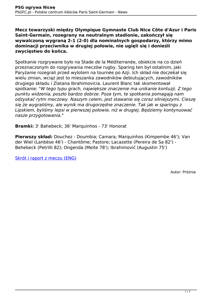 PSG ogrywa Niceę PSGFC.pl - Polskie centrum kibiców Paris Saint-Germain - News Mecz towarzyski między Olympique Gymnaste Club Nice Côte d'Azur i Paris Saint-Germain, rozegrany na neutralnym stadionie, zakończył się wywalczoną wygraną 2-1 (2-0) dla nominalnych gospodarzy, którzy mimo dominacji przeciwnika w drugiej połowie, nie ugięli się i donieśli zwycięstwo do końca. Spotkanie rozgrywane było na Stade de la Méditerranée, obiekcie na co dzień przeznaczonym do rozgrywania meczów rugby. Sparing ten był ostatnim, jaki Paryżanie rozegrali przed wylotem na tournée po Azji. Ich skład nie doczekał się wielu zmian, wciąż jest to mieszanka zawodników debiutujących, zawodników drugiego składu i Zlatana Ibrahimovicia. Laurent Blanc tak skomentował spotkanie: "W tego typu grach, największe znaczenie ma unikanie kontuzji. Z tego punktu widzenia, poszło bardzo dobrze. Poza tym, te spotkania pomagają nam odzyskać rytm meczowy. Naszym celem, jest stawanie się coraz silniejszymi. Cieszę się że wygraliśmy, ale wynik ma drugorzędne znaczenie. Tak jak w sparingu z Lipskiem, byliśmy lepsi w pierwszej połowie, niż w drugiej. Będziemy kontynuować nasze przygotowania." Bramki: 3' Bahebeck; 36' Marquinhos - 73' Honorat Pierwszy skład: Douchez - Doumbia; Camara; Marquinhos (Kimpembe 46'); Van der Wiel (Lanbèse 46') - Chantôme; Pastore; Lacazette (Pereira de Sa 82') Behebeck (Petrilli 82); Ongenda (Meite 78'); Ibrahimović (Augustin 75') Skrót i raport z meczu (ENG) Autor: Próżnia 1/1 Powered by TCPDF (www.tcpdf.org)