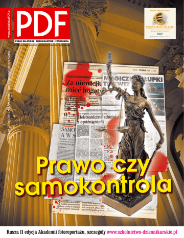 www.redakcjaPDF.pl DODATEK SPECJALNY 02/2010 POLSKA DROGA DO EURO Projekt dofinansowany ze środków Narodowego Banku Polskiego luty nr 2 (24)/2010 • ISSN 1898–3480 • egzemplarz bezpłatny pismo warsztatowe Instytutu Dziennikarstwa Uniwersytetu Warszawskiego Prawo czy samokontrola Rusza II edycja Akademii fotoreportażu, szczegóły www.szkolnictwo-dziennikarskie.pl Ale Na wejściu Żurnalista o dwóch głowach dziennikarstwo numer! staże public relations raport foto euro 04 - Na wejściu: Kodeks karny orężem w walce z wolnością słowa. Kanały tematyczne rosną w siłę. 05 - Puls redakcji: kulisy redakcji dwutygodnika "Cogito". 06-07 Nowelizować czy likwidować? Dyskusje nad przyszłością prawa prasowego. 08 - PR na świecie, to nadal inny public relations niż polski. Różni się. Jak bardzo? 09 - Case study: Kampania Toaleta 2012 wskazuje miejsca, gdzie lepiej niekorzystać z ubikacji. PR produktów farmaceutycznych w autorskiej rubryce Euro RSCG Sensors. 10 - W praktyce: Warsztaty Mediashake sposobem na zdobywanie doświadczenia. Kuba Kalinowski – własny portal zamiast pracy na etat. I - IV: Ile kosztuje ten sam t-shirt w różnych krajach? Kiedy przyjmiemy euro? Karta czy gotówka za granicą? 11 - Polecamy: Kultowa giełda fotograficzna. 12 - Warsztat: fotografia otworkowa. 13 - Kolumna Zygmunta: Co jest piękne? 14 - Kino XXI wieku - 3D czy coś więcej. kultura & społeczeństwo my telewizyjne są prawdziwymi dziennikarzami (celne), dwa, że osobom tym odmawia statusu „dziennikarza-pełną-gębą” (dla nich bolesne). 03 - Na wejściu: Grand Press znów podzielił środowisko. Tym razem z innych powodów. 15-16 Co warto zobaczyć, obejrzeć, posłuchać, przeczytać? Subiektywny (jak w każdej gazecie) przewodnik po świecie muzyki, teatru, filmu i książki. 17 - Miejsce niezwykłe - Lokal użytkowy. 18 - Sport: Judo w wykonaniu studentów... to nie rzadkość. Pilates lekiem na stres. 19 - Książę i żebrak wydarzeń kulturalnych lutego. 20 - Warszawa / Warszawa - wystawa studentów Pracowni Fotografii Prasowej. Zbigniew Żbikowski Profesor Maciej Mrozowski, którego studenccy autorzy publikujący w „PDF” szczególnie sobie upodobali jako eksperta w sprawach, o których piszą (i coś w tym musi być, a co, wiedzą sami studenci), ogłasza na naszych łamach nową kategorię żurnalistów: dziennikarzy-celebrytów. Celne i bolesne trafienie. Raz, że stanowi wkład w dyskusję o tym, czy osoby prowadzące progra- PLUS | 02 | MINUS EKG, głupcze Alicja Bachleda a sprawa polska To plus absolutnie zaległy, który powinien pojawić się dawno temu. Tadeusz Mosz, autor i prowadzący audycję radiową w TOK FM „EKG Ekonomia Kapitał Gospodarka” [ma też autorski program w telewizji – przyp. red.] to mój zdecydowany kandydat do tytułu Dziennikarza Roku. Ekonomia nigdy nie była moją mocną stroną. Na studiach nudziła mnie. Dziś wiem, że dlatego, gdyż nic z niej nie rozumiałam. Dopiero dzięki „EKG” zaczęłam orientować się w gospodarce, a nawet trochę się nią interesować. Wszystko dlatego, że Tadeusz Mosz w swoich codziennych rozmowach z ekspertami udowadnia, że jest to dziedzina, która ma rzeczywisty wpływ na moje i twoje życie. Gani swoich rozmówców, gdy ci używają zbyt eksperckiego języka, albo mówią coś, co mąci w głowach „zwykłym Polakom”. Uwielbiam, gdy poprawia swoich gości, kiedy np. operacje giełdowe nazywają „grą na giełdzie”. Tu Mosz jest niezawodowy. Od razu ripostuje: „grać można na skrzypcach, na giełdzie się inwestuje”. Ale jego prawdziwym konikiem jest walka z szarą strefą. I wcale nie robi tego, przytaczając jakieś hermetyczne dane z Ministerstwa Gospodarki. Radzi po prostu, żeby zawsze brać paragon albo fakturę, bo to gwarancja, że usługodawca uczciwie zapłaci podatek. Dzięki temu będzie na dziury w drogach, lekcje w szkołach i pomoc dla biednych. Banały? Może, ale codziennie powtarzane wchodzą do głowy i nawet czasem można zrobić z nich pożytek. Ostatnio przekonałam się o tym na małej stacji benzynowej, na której nie było nikogo prócz mnie i pracownika stacji. Długo ociągał się, by dać mi paragon za zatankowane paliwo. Dawniej pewnie machnęłabym ręką i pojechała dalej. Ale przypomniało mi się, co mówi Mosz i poprosiłam o ten rachunek. I wiecie? Poczułam się znacznie lepiej. Anita Krajewska Europejski konkurs Do 28 lutego trwa konkurs o Europejską Nagrodę dla Młodych Dziennikarzy 2010 (EYJA). To już trzecia edycja konkursu, w której nagrodzeni zostaną najlepsi młodzi dziennikarze europejscy zajmujący się problematyką rozszerzenia UE. Konkurs skierowany jest do dziennikarzy i studentów dziennikarstwa w wieku 17–35 lat, którzy mają za zadanie przedstawić rozszerzenie Unii Europejskiej w twórczy i prowokujący do myślenia sposób. Zgłaszane teksty prasowe lub publikowane w Internecie oraz materiały radiowe muszą ukazać się pomiędzy 1 października 2007 a 28 lutego 2010. W każdym z 36 krajów uczestniczących w konkursie zwycięzcą zostania jedna osoba. Dodatkowo w maju 2010 roku wszyscy krajowi zwycięzcy EYJA 2010 odwiedzą Europejską Stolicę Kultury 2010 – Stambuł (Turcja). Szczegóły: EUjournalist-award.eu. Termin został ukuty, upubliczniony, nawet spersonifikowany i żyje własnym życiem, przyjmując niezależne od pomysłów autora znaczenia. Daje się zdefiniować na dwa sposoby. Ponieważ nie ma w nazwie przymiotnika, oba rzeczowniki można traktować równoważnie. Albo więc to taki celebryta, który pozwala nazywać się redaktorem, albo dziennikarz, który zamiast wykonywać swój zawód, głównie „bywa”: zaprasza i jest zapraszany, w dodatku (a właściwie przede wszystkim) na oczach milionów. W jednym i w drugim przypadku chodzi w zasadzie nie o dziennikarstwo, a o dziennikarski sztafaż. Czym jest sztafaż w tym przypadku? Prosta, słownikowa definicja powie wszystko, wystarczy w miejs