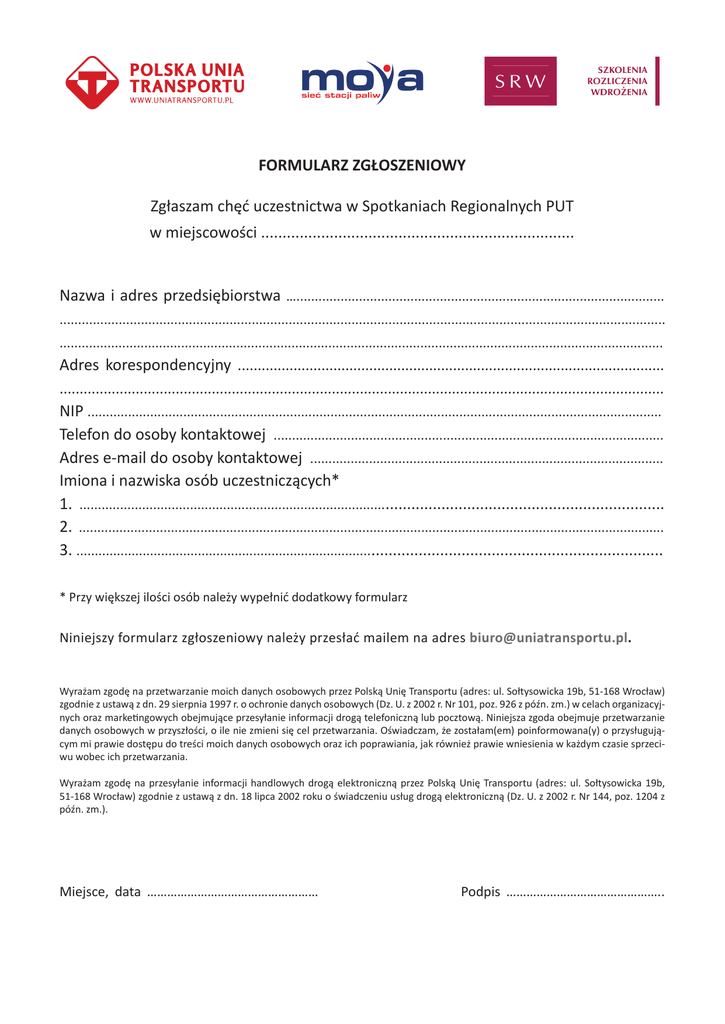 FORMULARZ ZGŁOSZENIOWY Zgłaszam chęć uczestnictwa w Spotkaniach Regionalnych PUT w miejscowości ......................................................................... Nazwa i adres przedsiębiorstwa ….................................................................................................... .................................................................................................................................................................... .................................................................................................................................................................... Adres korespondencyjny ........................................................................................................... ....................................................................................................................................................... NIP ............................................................................................................................................................ Telefon do osoby kontaktowej .......................................................................................................... Adres e-mail do osoby kontaktowej ................................................................................................ Imiona i nazwiska osób uczestniczących* 1. .................................................................................................................................................... 2. ............................................................................................................................................................... 3. .................................................................................................................................................... * Przy większej ilości osób należy wypełnić dodatkowy formularz Niniejszy formularz zgłoszeniowy należy przesłać mailem na adres [email protected]. Wyrażam zgodę na przetwarzanie moich danych osobowych przez Polską Unię Transportu (adres: ul. Sołtysowicka 19b, 51-168 Wrocław) zgodnie z ustawą z dn. 29 sierpnia 1997 r. o ochronie danych osobowych (Dz. U. z 2002 r. Nr 101, poz. 926 z późn. zm.) w celach organizacyjnych oraz marketingowych obejmujące przesyłanie informacji drogą telefoniczną lub pocztową. Niniejsza zgoda obejmuje przetwarzanie danych osobowych w przyszłości, o ile nie zmieni się cel przetwarzania. Oświadczam, że zostałam(em) poinformowana(y) o przysługującym mi prawie dostępu do treści moich danych osobowych oraz ich poprawiania, jak również prawie wniesienia w każdym czasie sprzeciwu wobec ich przetwarzania. Wyrażam zgodę na przesyłanie informacji handlowych drogą elektroniczną przez Polską Unię Transportu (adres: ul. Sołtysowicka 19b, 51-168 Wrocław) zgodnie z ustawą z dn. 18 lipca 2002 roku o świadczeniu usług drogą elektroniczną (Dz. U. z 2002 r. Nr 144, poz. 1204 z późn. zm.). Miejsce, data …………………………………………… Podpis ………………………………………..