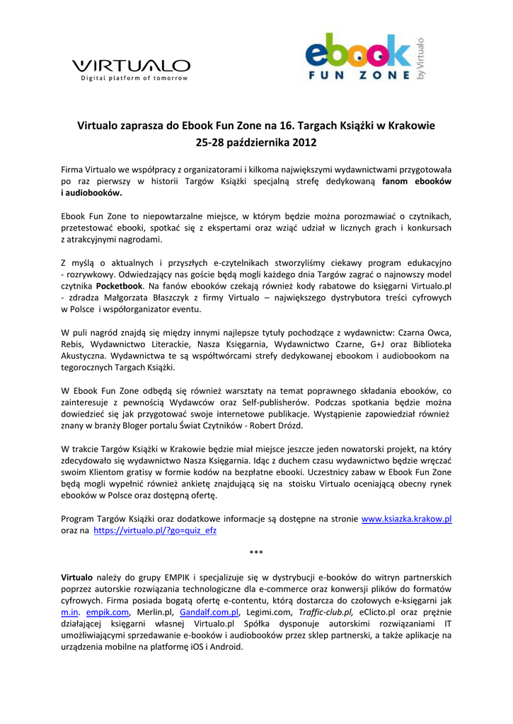 Virtualo zaprasza do Ebook Fun Zone na 16. Targach Książki w Krakowie 25-28 października 2012 Firma Virtualo we współpracy z organizatorami i kilkoma największymi wydawnictwami przygotowała po raz pierwszy w historii Targów Książki specjalną strefę dedykowaną fanom ebooków i audiobooków. Ebook Fun Zone to niepowtarzalne miejsce, w którym będzie można porozmawiać o czytnikach, przetestować ebooki, spotkać się z ekspertami oraz wziąć udział w licznych grach i konkursach z atrakcyjnymi nagrodami. Z myślą o aktualnych i przyszłych e-czytelnikach stworzyliśmy ciekawy program edukacyjno - rozrywkowy. Odwiedzający nas goście będą mogli każdego dnia Targów zagrać o najnowszy model czytnika Pocketbook. Na fanów ebooków czekają również kody rabatowe do księgarni Virtualo.pl - zdradza Małgorzata Błaszczyk z firmy Virtualo – największego dystrybutora treści cyfrowych w Polsce i współorganizator eventu. W puli nagród znajdą się między innymi najlepsze tytuły pochodzące z wydawnictw: Czarna Owca, Rebis, Wydawnictwo Literackie, Nasza Księgarnia, Wydawnictwo Czarne, G+J oraz Biblioteka Akustyczna. Wydawnictwa te są współtwórcami strefy dedykowanej ebookom i audiobookom na tegorocznych Targach Książki. W Ebook Fun Zone odbędą się również warsztaty na temat poprawnego składania ebooków, co zainteresuje z pewnością Wydawców oraz Self-publisherów. Podczas spotkania będzie można dowiedzieć się jak przygotować swoje internetowe publikacje. Wystąpienie zapowiedział również znany w branży Bloger portalu Świat Czytników - Robert Drózd. W trakcie Targów Książki w Krakowie będzie miał miejsce jeszcze jeden nowatorski projekt, na który zdecydowało się wydawnictwo Nasza Księgarnia. Idąc z duchem czasu wydawnictwo będzie wręczać swoim Klientom gratisy w formie kodów na bezpłatne ebooki. Uczestnicy zabaw w Ebook Fun Zone będą mogli wypełnić również ankietę znajdującą się na stoisku Virtualo oceniającą obecny rynek ebooków w Polsce oraz dostępną ofertę. Program Targów Książki oraz dodatkowe informacje są dostępne na stronie www.ksiazka.krakow.pl oraz na https://virtualo.pl/?go=quiz_efz *** Virtualo należy do grupy EMPIK i specjalizuje się w dystrybucji e-booków do witryn partnerskich poprzez autorskie rozwiązania technologiczne dla e-commerce oraz konwersji plików do formatów cyfrowych. Firma posiada bogatą ofertę e-contentu, którą dostarcza do czołowych e-księgarni jak m.in. empik.com, Merlin.pl, Gandalf.com.pl, Legimi.com, Traffic-club.pl, eClicto.pl oraz prężnie działającej księgarni własnej Virtualo.pl Spółka dysponuje autorskimi rozwiązaniami IT umożliwiającymi sprzedawanie e-booków i audiobooków przez sklep partnerski, a także aplikacje na urządzenia mobilne na platformę iOS i Android.