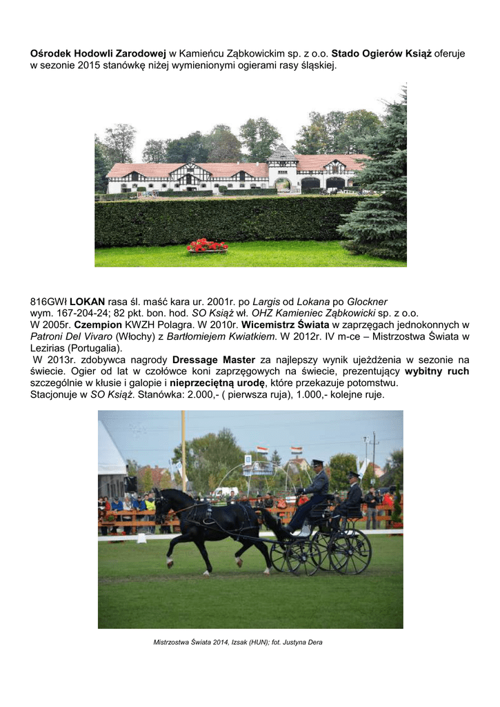 Ośrodek Hodowli Zarodowej w Kamieńcu Ząbkowickim sp. z o.o. Stado Ogierów Książ oferuje w sezonie 2015 stanówkę niżej wymienionymi ogierami rasy śląskiej. 816GWł LOKAN rasa śl. maść kara ur. 2001r. po Largis od Lokana po Glockner wym. 167-204-24; 82 pkt. bon. hod. SO Książ wł. OHZ Kamieniec Ząbkowicki sp. z o.o. W 2005r. Czempion KWZH Polagra. W 2010r. Wicemistrz Świata w zaprzęgach jednokonnych w Patroni Del Vivaro (Włochy) z Bartłomiejem Kwiatkiem. W 2012r. IV m-ce – Mistrzostwa Świata w Lezirias (Portugalia). W 2013r. zdobywca nagrody Dressage Master za najlepszy wynik ujeżdżenia w sezonie na świecie. Ogier od lat w czołówce koni zaprzęgowych na świecie, prezentujący wybitny ruch szczególnie w kłusie i galopie i nieprzeciętną urodę, które przekazuje potomstwu. Stacjonuje w SO Książ. Stanówka: 2.000,- ( pierwsza ruja), 1.000,- kolejne ruje. Mistrzostwa Świata 2014, Izsak (HUN); fot. Justyna Dera