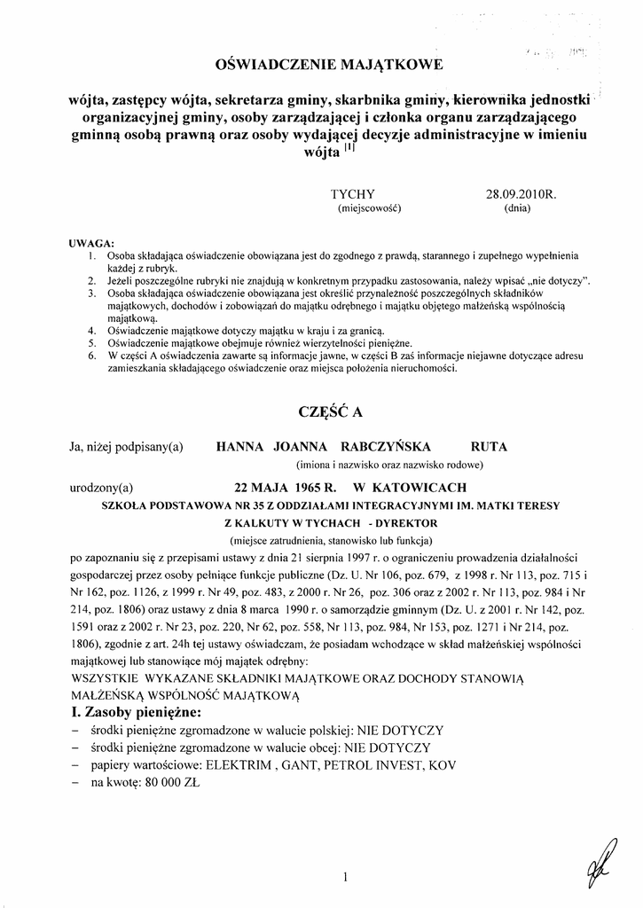 OSWIADCZENIE MAJĄTKOWE wÓjta' zastępcywÓjta' sekretarza gminy, skarbnika gminy,.kierownikajednostki' organizaryjnej gminy' osoby zarządzająceji członkaorganu zarządzającego gminnąosobąprawnąoraz osoby*yd$ą:?i decyzjeadministraryjnew imieniu woJta'-' TYCHY f8.09.2010R. (dnia) (miejscowoŚć) U WAG A: l . osoba sktadającaoświadczenięobowi4Zanajestdo Zgodnęgoz prawdą,Starannegoi zupełnęgowypetnienia kazdej z rubryk. 2. Jezę|iposzczegÓ|nerubryki nie znajdująw konkretnymprzypadku zastosowania,na|ęŻywpisac ,,niedotyczy''. 3. osoba składającaoświadczenieobowi4zanajestokreŚ|ićprzynaleinoŚć poszczegolnychskładnikÓw maj4tkowych,dochodÓw i zobowiązando majątkuodrębnegoi majątkuobjętegomałzeriskąwspolnością maj4tkową. 4. oświadczeniemajątkowe dotyczy majątku w kraju i za granicą. pienięzne. 5. oświadczeniemajątkoweobejmujerÓwniez wierzytelności 6. W częŚci A oŚwiadcZenia zawartesą informacjejawne, w częściB zaśinformacjeniejawne dotycząceadresu zamięszkaniaskładającegooŚwiadczenieoraz miejsca połozenianieruchomoŚci. CZĘSC A Ja,niŻejpodpisany(a) HANNA JOANNA RABCZYNSKA RUTA (imiona i nazwisko oraz nazwisko rodowe) urodzony(a) 22 Nf.AJA 1965R. SZKoŁA PoDSTAwowA W KATOWICACH NR 35 Z oDDZ|AŁAMI INTEGRACYJNYM| lM. MATK| TERESY ZKALKUTY W TYCHACH . DYREKTOR (miejscezatrudnienia, stanowisko lub funkcja) po zapoznaniusię z przepisami ustawy z dnia 2l sierpnia |991 r. o ograniczeniuprowadzenia dziata|ności gospodarazęiprzez osoby pełniącefunkcje publiczne(Dz. U. Nr 106' poz. 679, z |998 r. Nr l l3, poz. 1|5 i N r 1 6 2 ,p o z .l 1 2 6 , z 1 9 9 9r . N r 4 9 , p o 2 . 4 8 3 , 2 2 0 0r0. N r 2 6 , p o z . 3 0 6 o r a z z 2 0 0 2 r . N r 1 1 3 , p o 2 . 9 8i4N r 2|4, poz. 1806)oraz ustawyz dnia 8 marca l990 r. o Samorządziegminrrym(Dz. U. z2001 r. Nr |42, poz, l 5 9 l o r a z z f 0 0 2 r . N r f 3 , p o 2 . 2 2 0 ,N r 6 2 , p o 2 . 5 5 8N, r 1 1 3 ,p o z .9 8 4 ,N r 1 5 3 , p o 2 1. 2 1 1i N r 2 1 4 , p o 2 . l806), zgodniezart.24htej ustawyoświadczam,ieposiadamwchodzącew składmałżeskiej wspolności majątkowejlub stanowiącemÓj majątekodrębny: WSZYSTKIE WYKAZANE MAŁZEŃSKĄ wSPoLNoSĆ SKŁADNIKI MAJATKOWE oRAZ DOCHODY STANOWIA MAJĄTKoWĄ I. Zasoby pieniężne: środkipienięzneZgromadzonęw walucie polskiej:NIE DOTYCZY środkipienięŻneZgromadzonew walucie obcej:NIE, DOTYCZY papiery wartościowe: ELEKTRIM , GANT, PETROL INVEST, KoV na kwotę: 80 000 ZŁ II. 1. Dom o powierzchni:300 mf, o wartości:500 000 tytutprawny:WŁASNOSĆ --...----tytuł prawny:NIE DOTYCZY 2. Mieszkanie o powierzchni:..-.-...---frf, o wartości: rodzaj gospodarstwa:,powierzchnia: 3. Gospodarstworolne: NIE DOTYCZY o wartości: . rodzajzabudowy:... . .. tytut prawny: w roku ubiegłymprzychodi dochod w wysokości: Ztego tytułuosięgn4łem(ęłam) 4. Innęnieruchomości:powierzchnia: f000 Mf o wartości: I70 000 ZŁ tytułprawny: WŁASNOSĆ III. Posiadamudziaływ społkachhandlowych- na|eŻypodaćliczbę i emitentaudziatÓw: NIE DOTYCZY udziałÓww społce:. . . . udziałyte stanowiąpakietwiększy niŻ10o/o w roku ubiegłymdochod w wysokoŚci: Ztego tytułuosiągnąłem(ęłam) rv. Posiadamakcjew spÓłkachhandlowych- na|eiypodaćliczbęi ęmitentaakcji: NIE DOTYCZY akcjete stanowiąpakietwiększyniŻI0% akcjiw spÓtce:.... Ztego tytułuosi4gn4łem(ęłam) w roku ubiegłymdochÓd w wysokości: v. Nabyłem(am)(nabyłmoj małzonek,zwył'qczeniemmienia przyna\eznegodo jego maj4tku odrębnego)od Skarbu Panstwa, innej pat'rstwowejosoby prawnej,jednostek samorz4du terytorialnego'ich zwt4zkow lub od komunalnejosoby prawnejnastępujqcemienie, ktÓre podlegałozbyciu w drodze przetargu- nalezy podaćopis mienia i datęnabycia, od kogo: NIE DOTYCZY VI. 1. Prowadzę działa\noścgospodarcząt2)(należypodaćformę prawn4 iprzedmiot działalności): NIE DOTYCZY osobiście .... wspÓlnie z innymi osobami.... w roku ubiegłymprzychod i dochod w wysokości: Ztego tytułuosiągnąłem(ęłam) gospodarcząlub jestem przedstawicielem,pełnomocnikiemtakiej f . Zarządzam działalności4 (naleiy podaćformęprawnąi przedmiotdziałalności): działalności NIE DOTYCZY osobiście.... wspÓlniez innymi osobami.... Z tegotytułuosi4gn4łem(ęłam) w roku ubiegłymdochod w wysokości: VII. 1. w społkachhandlowych(nazwa,siedzibaspotki):NIE DOTYCZY jestem członkiemzarzqdu(od kiedy):... jestem członkiemkomisji rewizyjnej(od kiedy) Ztego tytułuosiągnąłem(ęłam) w roku ubiegłymdochod w wysokoŚci: 2. W społdzielniach:NIE DOTYCZY jestem członkiemZarzqdu(od kiedy): jestem członkiemrady nadzorczejt3] 1oakiedy): jestem członkiemkomisji rewizyjnej (od kiedy): Ztego tytułuosi4gn4łem(ęłam) w roku ubiegłymdochÓd w wysokości: 3. W fundacjachprowadzących działa|ność gospodarczq..NIE DOTYCZY jestem członkiemzarzqdu(od kiedy): jestem członkiem rady nadzorczej (od kiedy): Z tego tytutuosiągnąłem(ęłam) w roku ubiegłymdochÓd w wysokości: vnl. Inne dochody osiągane z tytułu zatrudnienia lub innej działalnościzarobkowej |ub zajęc, z podaniem kwot uzyskiwanych zkaŻdego tytułu: ZTYTUŁU ZATRUDNIENIA 48500,8| ZŁ ZTYTIJŁU ZBYCIA PAPIERoW WARTOSCIOWYCH f35OOZŁ [X. Składnikimienia ruchomegoo wartościpowyzej 10 000 złotych(w przypadkupojazdow mechanicznych na|eĘpodaćmarkę,modeli rok produkcji): CHRYSLER SEBRING .2002 R. HONDA CIVIC _ 2OO8R. X. Zobowiqzania pienięine o wartościpowyŻej |0 000 złotych,w tym zaciągniętekredyty i poŻyczkiorazwarunki, najakich zostałyudzięlone(wobeckogo,w związkuzjakim zdarzęnięffi' W jakiejwysokości): KREDYT HIPOTECZNY NA RoZBUDowĘ DOMU .100 000 CHF BANK MILLENIUM KREDYT NA SAMoCHoD HoNDA CIVIC .50 000 ZŁ LUKAS BANK