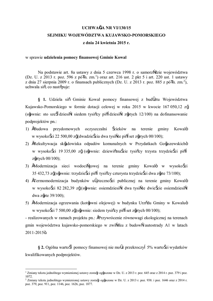 UCHWAŁA NR VI/130/15 SEJMIKU WOJEWÓDZTWA KUJAWSKO-POMORSKIEGO z dnia 24 kwietnia 2015 r. w sprawie udzielenia pomocy finansowej Gminie Kowal Na podstawie art. 8a ustawy z dnia 5 czerwca 1998 r. o samorządzie województwa (Dz. U. z 2013 r. poz. 596 z późn. zm. 1) oraz art. 216 ust. 2 pkt 5 i art. 220 ust. 1 ustawy z dnia 27 sierpnia 2009 r. o finansach publicznych (Dz. U. z 2013 r. poz. 885 z późn. zm. 2), uchwala się, co następuje: § 1. Udziela się Gminie Kowal pomocy finansowej z budżetu Województwa Kujawsko-Pomorskiego w formie dotacji celowej w roku 2015 w kwocie 167 050,12 zł (słownie: sto sześćdziesiąt siedem tysięcy pięćdziesiąt złotych 12/100) na dofinansowanie podprojektów pn.: 1) „Budowa przydomowych oczyszczalni ścieków na terenie gminy Kowal” w wysokości 22 500,00 zł (dwadzieścia dwa tysiące pięćset złotych 00/100); 2) „Rekultywacja składowiska odpadów komunalnych w Przydatkach Gołaszewskich” w wysokości 19 335,00 zł (słownie: dziewiętnaście tysięcy trzysta trzydzieści pięć złotych 00/100); 3) „Modernizacja sieci wodociągowej na terenie gminy Kowal” w wysokości 35 432,73 zł (słownie: trzydzieści pięć tysięcy czterysta trzydzieści dwa złote 73/100); 4) „Termomodernizacja budynków użyteczności publicznej na terenie gminy Kowal” w wysokości 82 282,39 zł (słownie: osiemdziesiąt dwa tysiące dwieście osiemdziesiąt dwa złote 39/100); 5) „Modernizacja ogrzewania (kotłowni olejowej) w budynku Urzędu Gminy w Kowalu” w wysokości 7 500,00 zł (słownie: siedem tysięcy pięćset złotych 00/100); - realizowanych w ramach projektu pn.: „Przywrócenie równowagi ekologicznej na terenach gmin województwa kujawsko-pomorskiego w związku z budową autostrady A1 w latach 2011-2015”. § 2. Ogólna wartość pomocy finansowej nie może przekroczyć 5% wartości wydatków kwalifikowanych podprojektów. 1 Zmiany tekstu jednolitego wymienionej ustawy zostały ogłoszone w Dz. U. z 2013 r. poz. 645 oraz z 2014 r. poz. 379 i poz. 1072. 2 Zmiany tekstu jednolitego wymienionej ustawy zostały ogłoszone w Dz. U. z 2013 r. poz. 938. i poz. 1646 oraz z 2014 r. poz. 379, poz. 911, poz. 1146, poz. 1626, poz. 1877. § 3. Wykonanie uchwały powierza się Zarządowi Województwa KujawskoPomorskiego. § 4. Uchwała wchodzi w życie z dniem podjęcia. UZASADNIENIE 1. Przedmiot regulacji: Projekt uchwały dotyczy udzielenia pomocy finansowej Gminie Kowal na realizację podprojektów pn.: 1) „Budowa przydomowych oczyszczalni ścieków na terenie gminy Kowal”, 2) „Rekultywacja składowiska odpadów komunalnych w Przydatkach Gołaszewskich”, 3) „Modernizacja sieci wodociągowej na terenie gminy Kowal”, 3) „Termomodernizacja budynków użyteczności publicznej na terenie gminy Kowal” (Szkoła Podstawowa w Grabkowie, Gimnazjum Publiczne w Grabkowie, Szkoła Podstawowa w Więsławicach, Budynek po szkole w Dębniakach, świetlica w Krzewencie, Zakład Usług Komunalnych w Przydatkach Gołaszewskich i Urząd Gminy w Kowalu), 4) „Modernizacja ogrzewania (kotłowni olejowej) w budynku Urzędu Gminy w Kowalu”, realizowanych w ramach Projektu pn.: „Przywrócenie równowagi ekologicznej na terenach gmin województwa kujawsko-pomorskiego w związku z budową autostrady A1 w latach 2011-2015”. 2. Omówienie podstawy prawnej: Podstawą udzielenia pomocy finansowej z budżetu jednostki samorządu terytorialnego są: ustawa z dnia 5 czerwca 1998 r. o samorządzie województwa oraz ustawa z dnia 27 sierpnia 2009 r. o finansach publicznych. W myśl art. 8a ustawy o samorządzie województwa Województwo KujawskoPomorskie może udzielać pomocy, w tym pomocy finansowej innym jednostkom samorządu terytorialnego. W myśl art. 216 ust. 2 pkt 5 ustawy o finansach publicznych wydatki budżetu jednostki samorządu terytorialnego są przyznawane na realizację zadań określonych w odrębnych przepisach na pomoc rzeczową lub finansową dla innych jednostek samorządu terytorialnego, określoną odrębną uchwałą przez organ stanowiący jednostki samorządu terytorialnego. W myśl art. 220 ust. 1 ustawy o finansach publicznych z budżetu jednostki samorządu terytorialnego może być udzielona pomoc finansowa innym jednostkom samorządu terytorialnego w formie dotacji celowej albo pomocy rzeczowej. 3. Konsultacje wymagane przepisami prawa (łącznie z przepisami wewnętrznymi): Nie dotyczy 4. Uzasadnienie merytoryczne: Mając na uwadze oddziaływanie jakie niesie za sobą budowa i późniejsza eksploatacja autostrady A1 oraz złagodzenie tego oddziaływania na środowisko podjęte zostały przez Samorząd Województwa Kujawsko-Pomorskiego działania w celu opracowania Projektu pn.: „Przywrócenie równowagi ekologicznej na terenach gmin województwa kujawskopomorskiego w związku z budową autostrady A1 w latach 2011-2015”, którym objętych zostało 9 gmin województwa kujawsko-pomorskiego, tj.: Aleksandrów Kujawski, Raciążek, Waganiec, Lubanie, Włocławek, Brześć Kujawski, Kowal, Lubień Kujawski oraz Choceń. Projekt jest również realizacją zawartego w dniu 20 sierpnia 2010 r. Porozumienia Nr PRZ ŚG.I.0116/143/2010 pomiędzy Województwem Kujawsko-Pomorskim a Gminami: Aleksandrów Kujawski, Raciążek, Waganiec, Lubanie, Włocławek, Brześć Kujawski, Kowal, Lubień Kujawski oraz Choceń, zmienionego Aneksem Nr 1 w dniu 23 września 2011 r. i Aneksem Nr 2 w dniu 4 kwietnia 2012 r. dotyczącego współpracy w zakresie realizacji przedsięwzięć inwestycyjnych zmierzających do przywrócenia równowagi ekologicznej na terenach gmin będących sygnatariuszami przedmiotowego Porozumienia, związanych z realizacją inwestycji budowy autostrady A1. Na rzecz realizacji Projektu zawarta została w dniu 11 kwietnia 2012 r. umowa partnerska Nr ŚG-IV.041.1.4.2012 pomiędzy Województwem Kujawsko-Pomorskim, będącym Liderem Partnerstwa a wskazanymi powyżej gminami będącymi Partnerami Projektu. Zmiany zapisó