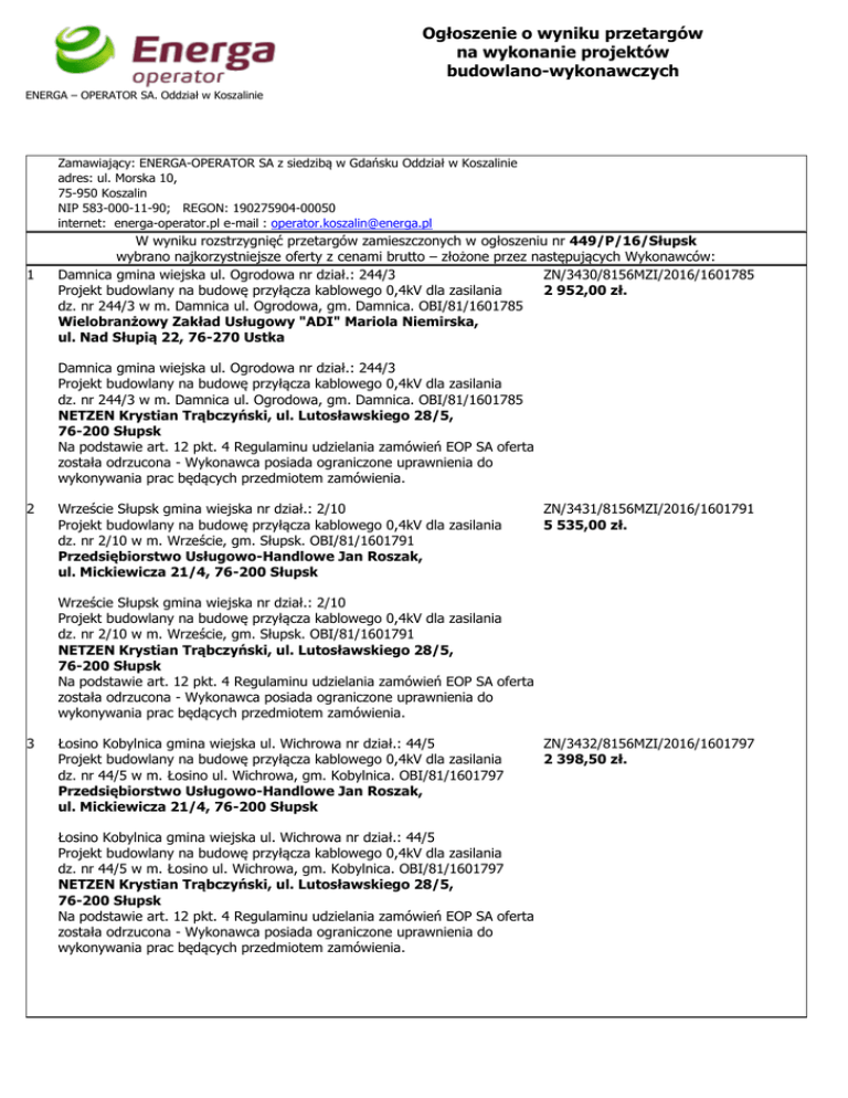 Ogłoszenie o wyniku przetargów na wykonanie projektów budowlano-wykonawczych ENERGA – OPERATOR SA. Oddział w Koszalinie Zamawiający: ENERGA-OPERATOR SA z siedzibą w Gdańsku Oddział w Koszalinie adres: ul. Morska 10, 75-950 Koszalin NIP 583-000-11-90; REGON: 190275904-00050 internet: energa-operator.pl e-mail : [email protected] 1 W wyniku rozstrzygnięć przetargów zamieszczonych w ogłoszeniu nr 449/P/16/Słupsk wybrano najkorzystniejsze oferty z cenami brutto – złożone przez następujących Wykonawców: Damnica gmina wiejska ul. Ogrodowa nr dział.: 244/3 ZN/3430/8156MZI/2016/1601785 Projekt budowlany na budowę przyłącza kablowego 0,4kV dla zasilania 2 952,00 zł. dz. nr 244/3 w m. Damnica ul. Ogrodowa, gm. Damnica. OBI/81/1601785 Wielobranżowy Zakład Usługowy "ADI" Mariola Niemirska, ul. Nad Słupią 22, 76-270 Ustka Damnica gmina wiejska ul. Ogrodowa nr dział.: 244/3 Projekt budowlany na budowę przyłącza kablowego 0,4kV dla zasilania dz. nr 244/3 w m. Damnica ul. Ogrodowa, gm. Damnica. OBI/81/1601785 NETZEN Krystian Trąbczyński, ul. Lutosławskiego 28/5, 76-200 Słupsk Na podstawie art. 12 pkt. 4 Regulaminu udzielania zamówień EOP SA oferta została odrzucona - Wykonawca posiada ograniczone uprawnienia do wykonywania prac będących przedmiotem zamówienia. 2 Wrzeście Słupsk gmina wiejska nr dział.: 2/10 Projekt budowlany na budowę przyłącza kablowego 0,4kV dla zasilania dz. nr 2/10 w m. Wrzeście, gm. Słupsk. OBI/81/1601791 Przedsiębiorstwo Usługowo-Handlowe Jan Roszak, ul. Mickiewicza 21/4, 76-200 Słupsk ZN/3431/8156MZI/2016/1601791 5 535,00 zł. Wrzeście Słupsk gmina wiejska nr dział.: 2/10 Projekt budowlany na budowę przyłącza kablowego 0,4kV dla zasilania dz. nr 2/10 w m. Wrzeście, gm. Słupsk. OBI/81/1601791 NETZEN Krystian Trąbczyński, ul. Lutosławskiego 28/5, 76-200 Słupsk Na podstawie art. 12 pkt. 4 Regulaminu udzielania zamówień EOP SA oferta została odrzucona - Wykonawca posiada ograniczone uprawnienia do wykonywania prac będących przedmiotem zamówienia. 3 Łosino Kobylnica gmina wiejska ul. Wichrowa nr dział.: 44/5 Projekt budowlany na budowę przyłącza kablowego 0,4kV dla zasilania dz. nr 44/5 w m. Łosino ul. Wichrowa, gm. Kobylnica. OBI/81/1601797 Przedsiębiorstwo Usługowo-Handlowe Jan Roszak, ul. Mickiewicza 21/4, 76-200 Słupsk Łosino Kobylnica gmina wiejska ul. Wichrowa nr dział.: 44/5 Projekt budowlany na budowę przyłącza kablowego 0,4kV dla zasilania dz. nr 44/5 w m. Łosino ul. Wichrowa, gm. Kobylnica. OBI/81/1601797 NETZEN Krystian Trąbczyński, ul. Lutosławskiego 28/5, 76-200 Słupsk Na podstawie art. 12 pkt. 4 Regulaminu udzielania zamówień EOP SA oferta została odrzucona - Wykonawca posiada ograniczone uprawnienia do wykonywania prac będących przedmiotem zamówienia. ZN/3432/8156MZI/2016/1601797 2 398,50 zł. Ogłoszenie o wyniku przetargów na wykonanie projektów budowlano-wykonawczych ENERGA – OPERATOR SA. Oddział w Koszalinie 4 Radosław Sławno gmina wiejska nr dział.: 165 Projekt budowlany na budowę przyłącza kablowego 0,4kV dla zasilania dz. nr 165 w m. Radosław, gm. Sławno. OBI/81/1601784 Przedsiębiorstwo Usługowo-Handlowe Jan Roszak, ul. Mickiewicza 21/4, 76-200 Słupsk ZN/3433/8156MZI/2016/1601784 2 767,50 zł. Radosław Sławno gmina wiejska nr dział.: 165 Projekt budowlany na budowę przyłącza kablowego 0,4kV dla zasilania dz. nr 165 w m. Radosław, gm. Sławno. OBI/81/1601784 NETZEN Krystian Trąbczyński, ul. Lutosławskiego 28/5, 76-200 Słupsk Na podstawie art. 12 pkt. 4 Regulaminu udzielania zamówień EOP SA oferta została odrzucona - Wykonawca posiada ograniczone uprawnienia do wykonywania prac będących przedmiotem zamówienia. 5 Krępa Słupska Słupsk gmina wiejska nr dział.: 761 Projekt budowlany na budowę przyłącza kablowego 0,4kV dla zasilania dz. nr 761 w m. Krępa Słupska, gm. Słupsk. OBI/81/1601832 Przedsiębiorstwo Usługowo-Handlowe Jan Roszak, ul. Mickiewicza 21/4, 76-200 Słupsk ZN/3436/8156MZI/2016/1601832 2 398,50 zł. Krępa Słupska Słupsk gmina wiejska nr dział.: 761 Projekt budowlany na budowę przyłącza kablowego 0,4kV dla zasilania dz. nr 761 w m. Krępa Słupska, gm. Słupsk. OBI/81/1601832 NETZEN Krystian Trąbczyński, ul. Lutosławskiego 28/5, 76-200 Słupsk Na podstawie art. 12 pkt. 4 Regulaminu udzielania zamówień EOP SA oferta została odrzucona - Wykonawca posiada ograniczone uprawnienia do wykonywania prac będących przedmiotem zamówienia. 6 Siemianice Słupsk gmina wiejska ul. Migdałowa nr dział.: 307/112 ZN/3437/8156MZI/2016/1601844 Projekt budowlany na budowę przyłącza kablowego 0,4kV dla zasilania 2 952,00 zł. dz. nr 307/112 w m. Siemianice ul. Migdałowa, gm. Słupsk. OBI/81/1601844 Wielobranżowy Zakład Usługowy "ADI" Mariola Niemirska, ul. Nad Słupią 22, 76-270 Ustka Siemianice Słupsk gmina wiejska ul. Migdałowa nr dział.: 307/112 Projekt budowlany na budowę przyłącza kablowego 0,4kV dla zasilania dz. nr 307/112 w m. Siemianice ul. Migdałowa, gm. Słupsk. OBI/81/1601844 NETZEN Krystian Trąbczyński, ul. Lutosławskiego 28/5, 76-200 Słupsk Na podstawie art. 12 pkt. 4 Regulaminu udzielania zamówień EOP SA oferta została odrzucona - Wykonawca posiada ograniczone uprawnienia do wykonywania prac będących przedmiotem zamówienia. 7 Słupsk gmina miejska ul. Stefana Batorego nr dział.: 89; 90 ZN/3439/8156MZI/2016/1601903 Projekt budowlany na budowę linii kablowej 0,4kV dla zasilania 11 685,00 zł. dz. nr 89, 90 w m. Słupsk ul. Batorego, gm. M. Słupsk. OBI/81/1601903 Przedsiębiorstwo Usługowo-Handlowe Jan Roszak, ul. Mickiewicza 21/4, 76-200 Słupsk Ogłoszenie o wyniku przetargów na wykonanie projektów budowlano-wykonawczych ENERGA – OPERATOR SA. Oddział w Koszalinie Słupsk gmina miejska ul. Stefana Batorego nr dział.: 89; 90 Projekt budowlany na budowę linii kablowej 0,4kV dla zasilania dz. nr 89, 90 w m. Słupsk ul. Batorego, gm. M. Słupsk. OBI/81/1601903 NETZEN Krystia