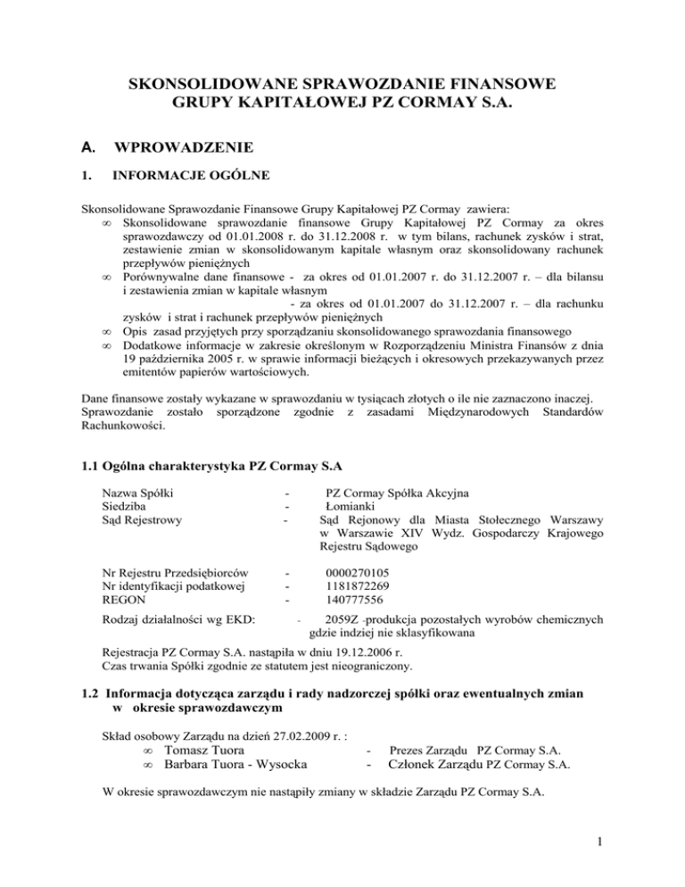 SKONSOLIDOWANE SPRAWOZDANIE FINANSOWE GRUPY KAPITAŁOWEJ PZ CORMAY S.A. A. WPROWADZENIE 1. INFORMACJE OGÓLNE Skonsolidowane Sprawozdanie Finansowe Grupy Kapitałowej PZ Cormay zawiera: • Skonsolidowane sprawozdanie finansowe Grupy Kapitałowej PZ Cormay za okres sprawozdawczy od 01.01.2008 r. do 31.12.2008 r. w tym bilans, rachunek zysków i strat, zestawienie zmian w skonsolidowanym kapitale własnym oraz skonsolidowany rachunek przepływów pienięŜnych • Porównywalne dane finansowe - za okres od 01.01.2007 r. do 31.12.2007 r. – dla bilansu i zestawienia zmian w kapitale własnym - za okres od 01.01.2007 do 31.12.2007 r. – dla rachunku zysków i strat i rachunek przepływów pienięŜnych • Opis zasad przyjętych przy sporządzaniu skonsolidowanego sprawozdania finansowego • Dodatkowe informacje w zakresie określonym w Rozporządzeniu Ministra Finansów z dnia 19 października 2005 r. w sprawie informacji bieŜących i okresowych przekazywanych przez emitentów papierów wartościowych. Dane finansowe zostały wykazane w sprawozdaniu w tysiącach złotych o ile nie zaznaczono inaczej. Sprawozdanie zostało sporządzone zgodnie z zasadami Międzynarodowych Standardów Rachunkowości. 1.1 Ogólna charakterystyka PZ Cormay S.A Nazwa Spółki Siedziba Sąd Rejestrowy - Nr Rejestru Przedsiębiorców Nr identyfikacji podatkowej REGON - Rodzaj działalności wg EKD: PZ Cormay Spółka Akcyjna Łomianki Sąd Rejonowy dla Miasta Stołecznego Warszawy w Warszawie XIV Wydz. Gospodarczy Krajowego Rejestru Sądowego 0000270105 1181872269 140777556 - 2059Z -produkcja pozostałych wyrobów chemicznych gdzie indziej nie sklasyfikowana Rejestracja PZ Cormay S.A. nastąpiła w dniu 19.12.2006 r. Czas trwania Spółki zgodnie ze statutem jest nieograniczony. 1.2 Informacja dotycząca zarządu i rady nadzorczej spółki oraz ewentualnych zmian w okresie sprawozdawczym Skład osobowy Zarządu na dzień 27.02.2009 r. : • Tomasz Tuora • Barbara Tuora - Wysocka - Prezes Zarządu PZ Cormay S.A. - Członek Zarządu PZ Cormay S.A. W okresie sprawozdawczym nie nastąpiły zmiany w składzie Zarządu PZ Cormay S.A. 1 Skład osobowy Rady Nadzorczej na dzień 27.02.2009 r.: • Przewodniczący Rady Nadzorczej Stefan Jackowski • Wiceprzewodniczący Rady Nadzorczej Stanisław Szczurek • Członek Rady Nadzorczej Włodzimierz Jaworski • Członek Rady Nadzorczej Marek Stępień • Członek Rady Nadzorczej Paweł Edward Nowak • Członek Rady Nadzorczej Ryszard BłaŜejewski W okresie sprawozdawczym nie nastąpiły zmiany w składzie Rady Nadzorczej PZ Cormay S.A. 1.3 Wynagrodzenia za cztery kwartały 2008 roku osób zarządzających i nadzorujących Grupy Kapitałowej PZ Cormay S.A. IMIĘ I NAZWISKO PZ CORMAY S.A. KORMEJ DIANA RAZEM Tomasz Tuora 442 10 452 Barbara Tuora - Wysocka 68 - 68 W okresie sprawozdawczym osoby nadzorujące Grupy Kapitałowej PZ Cormay nie pobierały wynagrodzenia. 1.4 Kapitał zakładowy spółki PZ Cormay S.A. Kapitał zakładowy PZ Cormay S.A. na dzień 31.12.2008 r. wynosił 11.861.977 zł i dzielił się na 11.861.977 sztuk akcji o wartości nominalnej 1,00 zł kaŜda. Kapitał zakładowy ( struktura) na dzień 31.12.2008 r. Nr serii Rodzaj akcji Rodzaj uprzywilejowania Liczba akcji Liczba głosów Cena Udział w kapitale Udział na na WZA nominalna 6.882.161 1,00 58,02 58,02 1,00 21.08 21,08 WZA A Na okaziciela Brak uprzywilejowania 6.882.161 B Na okaziciela Brak uprzywilejowania 2.500.000 C Na okaziciela Brak uprzywilejowania 495.000 495.000 1,00 4,17 4,17 D Na okaziciela Brak uprzywilejowania 1984816 1984816 1,00 16,73 16,73 2.500.000 2 RAZEM 11.861.977 11.861.977 1,00 100,00 100,00 W okresie od 01.01.2008 do 30.09.2008 roku nie nastąpiły zmiany w wysokości kapitału akcyjnego PZ Cormay S.A. Według wiedzy Zarządu PZ Cormay S.A. na dzień sporządzenia niniejszego raportu ( 30.09.2008r. ) lista akcjonariuszy, którzy posiadali co najmniej 5 % głosów przedstawia się następująco: AKCJONARIUSZE PZ Cormay S.A. POSIADAJĄCY CO NAJMNIEJ 5% GŁOSÓW NA WZA LICZBA AKCJI (wg wiedzy Zarządu Cormay S.A.) ILOŚĆ GŁOSÓW NA WZA (SZT.) PROCENT UDZIAŁU W KAPITALE AKCYJNYM (%) UDZIAŁ W GŁOSACH NA WZA (%) Cormay AG 7.082.161 7.082.161 59,70 59,70 Hyposwiss (LUX) Fund - Danube Tiger 950.000 950.000 8,01 8,01 Tomasz Tuora wraz z TT Management Sp. z o.o. 682.138 682.138 5,8 5,8 1.5 Informacje o grupie kapitałowej PZ Cormay S.A. jest podmiotem dominującym w Grupie Kapitałowej , w skład której według stanu na dzień 31 grudzień 2008 roku i na dzień 31 grudzień 2007 roku wchodziły następujące podmioty: • KORMEJ DIANA Sp. z o.o. Forma prawna: KORMEJ DIANA Spółka z o.o. Siedziba: Mińsk, Białoruś Kod OKJLP (Ogólnorosyjski Klasyfikator Osób Prawnych): 100344141 Kod OKED (Ogólnorosyjski Klasyfikator Rodzajów Działalności Gospodarczej): 51709 7113, Przedmiot działalności : Handel hurtowy Udział PZ Cormay S.A. w kapitale spółki zaleŜnej i głosach na zgromadzeniu wspólników: PZ Cormay S.A. jest właścicielem 98,5 % udziałów spółki KORMEJ DIANA , co daje 98,5 % udziału w głosach na zgromadzeniu wspólników oraz 98,5.% udziału w kapitale zakładowym. • KORMIEJ - RUSŁAND S.A. Zamknięta Forma prawna: KORMIEJ - RUSŁAND S.A. Zamknięta Siedziba: Moskwa, Rosja Kod OKPO (Ogólnorosyjski Klasyfikator Przedsiębiorstw i Organizacji): 31739928 Kod INN (Numer identyfikacji podatku VAT, NIP): 7707083269\770701001 Kod OKEWD (Ogólnorosyjski Klasyfikator Rodzajów Działalności Gospodarczej): 51.46.1 Przedmiot działalności : Handel hurtowy techniką medyczną Udział PZ Cormay S.A. w kapitale spółki zaleŜnej i głosach na walnym zgromadzeniu: 3 PZ Cormay S.A. jest właścicielem 100% udziałów spółki KORMIEJ - RUSŁAND S.A. Zamknięta , co daje 100 % udziału w głosach na Walnym Zgromadzeniu oraz 100% udziału w kapitale zakładowym. 2. ISTOTNE ZASADY RACHUNKOWOŚCI 2.1 Podstawa sporządzenia skonsolidowanego sprawozdania finansowego S