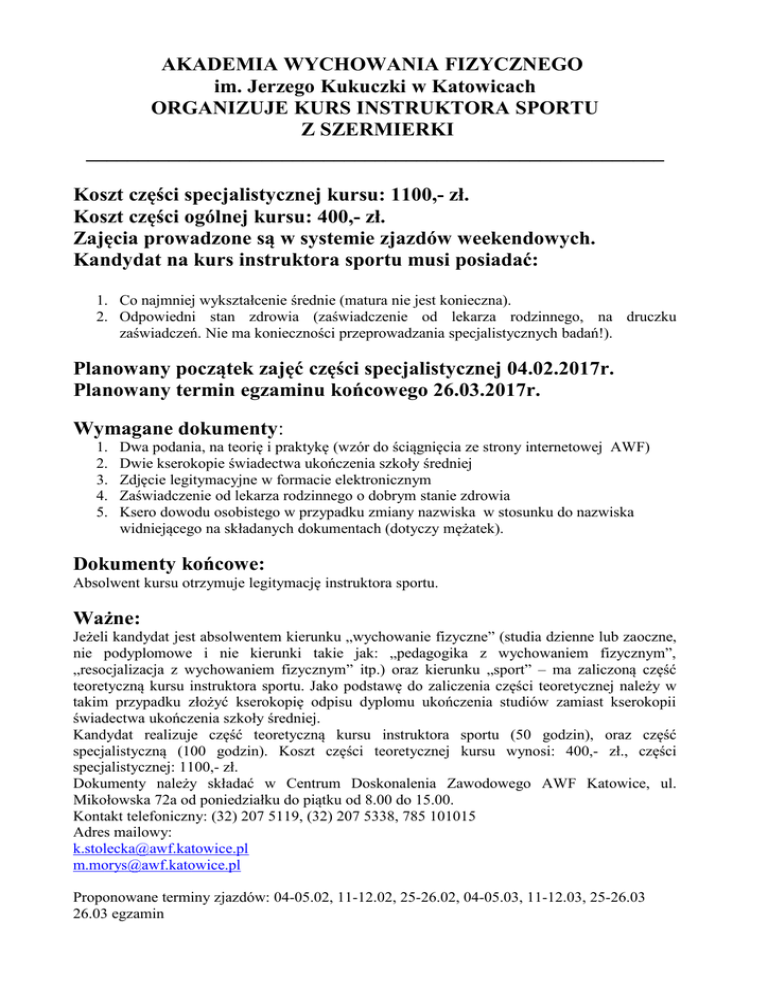 AKADEMIA WYCHOWANIA FIZYCZNEGO im. Jerzego Kukuczki w Katowicach ORGANIZUJE KURS INSTRUKTORA SPORTU Z SZERMIERKI ________________________________________________________ Koszt części specjalistycznej kursu: 1100,- zł. Koszt części ogólnej kursu: 400,- zł. Zajęcia prowadzone są w systemie zjazdów weekendowych. Kandydat na kurs instruktora sportu musi posiadać: 1. Co najmniej wykształcenie średnie (matura nie jest konieczna). 2. Odpowiedni stan zdrowia (zaświadczenie od lekarza rodzinnego, na druczku zaświadczeń. Nie ma konieczności przeprowadzania specjalistycznych badań!). Planowany początek zajęć części specjalistycznej 04.02.2017r. Planowany termin egzaminu końcowego 26.03.2017r. Wymagane dokumenty: 1. 2. 3. 4. 5. Dwa podania, na teorię i praktykę (wzór do ściągnięcia ze strony internetowej AWF) Dwie kserokopie świadectwa ukończenia szkoły średniej Zdjęcie legitymacyjne w formacie elektronicznym Zaświadczenie od lekarza rodzinnego o dobrym stanie zdrowia Ksero dowodu osobistego w przypadku zmiany nazwiska w stosunku do nazwiska widniejącego na składanych dokumentach (dotyczy mężatek). Dokumenty końcowe: Absolwent kursu otrzymuje legitymację instruktora sportu. Ważne: Jeżeli kandydat jest absolwentem kierunku „wychowanie fizyczne” (studia dzienne lub zaoczne, nie podyplomowe i nie kierunki takie jak: „pedagogika z wychowaniem fizycznym”, „resocjalizacja z wychowaniem fizycznym” itp.) oraz kierunku „sport” – ma zaliczoną część teoretyczną kursu instruktora sportu. Jako podstawę do zaliczenia części teoretycznej należy w takim przypadku złożyć kserokopię odpisu dyplomu ukończenia studiów zamiast kserokopii świadectwa ukończenia szkoły średniej. Kandydat realizuje część teoretyczną kursu instruktora sportu (50 godzin), oraz część specjalistyczną (100 godzin). Koszt części teoretycznej kursu wynosi: 400,- zł., części specjalistycznej: 1100,- zł. Dokumenty należy składać w Centrum Doskonalenia Zawodowego AWF Katowice, ul. Mikołowska 72a od poniedziałku do piątku od 8.00 do 15.00. Kontakt telefoniczny: (32) 207 5119, (32) 207 5338, 785 101015 Adres mailowy: [email protected] [email protected] Proponowane terminy zjazdów: 04-05.02, 11-12.02, 25-26.02, 04-05.03, 11-12.03, 25-26.03 26.03 egzamin