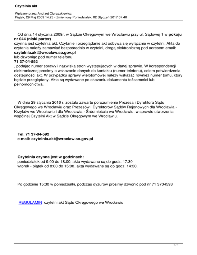 Czytelnia akt Wpisany przez Andrzej Ciuraszkiewicz Piątek, 29 Maj 2009 14:23 - Zmieniony Poniedziałek, 02 Styczeń 2017 07:46 Od dnia 14 stycznia 2009r. w Sądzie Okręgowym we Wrocławiu przy ul. Sądowej 1 w pokoju nr 044 (niski parter) czynna jest czytelnia akt. Czytanie i przeglądanie akt odbywa się wyłącznie w czytelni. Akta do czytania należy zamawiać bezpośrednio w czytelni, drogą elektroniczną pod adresem email: [email protected] lub dzwoniąc pod numer telefonu 71 37-04-592 , podając numer sprawy i nazwiska stron występujących w danej sprawie. W korespondencji elektronicznej prosimy o wskazanie danych do kontaktu (numer telefonu), celem potwierdzenia dostępności akt. W przypadku sprawy wielotomowej należy wskazać również numer tomu, który będzie przeglądany. Akta są wydawane po okazaniu dokumentu tożsamości lub pełnomocnictwa. W dniu 29 stycznia 2016 r. zostało zawarte porozumienie Prezesa i Dyrektora Sądu Okręgowego we Wrocławiu oraz Prezesów i Dyrektorów Sądów Rejonowych dla Wrocławia Krzyków we Wrocławiu i dla Wrocławia - Śródmieścia we Wrocławiu, w sprawie utworzenia wspólnej Czytelni Akt w Sądzie Okręgowym we Wrocławiu. Tel. 71 37-04-592 e-mail: [email protected] Czytelnia czynna jest w godzinach: poniedziałek od 9:00 do 18:00, akta wydawane są do godz. 17:30 wtorek - piątek od 8:00 do 15:00, akta wydawane są do godz. 14:30. Po godzinie 15:30 w poniedziałki, podczas dyżurów prosimy dzwonić pod nr 71 3704593 REGULAMIN czytelni akt Sądu Okręgowego we Wrocławiu 1/1