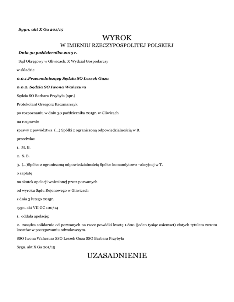 Sygn. akt X Ga 201/15 WYROK W IMIENIU RZECZYPOSPOLITEJ POLSKIEJ Dnia 30 października 2015 r. Sąd Okręgowy w Gliwicach, X Wydział Gospodarczy w składzie 0.0.1.Przewodniczący Sędzia SO Leszek Guza 0.0.2. Sędzia SO Iwona Wańczura Sędzia SO Barbara Przybyła (spr.) Protokolant Grzegorz Kaczmarczyk po rozpoznaniu w dniu 30 października 2015r. w Gliwicach na rozprawie sprawy z powództwa (...) Spółki z ograniczoną odpowiedzialnością w B. przeciwko: 1. M. B. 2. S. B. 3. (...)Spółce z ograniczoną odpowiedzialnością Spółce komandytowo –akcyjnej w T. o zapłatę na skutek apelacji wniesionej przez pozwanych od wyroku Sądu Rejonowego w Gliwicach z dnia 3 lutego 2015r. sygn. akt VII GC 100/14 1. oddala apelację; 2. zasądza solidarnie od pozwanych na rzecz powódki kwotę 1.800 (jeden tysiąc osiemset) złotych tytułem zwrotu kosztów w postępowaniu odwoławczym. SSO Iwona Wańczura SSO Leszek Guza SSO Barbara Przybyła Sygn. akt X Ga 201/15 UZASADNIENIE (...) spółka z ograniczoną odpowiedzialnością w pozwie przeciwko M. B. i S. B. domagała się uznania umowy sprzedaży pojazdów marki A. (...) o numerze rejestracyjnym (...) oraz D.C. (...) o numerze rejestracyjnym (...) za bezskuteczną wobec powódki. Pozwani domagali się oddalenia powództwa. Zaskarżonym wyrokiem sąd uwzględnił powództwo w całości i orzekł o kosztach procesu. W uzasadnieniu sąd dokonał następujących ustaleń: M. B. i S. B. prowadzili działalność gospodarczą w formie spółki cywilnej pod nazwą (...). Na podstawie uchwały wspólników spółki z dnia 21 grudnia 2012 roku w trybie art. 551 i n. k.s.h.. nastąpiło przekształcenie spółki cywilnej (...) M. B., S. B. w spółkę (...) M. B., (...), a następnie nastąpiła zmiana firmy na (...) Spółki z ograniczoną odpowiedzialnością spółka komandytowo – akcyjną z siedzibą w T.. Pozwani w ramach prowadzonej działalności gospodarczej zajmowali się, miedzy innymi, wynajmem samochodów. Wedle cennika usług z 5 sierpnia 2013 r. przy okresie najmu od 21 do 30 dni czynsz najmu samochodu osobowego klasy E – M. (...)‑klasa (...) wynosił 899,00 zł za dobę a samochodu osobowego klasy (...) M. (...) wynosił 499,00 zł za dobę. Stawki czynszu przy najmie długoterminowym były indywidualnie ustalane (wydruk cennika, k. 12‑13, zeznania pozwanego M. B., k. 287-288). W dniu 22 grudnia 2011r. pracownica R. A. S. wystawiła fakturę VAT (...) na sprzedaż pojazdu Daimler C. M. o nr rej. (...) o nr VIN (...) oraz wydrukowała potwierdzenie wpłaty 30 000,00 zł KP nr (...). W dniu 2 stycznia 2012 roku pozwani M. B. i S. B. podpisali umowę z T. L., przedmiotem której miał być najem samochodu marki D. (...) o nr rej. (...) na czas nieokreślony przy opłacie miesięcznej w kwocie 500,00 zł brutto. T. L. zobowiązała się, że nie odda przedmiotu najmu osobie trzeciej w podnajem. W dniu 16 stycznia 2012r. została wystawiona kolejna faktura VAT (...) na sprzedaż pojazdu A. (...) o nr rej. (...) i nr VIN (...) za kwotę 42 000,00 zł. Samochody zostały przerejestrowane na M. B.. W dniu 31 stycznia 2012 roku pozwani M. B. i S. B. podpisali umowę najmu na czas nieokreślony z R. J., przedmiotem której był samochód marki A. (...) o nr rej. (...), przy opłacie miesięcznej w kwocie 2 100,00 zł brutto. W dniu 31 marca 2012 roku strony tej umowy złożyły oświadczenie o jej rozwiązaniu. Pozwany M. B. znał się z R. J. na stopie prywatnej. W dacie zawarcia umów sprzedaży samochodów pozostawali w bliskich relacjach, spotykali się na imprezach, urodzinach. R. J. zabierał swoich kontrahentów do lokali prowadzonych przez pozwanego. R. J. miał problemy finansowe od końca 2011 roku. Nie regulował na bieżąco swoich zobowiązań, był wzywany przez wierzycieli do zapłaty zaległości. Od marca 2012 roku były prowadzone przeciwko niemu komornicze postępowania egzekucyjne. W celu pokrycia bieżących wydatków wyzbywał się środków trwałych przedsiębiorstwa, w tym posiadanych pojazdów. Jego sytuacja finansowa była powszechnie znana. Wierzytelność powódki została stwierdzona nakazem zapłaty Sądu Rejonowego w Bytomiu z dnia 1 czerwca 2012 roku, wydanym w sprawie o sygnaturze akt VI GNc 1977/12. W ramach prowadzonego postępowania egzekucyjnego komornik dokonał zajęcia licznych wierzytelności przysługujących dłużnikowi R. J., jednakże egzekucja była bezskuteczna o czym komornik powiadomił wierzycieli pismem z 25 czerwca 2013 r. Ostatecznie postanowieniem z dnia 28 czerwca 2013 r. komornik umorzył postępowanie egzekucyjne przeciwko dłużnikowi R. J. z uwagi na bezskuteczność egzekucji. W dniu 30 marca 2012 roku pozwani M. B. i S. B. złożyli w Sądzie Rejonowym w Gliwicach pozew interwencyjny o zwolnienie z egzekucji samochodów marki D. (...) o nr rej. (...) oraz marki A. (...) o nr rej. (...). W dniu 3 stycznia 2014 roku Sąd Rejonowy w Gliwicach w sprawie sygn. akt II C 1465/12 orzekł zwolnienie z egzekucji samochodu marki A. (...) o nr rej. (...), a w pozostałym zakresie oddalił powództwo o zwolnienie w egzekucji Przy tak ustalonym stanie faktycznym sąd uwzględnił powództwo na podstawie art. 527 kc. Wskazał, że powód wykazał istnienie wierzytelności, dokonanie przez dłużnika czynności prawnej z osobą trzecią oraz fakt pokrzywdzenia na skutek czynności prawnej dokonanej przez dłużnika, ze świadomością pokrzywdzenia wierzyciela, a także uzyskanie wskutek tej czynności korzyści majątkowej przez poprzedników prawnych pozwanej oraz działanie w złej wierze.. Powódka była wierzycielem R. J., co stwierdzał nakaz zapłaty Sądu Rejonowego w Bytomiu z dnia 1 czerwca 2012 r. sygn. akt VI GNc 1977/12. Sąd wskazał i uzasadnił odpowiedzialność solidarną pozwanych. (...) Spółki z ograniczoną odpowiedzialnością spółka komandytowo-akcyjna w (...) jest następcą prawnym pozwanych M. B. i S. B. Pozwani działali uprzednio w formie spółki cywilnej, kt