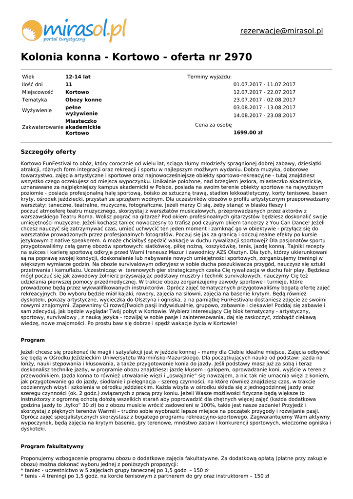 [email protected] Kolonia konna - Kortowo - oferta nr 2970 Wiek 12-14 lat Ilość dni 11 01.07.2017 - 11.07.2017 Miejscowość Kortowo 12.07.2017 - 22.07.2017 Tematyka Obozy konne 23.07.2017 - 02.08.2017 Wyżywienie pełne wyżywienie 03.08.2017 - 13.08.2017 Miasteczko Zakwaterowanie akademickie Kortowo Terminy wyjazdu: 14.08.2017 - 23.08.2017 Cena za osobę 1699.00 zł Szczegóły oferty Kortowo FunFestival to obóz, który corocznie od wielu lat, sciąga tłumy młodzieży spragnionej dobrej zabawy, dziesiątki atrakcji, różnych form integracji oraz rekreacji i sportu w najlepszym możlwym wydaniu. Dobra muzyka, doborowe towarzystwo, zajęcia artystyczne i sportowe oraz najnowocześniejsze obiekty sportowo-rekreacyjne - tutaj znajdziesz wszystko czego oczekujesz od miejsca wypoczynku. Unikalnie położone, nad brzegiem jeziora, miasteczko akademickie, uznanawane za najpiękniejszy kampus akademicki w Polsce, posiada na swoim terenie obiekty sportowe na najwyższym poziomie - posiada profesjonalną halę sportową, boisko ze sztuczną trawą, stadion lekkoatletyczny, korty tenisowe, basen kryty, ośrodek jeździecki, przystań ze sprzętem wodnym. Dla uczestników obozów o profilu artystycznym przeporwadzamy warsztaty: taneczne, teatralne, muzyczne, fotograficzne. Jeżeli marzy Ci się, żeby stanąć w blasku fleszy i poczuć atmosferę teatru muzycznego, skorzystaj z warsztatów musicalowych, przeprowadzanych przez aktorów z warszawskiego Teatru Roma. Wolisz pograć na gitarze? Pod okiem profesinoalnych gitarzystów będziesz doskonalić swoje umiejętności muzyczne. Jeżeli kochasz taniec nowoczesny to trafisz pod czujnym okiem tancerzy z You Can Dance! Jeżeli chcesz nauczyć się zatrzymywać czas, umieć uchwycić ten jeden moment i zamknąć go w obiektywie - przyłącz się do warsztatów prowadzonych przez profesjonalnych fotografów. Poczuj się jak za granicą i odczuj realne efekty po kursie językowym z native speakerem. A może chciałbyś spędzić wakacje w duchu rywalizacji sportowej? Dla pasjonatów sportu przygotowaliśmy całą gamę obozów sportowych: siatkówkę, piłkę nożną, koszykówkę, tenis, jazdę konną. Tajniki recepty na sukces i karierę sportową odkryje przed Wami Ireneusz Mazur i zawodnicy AZS Olsztyn. Dla tych, którzy ukierunkowani są na poprawę swojej kondycji, doskonalenie lub nabywanie nowych umiejętności sportowych, zorganizujemy treningi w większym wymiarze godzin. Na obozie survivalowym odkryjesz w sobie ducha poszukiwacza przygód, nauczysz się sztuki przetrwania i kamuflażu. Uczestnicząc w terenowych gier strategicznych czeka Cię rywalizacja w duchu fair play. Będziesz mógł poczuć się jak zawodowy żołnierz przyswajając podstawy musztry i technik survivalowych, nauczymy Cię też udzielania pierwszej pomocy przedmedycznej. W trakcie obozu zorganizujemy zawody sportowe i turnieje, które prowadzone będą przez wykwalifikowanych instruktorów. Oprócz zajęć tematycznych przygotowaliśmy bogatą ofertę zajęć rekreacyjnych. Do wyboru będzie miał kajaki, rowery, zajęcia na siłowni, zajęcia na basenie krytym. Będą również dyskoteki, pokazy artystyczne, wycieczka do Olsztyna i ogniska, a na pamiątkę FunFestivalu dostaniesz zdjęcie ze swoimi nowymi znajomymi. Zapewnimy Ci rozwójTwoich pasji indywidualnie, grupowo, zabawnie i ciekawie! Poddaj się zabawie i sam zdecyduj, jak będzie wyglądał Twój pobyt w Kortowie. Wybierz interesujący Cię blok tematyczny - artystyczny, sportowy, survivalowy , z nauką języka - rozwijaj w sobie pasje i zainteresowania, daj się zaskoczyć, zdobądź ciekawą wiedzę, nowe znajomości. Po prostu baw się dobrze i spędź wakacje życia w Kortowie! Program Jeżeli chcesz się przekonać ile magii i satysfakcji jest w jeździe konnej – mamy dla Ciebie idealne miejsce. Zajęcia odbywać się będą w Ośrodku Jeździeckim Uniwersytetu Warmińsko-Mazurskiego. Dla początkujących nauka od podstaw: jazda na lonży, nauki stępowania i kłusowania, a także przygotowanie konia do jazdy. Jeśli podstawy masz już za sobą i teraz doskonalisz technikę jazdy, w programie obozu znajdziesz: jazdę kłusem i galopem, oprowadzanie koni, wyjście w teren z przewodnikiem. Jazda konna to również utrwalanie więzi i „oswajanie” się nawzajem, a nic tak nie umacnia więzi z koniem, jak przygotowanie go do jazdy, siodłanie i pielęgnacja – szereg czynności, na które również znajdziesz czas, w trakcie codziennych wizyt i szkolenia w ośrodku jeździeckim. Każda wizyta w ośrodku składa się z jednogodzinnej jazdy oraz szeregu czynności (ok. 2 godz.) związanych z pracą przy koniu. Jeżeli Wasze możliwości fizyczne będą większe to instruktorzy z ogromną ochotą dołożą wszelkich starań aby poprowadzić dla chętnych więcej zajęć (każda dodatkowa godzina jazdy to „tylko” 30 zł) bo z obozu musicie wrócić zadowoleni w 100%, takie jest nasze zadanie! Przyjedź i skorzystaj z pięknych terenów Warmii – trudno sobie wyobrazić lepsze miejsce na początek przygody i rozwijanie pasji. Oprócz zajęć specjalistycznych skorzystasz z bogatego programu rekreacyjno-sportowego. Zagwarantujemy Wam aktywny wypoczynek, będą zajęcia na krytym basenie, gry terenowe, mnóstwo zabaw i konkurencji sportowych, wieczorne ogniska i dyskoteki. Program fakultatywny Proponujemy wzbogacenie programu obozu o dodatkowe zajęcia fakultatywne. Za dodatkową opłatą (płatne przy zakupie obozu) można dokonać wyboru jednej z poniższych propozycji: * taniec - uczestnictwo w 5 zajęciach grupy tanecznej po 1,5 godz. – 150 zł * tenis - 4 treningi po 1,5 godz. na korcie tenisowym z partnerem do gry oraz instruktorem – 150 zł * fotografia - uczestnictwo w 5 zajęciach grupy fotograficznej po 1,5 godz. – 150 zł * gotowanie - uczestnictwo w 4 zajęciach grupy Master Cook po 2 godz. – 150 zł Zakwaterowanie Dom studencki, pokoje 2 osobowe z łazienkami. W akademiku znajdu
