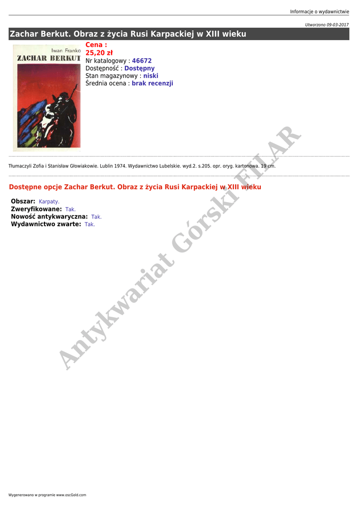 Informacje o wydawnictwie Utworzono 09-03-2017 Zachar Berkut. Obraz z życia Rusi Karpackiej w XIII wieku Cena : 25,20 zł LA R Nr katalogowy : 46672 Dostępność : Dostępny Stan magazynowy : niski Średnia ocena : brak recenzji FI Tłumaczyli Zofia i Stanisław Głowiakowie. Lublin 1974. Wydawnictwo Lubelskie. wyd.2. s.205. opr. oryg. kartonowa. 19 cm. sk i Dostępne opcje Zachar Berkut. Obraz z życia Rusi Karpackiej w XIII wieku An ty k w ar ia t G ór Obszar: Karpaty. Zweryfikowane: Tak. Nowość antykwaryczna: Tak. Wydawnictwo zwarte: Tak. Wygenerowano w programie www.oscGold.com
