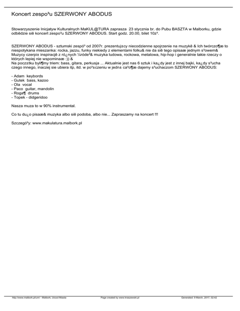 Koncert zespo³u SZERWONY ABODUS Stowarzyszenie Inicjatyw Kulturalnych MaKUL@TURA zaprasza 23 stycznia br. do Pubu BASZTA w Malborku, gdzie odbêdzie siê koncert zespo³u SZERWONY ABODUS. Start godz. 20.00, bilet 10z³. SZERWONY ABODUS - sztumski zespó³ od 2007r. prezentuj±cy niecodzienne spojrzenie na muzykê & Ich twórczo¶æ to niespotykana mieszanka: rocka, jazzu, funky niekiedy z elementami folku& nie da siê tego opisaæ jednym s³owem& Muzycy czerpi± inspiracjê z ró¿nych ¼róde³& muzyka ludowa, rockowa, metalowa, hip-hop i generalnie takie rzeczy o których lepiej nie wspominaæ :)) & Na pocz±tku byli¶my triem: bass, gitara, perkusja ... Aktualnie jest nas 6 sztuk i ka¿dy jest z innej bajki, ka¿dy s³ucha czego innego, inaczej sie ubiera itp, itd. w po³±czeniu w jedn± ca³o¶æ dajemy s³uchaczom SZERWONY ABODUS: - Adam keybords - Gutek bass, kazoo - Ola vocal - Paco guitar, mandolin - Roga¶ drums - Topek - didgeridoo Nasza muza to w 90% instrumental. Co tu du¿o pisaæ& muzyka albo siê podoba, albo nie... Zapraszamy na koncert !!! Szczegó³y: www.makulatura.malbork.pl http://www.malbork.pl/um/ - Malbork, Urz±d Miasta Page created by www.kraszewski.pl Generated: 9 March, 2017, 02:42