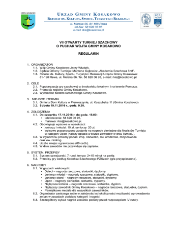 URZĄD GMINY KOSAKOWO REFERAT DS. KULTURY, SPORTU, TURYSTYKI I REKREACJI ul. Morska 56, 81-198 Rewa tel./fax: 58 620 06 95 e-mail: [email protected] VII OTWARTY TURNIEJ SZACHOWY O PUCHAR WÓJTA GMINY KOSAKOWO REGULAMIN 1. ORGANIZATOR 1.1. Wójt Gminy Kosakowo Jerzy Włudzik. 1.2. Sędzia Główny Turnieju: Marzena Gajlewicz „Akademia Szachowa 8×8”. 1.3. Referat ds. Kultury, Sportu, Turystyki i Rekreacji Urzędu Gminy Kosakowo: 81-198 Rewa, ul. Morska 56. Tel. 58 620 06 95, e-mail: [email protected]. 2. CELE 2.1. Popularyzacja gry szachowej w środowisku lokalnym i na terenie Pomorza. 2.2. Promocja regionu Gminy Kosakowo. 2.3. Wyłonienie Mistrza Szachowego Gminy Kosakowo. 3. MIEJSCE I TERMIN 3.1. Gminny Dom Kultury w Pierwoszynie, ul. Kaszubska 11 (Gmina Kosakowo). 3.2. Sobota 19.11.2016 r., godz. 9.30. 4. ZGŁOSZENIA 4.1. Do czwartku 17.11.2016 r. do godz. 16.00: • telefonicznie: 58 620 06 95, • mailowo: [email protected]. 4.2. Obowiązuje wpisowe w wysokości: • juniorzy i młodsi: 10 zł, seniorzy: 20 zł. • wpisowe przeznaczone zostanie na nagrody pieniężne dla finalistów Turnieju w kategorii Open (należy opłacić w biurze zawodów w dniu Turnieju). 4.3. W zgłoszeniu prosimy podać: imię, nazwisko, rok urodzenia, miejscowość oraz ew. ranking. 4.4. Liczba miejsc ograniczona (60 osób). 4.5. W dniu zawodów nie przewiduje się zapisów. 5. SYSTEM, PRZEPISY 5.1. System szwajcarski, 7 rund, tempo: 2×15 minut na partię. 5.2. Przepisy gry według Kodeksu Szachowego PZSzach (gra przyspieszona). 6. NAGRODY 6.1. W grupach wiekowych: • Dzieci – nagrody rzeczowe, statuetki, dyplomy. • Juniorzy młodsi – nagrody rzeczowe, statuetki, dyplomy. • Juniorzy starsi – nagrody rzeczowe, statuetki, dyplomy. • Open – nagrody pieniężne, statuetki, dyplomy. • Najlepsza kobieta – nagroda rzeczowa, statuetka, dyplom. • Najlepszy zawodnik Gminy Kosakowo – nagroda rzeczowa, statuetka, dyplom. • Pamiątkowe medale dla wszystkich zawodników. 6.2. Organizator zastrzega sobie w zależności od okoliczności możliwość wprowadzenia zmian w zasadach podziału kategorii i nagród. 6.3. Szczegółowy wykaz nagród zostanie podany przed rozpoczęciem IV rundy. 7. HARMONOGRAM 7.1. Sobota, 19.11.2016 r.: • godz. 9.30-9.45 – weryfikacja zawodników. • godz. 10.00 – uroczyste otwarcie turnieju. • godz. 10.15-14.00 – rozegranie rund I-VII. • godz. 14.00-14.30 – zakończenie turnieju. 8. DANE OSOBOWE 8.1. Dane osobowe uczestników turnieju będą przetwarzane w celach przeprowadzenia imprezy, promocji i przyznania nagrody. 8.2. Uczestnicy mają prawo wglądu do swoich danych osobowych oraz ich poprawiania. 8.3. Uczestnicy turnieju (w przypadku osób nieletnich – opiekunowie prawni uczestników) biorąc udział w niniejszej imprezie, wyrażają zgodę na wykorzystanie danych osobowych i dokonanie dokumentacji zdjęciowej (filmowej) przez uprawnione przez organizatora osoby oraz upublicznienie ich w środkach masowego przekazu. 9. ORGANIZACYJNE 9.1. Sprzęt szachowy zapewnia organizator, ale dodatkowe zapewnienie sprzętu przez zawodników mile widziane. 9.2. Przewiduje się poczęstunek (kawa, herbata, ciastka, cukierki). 9.3. Organizator zastrzega sobie prawo ostatecznej interpretacji niniejszego regulaminu. Wójt Gminy Kosakowo /-/ Jerzy Włudzik URZĄD GMINY KOSAKOWO REFERAT DS. KULTURY, SPORTU, TURYSTYKI I REKREACJI ul. Morska 56, 81-198 Rewa tel./fax: 58 620 06 95 e-mail: [email protected]