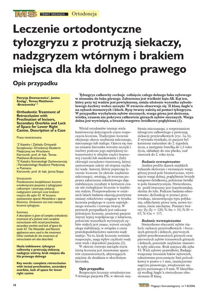 TEMAT MIESIĄCA Ortodoncja Leczenie ortodontyczne ty³ozgryzu z protruzj¹ siekaczy, nadzgryzem wtórnym i brakiem miejsca dla k³a dolnego prawego Opis przypadku Patrycja Downarowicz1, Janina Szel¹g1, Teresa Matthews-Brzozowska1, 2 Orthodontic Treatment of Retrocclusion with Proclination of Incisors, Secondary Overbite and Lack of Space for Lower Right Canine. Description of a Case Praca recenzowana 1 Z Katedry i Zak³adu Ortopedii Szczêkowej i Ortodoncji Akademii Medycznej we Wroc³awiu Kierownik: prof. dr hab. Teresa Matthews-Brzozowska 2 Z Katedry Stomatologii Zachowawczej i Periodontologii Akademii Medycznej w Poznaniu Kierownik: prof. dr hab. Janina Stopa Streszczenie Przedstawiono kompleksowe leczenie ortodontyczne pacjenta z ty³ozgryzem ca³kowitym i protruzj¹ siekaczy, nadzgryzem wtórnym oraz brakiem miejsca dla zêba 43. W leczeniu zastosowano aparat Metzeldera i aparat Klammta. Omówiono te¿ inne metody leczenia ty³ozgryzu. Summary A description is given of complex orthodontic treatment of a patient with complete retrocclusion with incisal proclination, secondary overbite and lack of space for tooth 43. The Metzelder and Klammt appliances were used in the treatment. Other methods for the treatment of retrocclusion are also described. Has³a indeksowe: ty³ozgryz ca³kowity z protruzj¹ siekaczy, nadzgryz wtórny, brak miejsca dla k³a prawego dolnego Key words: complete retrocclusion with incisal proclination, secondary overbite, lack of space for lower right canine 10 Ty³ozgryz ca³kowity cechuje cofniêcie ca³ego dolnego ³uku zêbowego w stosunku do ³uku górnego. Zaburzona jest wielkoœæ k¹ta AB. K¹t ten, który przy tej wadzie jest powiêkszony, ustala u³o¿enie wyrostka zêbodo³owego ¿uchwy wobec szczêki. W zwarciu obserwuje siê II klasê Angle’a na zêbach trzonowych i k³ach. Rysy twarzy zale¿¹ od postaci ty³ozgryzu. W przypadku wychylenia zêbów siecznych, warga górna jest skrócona, wiotka, czasem nie pokrywa ca³kowicie górnych zêbów siecznych. Warga dolna jest wywiniêta, a bruzda wargowo-bródkowa pog³êbiona (1). Wœród ortodontów istnieje wiele kontrowersji dotycz¹cych czasu rozpoczêcia leczenia. Tradycyjnie leczenie obejmuje okresy uzêbienia mlecznego, mieszanego lub sta³ego. Opiera siê ono na zmianie kierunku wzrostu szczêki i ¿uchwy podczas jego najwiêkszej intensywnoœci w obrêbie czêœci twarzowej czaszki lub maskowaniu i (lub) chirurgii szczêkowo-twarzowej, której zastosowanie zale¿y od stopnia ciê¿koœci wady. Autorzy, którzy popieraj¹ leczenie wczesne (w okresie uzêbienia mlecznego), uwa¿aj¹, ¿e wczesna poprawa zaburzenia szkieletowego daje stabilniejsze rezultaty w krótszym czasie ni¿ rozleglejsze leczenie w uzêbieniu sta³ym. Przeprowadzone w ostatnich latach badania ukazuj¹ pozytywne zmiany szkieletowe osi¹gane w wyniku leczenia podjêtego w czasie najwiêkszego wzrostu i rozwoju twarzy. W pewnych przypadkach jest zalecane póŸniejsze leczenie, poniewa¿ pacjent starszy lepiej wspó³pracuje z lekarzem, po³o¿enie wszystkich wyr¿niêtych zêbów sta³ych jest znane, wzrost szczêki ulega stabilizacji, w zwi¹zku z czym prawdopodobieñstwo nawrotu wady maleje. Na to, kiedy leczenie zostanie rozpoczête, maj¹ wp³yw ciê¿koœæ wady oraz wiek i dojrza³oœæ pacjenta (2). W okresie rozwoju narz¹du ¿ucia istot¹ leczenia jest stosowanie aparatów czynnoœciowych, aktywuj¹cych miêœnie do dzia³ania w okreœlonym kierunku. Opis przypadku Rozpoczêto leczenie ortodontyczne 9-letniego pacjenta P.K. w okresie uzê- bienia mieszanego, z rozpoznaniem ty³ozgryzu ca³kowitego z protruzj¹ siekaczy przyœrodkowych (ryc. 1a, b). Z wywiadu wynika³o, ¿e pacjent by³ karmiony naturalnie do 2. tygodnia ¿ycia, a nastêpnie butelk¹ do 1,5 roku ¿ycia, uk³adany do snu p³asko, ssa³ smoczek do 2. roku ¿ycia. Badanie zewn¹trzustne Analiza profilu tkanek miêkkich wykaza³a skrócenie i wysuniêcie wargi górnej przed pole biometryczne, wywiniêcie wargi dolnej, pog³êbienie bruzdy wargowo-bródkowej, po³o¿enie bródki w polu biometrycznym. Stwierdzono, ¿e profil twarzowy jest transfrontalny, skoœny do ty³u. Podczas badania odnotowano: dysfunkcjê w postaci przetrwa³ego, niemowlêcego typu po³ykania, oddychanie przez usta, mowa wyraŸna, ¿ucie niechêtne. Pomiary twarzy: Zy-Zy = 120; N-Sn = 53; N-Pr = 67; N-Gn = 117. Badanie wewn¹trzustne Stwierdzono obecnoœæ zêbów sta³ych: siekaczy przyœrodkowych i bocznych górnych i dolnych, pierwszych zêbów przedtrzonowych górnych oraz pierwszych zêbów trzonowych górnych i dolnych, pozosta³e uzêbienie stanowi³y zêby mleczne. Brak miejsca dla zêba 43. Wiek zêbowy prawid³owy. Badaj¹c wzajemny stosunek ³uków zêbowych, odnotowano przesuniêcie linii poœrodkowej w prawo o 1 mm, zmniejszenie nagryzu pionowego, zwiêkszenie nagryzu poziomego o 8 mm. W klasyfikacji wed³ug Angle’a stwierdzono obustronnie II klasê. Magazyn Stomatologiczny nr 7-8/2006 Analiza modeli £uki zêbowe szczêki i ¿uchwy by³y symetryczne. Odnotowano niewielkie zwê¿enie ³uku górnego – 2,5 mm na zêbach przedtrzonowych i 1,0 mm na trzonowych oraz ³uku dolnego – 1,0 mm na zêbach trzonowych. Potwierdzono brak miejsca dla zêba 43. Na podstawie przeprowadzonych badañ postawiono rozpoznanie: ty³ozgryz ca³kowity z protruzj¹ siekaczy, nadzgryzem wtórnym i brakiem miejsca dla zêba 43. Opracowano przedstawiony ni¿ej plan leczenia. Plan leczenia Plan leczenia przewidywa³: 1. Doprzedni¹ rozbudowê wyrostka zêbodo³owego ¿uchwy. 2. Wysuniêcie dolnego ³uku. 3. Ewentualne leczenie szlifowaniem pionowym wg Dominika. Przebieg leczenia Ca³kowity okres leczenia wyniós³ 6 lat. Leczenie rozpoczêto od zastosowania aparatu Metzeldera. Po 2 miesi¹cach, z powodu znacznego braku miejsca dla wyrzynaj¹cego siê zêba 12, powziêto decyzjê ekstrakcji prawego k³a mlecznego. Aby zachowaæ miejsce po usuniêtym zêbie i nie dopuœciæ do póŸniejszych st³oc