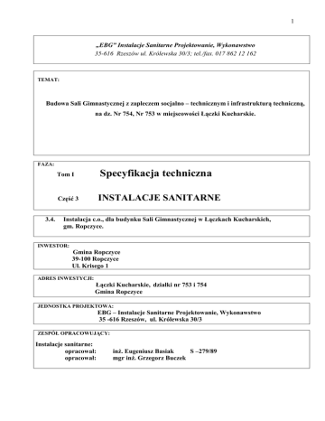 1 „EBG” Instalacje Sanitarne Projektowanie, Wykonawstwo 35-616 Rzeszów ul. Królewska 30/3; tel./fax. 017 862 12 162 TEMAT: Budowa Sali Gimnastycznej z zapleczem socjalno – technicznym i infrastrukturą techniczną, na dz. Nr 754, Nr 753 w miejscowości Łączki Kucharskie. FAZA: 3.4. Tom I Specyfikacja techniczna Część 3 INSTALACJE SANITARNE Instalacja c.o., dla budynku Sali Gimnastycznej w Łączkach Kucharskich, gm. Ropczyce. INWESTOR: Gmina Ropczyce 39-100 Ropczyce Ul. Krisego 1 ADRES INWESTYCJI: Łączki Kucharskie, działki nr 753 i 754 Gmina Ropczyce JEDNOSTKA PROJEKTOWA: EBG – Instalacje Sanitarne Projektowanie, Wykonawstwo 35 -616 Rzeszów, ul. Królewska 30/3 ZESPÓŁ OPRACOWUJĄCY: Instalacje sanitarne: opracował: opracował: inŜ. Eugeniusz Basiak S –279/89 mgr inŜ. Grzegorz Buczek Szczegółowa Specyfikacja Techniczna Instalacja centralnego ogrzewania dla budynku Sali Gimnastycznej w miejscowości Łączki Kucharskie. SPIS TREŚCI 1. WSTĘP 2. MATERIAŁY 3. SPRZĘT 4. TRANSPORT I SKŁADOWANIE 5. WYKONANIE ROBÓT 6. KONTROLA JAKOŚCI ROBÓT 7. ODBIÓR ROBÓT 8. OBMIAR ROBÓT 9. PODSTAWA PŁATNOŚCI 10. PRZEPISY ZWIĄZANE 2 Szczegółowa Specyfikacja Techniczna Instalacja centralnego ogrzewania dla budynku Sali Gimnastycznej w miejscowości Łączki Kucharskie. 3 SZCZEGÓŁOWA SPECYFIKACJA TECHNICZNA 1.- WSTĘP 1.1.- Przedmiot szczegółowej specyfikacji technicznej Przedmiotem niniejszej szczegółowej specyfikacji technicznej (SST) są wymagania dotyczące wykonania i odbioru robót w zakresie instalacji centralnego ogrzewania (CO) dla budynku Sali Gimnastycznej w Łączkach Kucharskich, gm. Ropczyce. 1.2.- Zakres stosowania szczegółowej specyfikacji technicznej Szczegółowa specyfikacja techniczna jest stosowana jako dokument przetargowy i kontraktowy przy zleceniu i realizacji robót wymienionych w punkcie 1.1. Klasyfikacja robót wg Wspólnego Słownika Zamówień (CPV) Kod CPV Opis 45111100-9 45321000-3 45324000-4 45331100-7 45332200-5 45332300-6 45332400-7 Roboty w zakresie burzenia Izolacja cieplna Tynkowanie Instalowanie centralnego ogrzewania Hydraulika Kładzenie upustów Roboty instalacyjne w zakresie sprzętu sanitarnego Określenia podstawowe, uŜyte w niniejszej specyfikacji, są zgodne z obowiązującymi odpowiednimi normami i określeniami zawartymi w ST 0.0 – Wymagania ogólne. 1.3.- Zakres robót objętych specyfikacją techniczną Roboty, których dotyczy specyfikacja, obejmują wszystkie czynności umoŜliwiające i mające na celu wykonanie nowych instalacji CO. Niniejsza specyfikacja techniczna związana jest z wykonaniem niŜej wymienionych robót: ∗ ∗ ∗ ∗ ∗ ∗ 1.4.- montaŜ rurociągów, montaŜ armatury, montaŜ urządzeń grzejnych, badania instalacji, wykonania izolacji termicznych, regulacja działania instalacji. Ogólne wymagania ∗ Wykonawca jest odpowiedzialny za realizację robót zgodnie z dokumentacją projektową, specyfikacją techniczną, poleceniami nadzoru autorskiego i inwestorskiego oraz zgodnie z art. 5, 22, 23 i 28 ustawy Prawo Budowlane oraz wymaganiami zawartymi w Rozporządzeniu Ministra Infrastruktury poz. 690 z dnia 12 kwietnia 2002 roku – w sprawie warunków technicznych, jakim powinny odpowiadać budynki i ich usytuowanie, które znajdują się w Dz.U. Nr 75 z dnia 15 czerwca 2002 roku wraz z późniejszymi zmianami. ∗ ∗ Odstępstwa od projektu mogą dotyczyć jedynie dostosowania instalacji do wprowadzonych zmian konstrukcyjno-budowlanych lub zastąpienia zaprojektowanych materiałów – w przypadku niemoŜliwości ich uzyskania – przez inne materiały lub elementy o zbliŜonych charakterystykach i trwałości. Wszystkie zmiany od zatwierdzonej dokumentacji technicznej na inne, nie mogą powodować zmniejszenie trwałości eksploatacyjnej. Ponadto, moŜliwe jest stosowanie zmian w armaturze w zakresie przechodzenia z zaworów prostych na kątowe i odwrotnie jeŜeli zajdzie taka potrzeba w trakcie realizacji instalacji. Roboty montaŜowe naleŜy realizować zgodnie z: − „Warunkami technicznymi wykonania i odbioru instalacji ogrzewczych” – zeszyt nr 6 – wydanymi przez Centralny Ośrodek Badawczo-Rozwojowy Techniki Instalacyjnej INSTAL Warszawa – maj 2003, Szczegółowa Specyfikacja Techniczna Instalacja centralnego ogrzewania dla budynku Sali Gimnastycznej w miejscowości Łączki Kucharskie. − − 2.- 4 zachowaniem przepisów BHP i przeciwpoŜarowych ze szczególnym zwróceniem uwagi na stosowanie wszelkiego rodzaju zabezpieczeń i ogłoszeń poprzez wywieszanie tablic ostrzegawczych i informacyjnych w przypadku wykonywania robót w roku szkolnym, normami polskimi i branŜowymi oraz innymi przepisami dotyczącymi wykonywanych instalacji. MATERIAŁY − Do wykonania instalacji CO, mogą być stosowane wyroby producentów krajowych i zagranicznych pod warunkiem, Ŝe posiadają aktualne aprobaty techniczne lub dopuszczenia do stosowania ich na krajowym rynku oraz odpowiadać Polskim Normom. − Wykonawca uzyska przed zastosowaniem wyrobu akceptację Inspektora Nadzoru. − Odbiór techniczny materiałów powinien być dokonywany według i w sposób określony aktualnymi normami. − Ponadto: Materiały i wyroby hutnicze z elementami spawanymi powinny posiadać zaświadczenie o gwarantowanej spawalności. Obróbka mechaniczna, plastyczna lub cieplna elementów powinna być przeprowadzona zgodnie z wymogami PN i BN dla danego materiału. Zwraca się uwagę na to, aby metody stosowane przy tych czynnościach nie spowodowały uszkodzeń powierzchni roboczych, ani nie obniŜyły właściwości fizycznych i wytrzymałościowych materiałów. Rury powinny być proste, czyste od zewnątrz i wewnątrz, bez wŜerów i widocznych ubytków. Wykonawca zobowiązany jest do zbierania dokumentacji dostaw w postaci atestów, świadectw jakości, specyfikacji, paszportów, instrukcji obsługi i DTR, kart gwarancyjnych, rysunków montaŜowych itp. Wykonawca ponosi odpowiedzialność za spełn