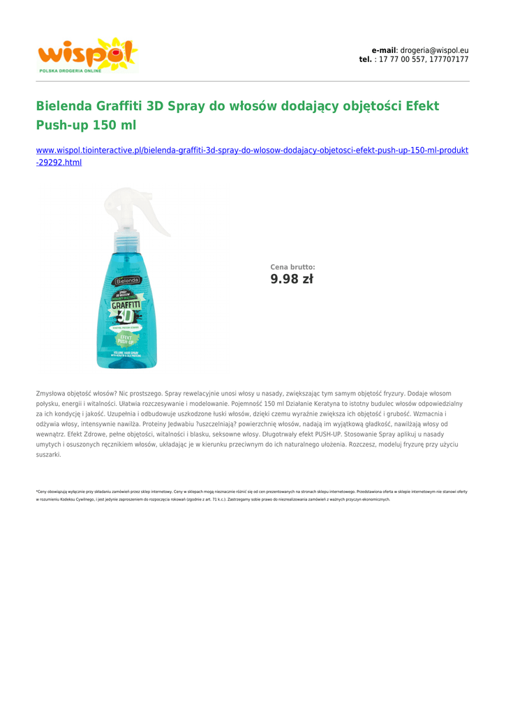 e-mail: [email protected] tel. : 17 77 00 557, 177707177 Bielenda Graffiti 3D Spray do włosów dodający objętości Efekt Push-up 150 ml www.wispol.tiointeractive.pl/bielenda-graffiti-3d-spray-do-wlosow-dodajacy-objetosci-efekt-push-up-150-ml-produkt -29292.html Cena brutto: 9.98 zł Zmysłowa objętość włosów? Nic prostszego. Spray rewelacyjnie unosi włosy u nasady, zwiększając tym samym objętość fryzury. Dodaje włosom połysku, energii i witalności. Ułatwia rozczesywanie i modelowanie. Pojemność 150 ml Działanie Keratyna to istotny budulec włosów odpowiedzialny za ich kondycję i jakość. Uzupełnia i odbudowuje uszkodzone łuski włosów, dzięki czemu wyraźnie zwiększa ich objętość i grubość. Wzmacnia i odżywia włosy, intensywnie nawilża. Proteiny Jedwabiu ?uszczelniają? powierzchnię włosów, nadają im wyjątkową gładkość, nawilżają włosy od wewnątrz. Efekt Zdrowe, pełne objętości, witalności i blasku, seksowne włosy. Długotrwały efekt PUSH-UP. Stosowanie Spray aplikuj u nasady umytych i osuszonych ręcznikiem włosów, układając je w kierunku przeciwnym do ich naturalnego ułożenia. Rozczesz, modeluj fryzurę przy użyciu suszarki. *Ceny obowiązują wyłącznie przy składaniu zamówień przez sklep internetowy. Ceny w sklepach mogą nieznacznie różnić się od cen prezentowanych na stronach sklepu internetowego. Przedstawiona oferta w sklepie internetowym nie stanowi oferty w rozumieniu Kodeksu Cywilnego, i jest jedynie zaproszeniem do rozpoczęcia rokowań (zgodnie z art. 71 k.c.). Zastrzegamy sobie prawo do niezrealizowania zamówień z ważnych przyczyn ekonomicznych.