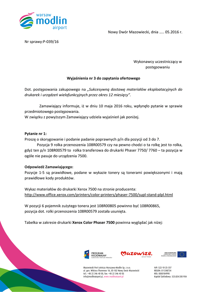 Nowy Dwór Mazowiecki, dnia ….. 05.2016 r. Nr sprawy:P-039/16 Wykonawcy uczestniczący w postępowaniu Wyjaśnienia nr 3 do zapytania ofertowego Dot. postępowania zakupowego na „Sukcesywną dostawę materiałów eksploatacyjnych do drukarek i urządzeń wielofunkcyjnych przez okres 12 miesięcy”. Zamawiający informuje, iż w dniu 10 maja 2016 roku, wpłynęło pytanie w sprawie przedmiotowego postępowania. W związku z powyższym Zamawiający udziela wyjaśnień jak poniżej. Pytanie nr 1: Proszę o skorygowanie i podanie padanie poprawnych p/n dla pozycji od 3 do 7. Pozycja 9 rolka przenoszenia 108R00579 czy na pewno chodzi o ta rolkę jest to rolka, gdyż ten p/n 108R00579 to rolka transferowa do drukarki Phaser 7750/ 7760 – ta pozycja w ogóle nie pasuje do urządzenia 7500. Odpowiedź Zamawiającego: Pozycje 1-5 są prawidłowe, podane w wykazie tonery są tonerami powiększonymi i mają prawidłowe kody produktów. Wykaz materiałów do drukarki Xerox 7500 na stronie producenta: http://www.office.xerox.com/printers/color-printers/phaser-7500/supl-stand-plpl.html W pozycji 6 pojemnik zużytego tonera jest 108R00805 powinno być 108R00865, pozycja dot. rolki przenoszenia 108R00579 została usunięta. Tabelka w zakresie drukarki Xerox Color Phaser 7500 powinna wyglądać jak niżej: Opis Lp. 1 2 3 4 5 6 7 Xerox Color Phaser 7500 toner toner toner toner bęben pojemnik zużytego tonera Moduł utrwalania (FUSER) 220V Kod materiału 106R01443 106R01444 106R01445 106R01446 108R00861 Kolor materiału cyan magenta yellow black Cena Wyd. op. Wartość jednostkowa Planowanie (ilość stron) netto (PLN) netto (PLN) 17800 17800 17800 19800 80000 4 4 4 4 6 108R00865 20000 4 115R00062 100000 1 W związku z powyższą odpowiedzią należy uwzględnić zmiany przy złożeniu oferty. Niniejsze wyjaśnienia stanowią integralną część zapytania ofertowego.