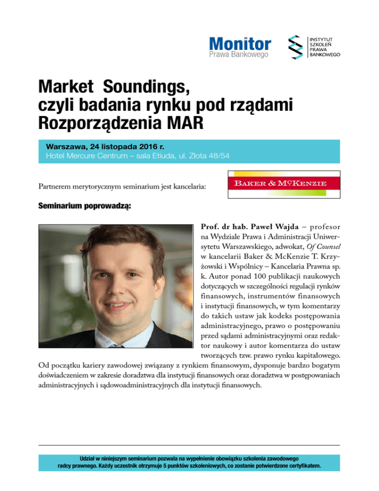 Market Soundings, czyli badania rynku pod rządami Rozporządzenia MAR Warszawa, 24 listopada 2016 r. Hotel Mercure Centrum – sala Etiuda, ul. Złota 48/54 Partnerem merytorycznym seminarium jest kancelaria: Seminarium poprowadzą: Prof. dr hab. Paweł Wajda – profesor na Wydziale Prawa i Administracji Uniwersytetu Warszawskiego, adwokat, Of Counsel w kancelarii Baker & McKenzie T. Krzyżowski i Wspólnicy – Kancelaria Prawna sp. k. Autor ponad 100 publikacji naukowych dotyczących w szczególności regulacji rynków finansowych, instrumentów finansowych i instytucji finansowych, w tym komentarzy do takich ustaw jak kodeks postępowania administracyjnego, prawo o postępowaniu przed sądami administracyjnymi oraz redaktor naukowy i autor komentarza do ustaw tworzących tzw. prawo rynku kapitałowego. Od początku kariery zawodowej związany z rynkiem finansowym, dysponuje bardzo bogatym doświadczeniem w zakresie doradztwa dla instytucji finansowych oraz doradztwa w postępowaniach administracyjnych i sądowoadministracyjnych dla instytucji finansowych. Udział w niniejszym seminarium pozwala na wypełnienie obowiązku szkolenia zawodowego radcy prawnego. Każdy uczestnik otrzymuje 5 punktów szkoleniowych, co zostanie potwierdzone certyfikatem. Maciej Ługowski – radca prawny zatrudniony w departamencie rynków kapitałowym w kancelarii Baker & McKenzie T. Krzyżowski i Wspólnicy – Kancelaria Prawna sp. k. Przed dołączeniem do kancelarii pracował jako general counsel w jednej z wiodących firm inwestycyjnych. Zajmuje się bieżącym doradztwem dla firm inwestycyjnych. Brał udział w wielu istotnych transakcjach dotyczących akcji spółek notowanych na Giełdzie Papierów Wartościowych w Warszawie. Cele seminarium: Celem seminarium jest przekazanie Uczestnikom praktycznej wiedzy odnośnie do stosowania reżimu Market Soundings (badań rynku) pod rządami Rozporządzenia UE 596/2014 (Rozporządzenia MAR). W trakcie seminarium zasadniczy nacisk zostanie położony na kwestie praktyczne, tj. na kwestie praktycznego wykorzystania reżimu Market Soundings przez takie podmioty, jak emitent, dom maklerski czy bank korzystający z tzw. jednolitej licencji bankowej. Przedmiotem seminarium będzie także zaprezentowanie odpowiednich procedur i zmian w organizacji wewnętrznej, które pozwolą na dopasowanie działalności danego podmiotu do postanowień Rozporządzenia MAR. Grupa docelowa: prezesi i członkowie zarządów banków prezesi i członkowie zarządów domów maklerskich pracownicy departamentów prawnych banków pracownicy departamentów compliance banków i domów maklerskich osoby zainteresowane regulacjami rynków finansowych pracownicy kancelarii prawnych zajmujących się tzw. regulatory Telefon informacyjny +48 602 255 780, faks 22 786 60 87, e-mail: [email protected], www.ispb.pl PROGRAM 10.00-10.15 Rejestracja uczestników 10.15-11.45 Market Soundings – istota, charakterystyka Rozporządzenie MAR w systemie prawa Niedostosowanie regulacji krajowej do porządku wprowadzonego na mocy postanowień Rozporządzenia MAR Market Soundings – efekt praktyki rynkowej Market Soundings – przeniesienie praktyki na grunt regulacji 11.45-12.15 Przerwa na kawę 12.15-13.45 Market Soundings – definicja Szczegółowa charakterystyka Market Sounding – krok po kroku 13.45-14.45 Lunch 14.45-16.15 Market Soundings – procedury Market Soundings – wdrożenie Market Soundings – regulaminy Uwagi praktyczne 16.15-16.45 Pytania i dyskusja Telefon informacyjny +48 602 255 780, faks 22 786 60 87, e-mail: [email protected], www.ispb.pl WARUNKI UCZESTNICTWA W SEMINARIUM Prosimy o przesyłanie zgłoszeń udziału w seminarium oraz danych potrzebnych do wystawienia faktury faksem lub mailem na adres [email protected]. Organizatorem seminarium jest: Instytut Szkoleń Prawa Bankowego s.c. ul. Ks. E. Lubomirskiego 5 05-250 Radzymin tel/faks 22 786 60 87 Termin nadsyłania zgłoszeń do 14 listopada 2016 r. Warunkiem uczestnictwa w spotkaniu jest wniesienie opłaty na konto Instytutu Szkoleń Prawa Bankowego po otrzymaniu faktury VAT. Koszt uczestnictwa w Seminarium wynosi 900,00 zł (plus 23% VAT) Cena obejmuje uczestnictwo w wykładach, pakiet materiałów seminaryjnych, lunch, przerwy kawowe oraz certyfikat. Po otrzymaniu zgłoszenia udziału, organizatorzy wystawią i wyślą na wskazany adres fakturę VAT wraz z potwierdzeniem przyjęcia zgłoszenia. Organizatorzy zachęcają do przesyłania zagadnień wartych omówienia na seminarium i pytań do prelegentów na adres [email protected] Więcej informacji na stronie www.ispb.pl Telefon informacyjny +48 602 255 780, faks 22 786 60 87, e-mail: [email protected], www.ispb.pl ZGŁOSZENIE UDZIAŁU W SEMINARIUM PRAWA BANKOWEGO Warszawa, 24 listopada 2016 r. Hotel Mercure Centrum – sala Etiuda, ul. Złota 48/54 Zgłaszamy udział w Seminarium w zaproponowanym miejcu i terminie. Kwotę 900,00 zł (plus 23% VAT) tytułem opłaty za udział w konferencji przekażemy na konto Instytutu Szkoleń Prawa Bankowego po otrzymaniu faktury VAT. Dane uczestnika konferencji Dane do faktury VAT Imię i nazwisko Nazwa firmy Stanowisko Adres e-mail Ulica, nr domu/lokalu Nr telefonu - wraz z kierunkowym Nr kodu - miejscowość Nr faksu NIP Upoważniam Instytut Szkoleń Prawa Bankowego do wystawienia faktury VAT bez naszgo podpisu. W trybie art. 10 ust. 2 ustawy z dnia 18 lipca 2002 r. o świadczeniu usług droga elektroniczną (DzU nr 144 poz. 1204), wyrażam zgodę na otrzymywanie od Instytutu Szkoleń Prawa Bankowego, drogą elektroniczną na wskazany poniżej adres elektroniczny, informacji dotyczących tego szkolenia, jak i informacji o innych produktach szkoleniowych. Wyrażam również zgodę na przetwarzanie moich danych osobowych dla potrzeb niezbędnych do otrzymywania informacji z firmy Instytut Szkoleń Prawa Bankowego s.c., ul. Lubomirskiego 5, 05-250 Radzymin (zgodnie z ustawa z dnia 29 sierpnia 1997 r. o ochronie danych osobowych, DzU nr 1