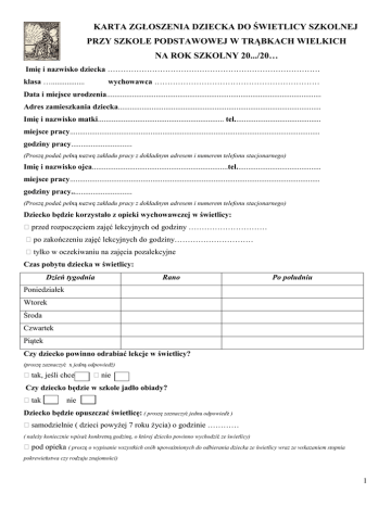 KARTA ZGŁOSZENIA DZIECKA DO ŚWIETLICY SZKOLNEJ PRZY SZKOLE PODSTAWOWEJ W TRĄBKACH WIELKICH NA ROK SZKOLNY 20.../20… Imię i nazwisko dziecka ……………………………………………………………………… klasa …................. wychowawca ……………………………………………………… Data i miejsce urodzenia............................................................................................................. Adres zamieszkania dziecka....................................................................................................... Imię i nazwisko matki................................................................ tel............................................ miejsce pracy............................................................................................................................... godziny pracy............................... (Proszę podać pełną nazwę zakładu pracy z dokładnym adresem i numerem telefonu stacjonarnego) Imię i nazwisko ojca.....................................................................tel........................................... miejsce pracy............................................................................................................................... godziny pracy............................... (Proszę podać pełną nazwę zakładu pracy z dokładnym adresem i numerem telefonu stacjonarnego) Dziecko będzie korzystało z opieki wychowawczej w świetlicy: przed rozpoczęciem zajęć lekcyjnych od godziny ………………………… po zakończeniu zajęć lekcyjnych do godziny………………………… tylko w oczekiwaniu na zajęcia pozalekcyjne Czas pobytu dziecka w świetlicy: Dzień tygodnia Rano Po południu Poniedziałek Wtorek Środa Czwartek Piątek Czy dziecko powinno odrabiać lekcje w świetlicy? (proszę zaznaczyć x jedną odpowiedź) tak, jeśli chce nie Czy dziecko będzie w szkole jadło obiady? tak nie Dziecko będzie opuszczać świetlicę: ( proszę zaznaczyć jedna odpowiedź ) samodzielnie ( dzieci powyżej 7 roku życia) o godzinie ………… ( należy koniecznie wpisać konkretną godzinę, o której dziecko powinno wychodzić ze świetlicy) pod opieka ( proszę o wypisanie wszystkich osób upoważnionych do odbierania dziecka ze świetlicy wraz ze wskazaniem stopnia pokrewieństwa czy rodzaju znajomości) 1 Imię i nazwisko osoby upoważnionej Rodzaj pokrewieństwa lub znajomości 1. 2. 3. 4. 5. Dodatkowe informacje o dziecku ( stan zdrowia, alergie, zainteresowania, itp.) .............................................................................................................................................................................. .............................................................................................................................................................................. .............................................................................................................................................................................. .............................................................................................................................................................................. .............................................................................................................................................................................. Oświadczam, że przedłożone przeze mnie w niniejszej karcie informacje są zgodne ze stanem faktycznym. …........................ …............................................................ data podpis rodzica/opiekuna prawnego PRZYJMUJĘ DO WIADOMOŚCI, ŻE: 1. O zwolnieniach dziecka z zajęć świetlicowych wychowawcy świetlicy będą powiadamiani pisemnie wyłącznie przez rodziców/prawnych opiekunów. 2. Odpowiedzialność nauczyciela — wychowawcy świetlicy za dziecko rozpoczyna się z chwilą przybycia ucznia do świetlicy. 3. Dzieci są odbierane ze świetlicy szkolnej osobiście przez rodziców/prawnych opiekunów lub przez osoby upoważnione i zgłoszone pisemnie wychowawcom świetlic, innym osobom dziecko nie zostanie wydane. 4. Samodzielnie wyjść ze świetlicy może wyłącznie dziecko posiadające pisemną zgodę rodziców/prawnych opiekunów na samodzielny powrót do domu. Zgoda rodzica/prawnego opiekuna wyrażona telefonicznie nie będzie brana pod uwagę przez nauczyciela- wychowawcę świetlicy. 5. Dzieci będą wypuszczane ze świetlicy na zajęcia dodatkowe pozalekcyjne na podstawie pisemnej informacji od rodziców. 6. Rodzice dziecka (opiekunowie prawni) zobowiązani są do przestrzegania godzin otwarcia świetlicy szkolnej 6:30 – 17:00 …………………………. data ……………………………………………….. czytelny podpis rodziców/opiekunów prawnych 2