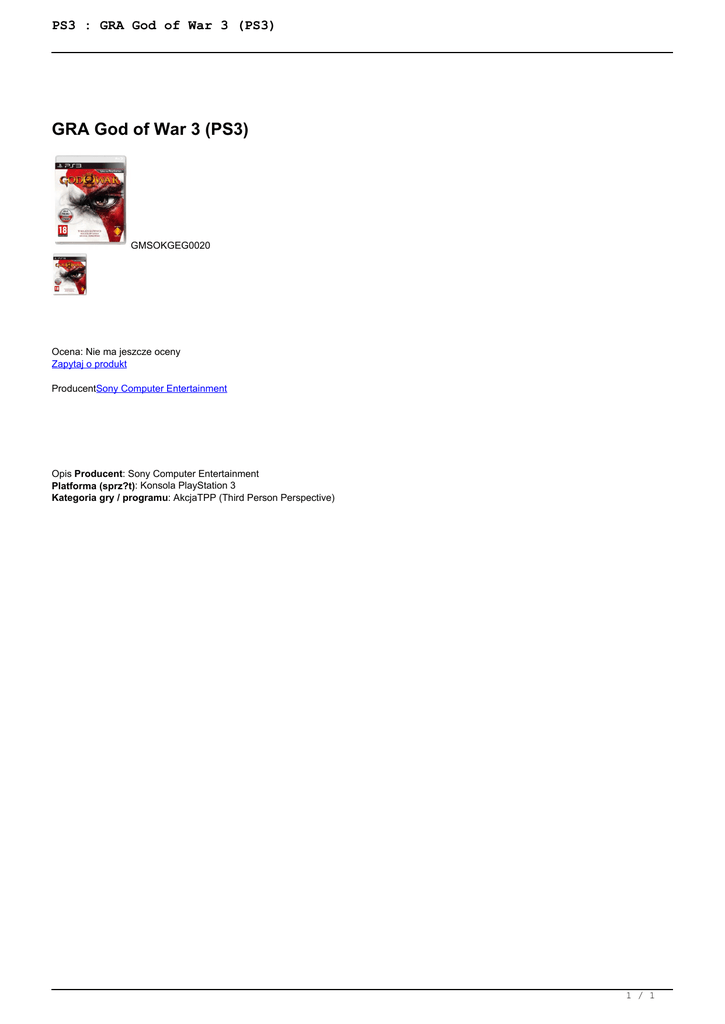 PS3 : GRA God of War 3 (PS3) GRA God of War 3 (PS3) GMSOKGEG0020 Ocena: Nie ma jeszcze oceny Zapytaj o produkt ProducentSony Computer Entertainment Opis Producent: Sony Computer Entertainment Platforma (sprz?t): Konsola PlayStation 3 Kategoria gry / programu: AkcjaTPP (Third Person Perspective) 1 / 1 Powered by TCPDF (www.tcpdf.org)