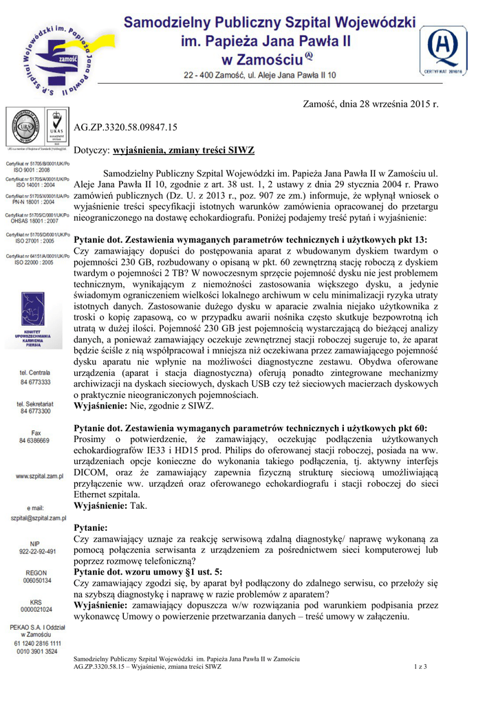 Zamość, dnia 28 września 2015 r. AG.ZP.3320.58.09847.15 Dotyczy: wyjaśnienia, zmiany treści SIWZ Samodzielny Publiczny Szpital Wojewódzki im. Papieża Jana Pawła II w Zamościu ul. Aleje Jana Pawła II 10, zgodnie z art. 38 ust. 1, 2 ustawy z dnia 29 stycznia 2004 r. Prawo zamówień publicznych (Dz. U. z 2013 r., poz. 907 ze zm.) informuje, że wpłynął wniosek o wyjaśnienie treści specyfikacji istotnych warunków zamówienia opracowanej do przetargu nieograniczonego na dostawę echokardiografu. Poniżej podajemy treść pytań i wyjaśnienie: Pytanie dot. Zestawienia wymaganych parametrów technicznych i użytkowych pkt 13: Czy zamawiający dopuści do postępowania aparat z wbudowanym dyskiem twardym o pojemności 230 GB, rozbudowany o opisaną w pkt. 60 zewnętrzną stację roboczą z dyskiem twardym o pojemności 2 TB? W nowoczesnym sprzęcie pojemność dysku nie jest problemem technicznym, wynikającym z niemożności zastosowania większego dysku, a jedynie świadomym ograniczeniem wielkości lokalnego archiwum w celu minimalizacji ryzyka utraty istotnych danych. Zastosowanie dużego dysku w aparacie zwalnia niejako użytkownika z troski o kopię zapasową, co w przypadku awarii nośnika często skutkuje bezpowrotną ich utratą w dużej ilości. Pojemność 230 GB jest pojemnością wystarczającą do bieżącej analizy danych, a ponieważ zamawiający oczekuje zewnętrznej stacji roboczej sugeruje to, że aparat będzie ściśle z nią współpracował i mniejsza niż oczekiwana przez zamawiającego pojemność dysku aparatu nie wpłynie na możliwości diagnostyczne zestawu. Obydwa oferowane urządzenia (aparat i stacja diagnostyczna) oferują ponadto zintegrowane mechanizmy archiwizacji na dyskach sieciowych, dyskach USB czy też sieciowych macierzach dyskowych o praktycznie nieograniczonych pojemnościach. Wyjaśnienie: Nie, zgodnie z SIWZ. Pytanie dot. Zestawienia wymaganych parametrów technicznych i użytkowych pkt 60: Prosimy o potwierdzenie, że zamawiający, oczekując podłączenia użytkowanych echokardiografów IE33 i HD15 prod. Philips do oferowanej stacji roboczej, posiada na ww. urządzeniach opcje konieczne do wykonania takiego podłączenia, tj. aktywny interfejs DICOM, oraz że zamawiający zapewnia fizyczną strukturę sieciową umożliwiającą przyłączenie ww. urządzeń oraz oferowanego echokardiografu i stacji roboczej do sieci Ethernet szpitala. Wyjaśnienie: Tak. Pytanie: Czy zamawiający uznaje za reakcję serwisową zdalną diagnostykę/ naprawę wykonaną za pomocą połączenia serwisanta z urządzeniem za pośrednictwem sieci komputerowej lub poprzez rozmowę telefoniczną? Pytanie dot. wzoru umowy §1 ust. 5: Czy zamawiający zgodzi się, by aparat był podłączony do zdalnego serwisu, co przełoży się na szybszą diagnostykę i naprawę w razie problemów z aparatem? Wyjaśnienie: zamawiający dopuszcza w/w rozwiązania pod warunkiem podpisania przez wykonawcę Umowy o powierzenie przetwarzania danych – treść umowy w załączeniu. Samodzielny Publiczny Szpital Wojewódzki im. Papieża Jana Pawła II w Zamościu AG.ZP.3320.58.15 – Wyjaśnienie, zmiana treści SIWZ 1z3 Pytanie dot. załącznika nr 4 do SIWZ pkt 3 tiret 4: Czy zamawiający wyrazi zgodę na następującą modyfikację tego zapisu: „liczba napraw gwarancyjnych uprawniająca do wymiany na nowy element/ podzespół ............................. (maks. ilość napraw dopuszczonych przez Zamawiającego – 3)”? Urządzenie będące przedmiotem umowy jest zbudowane z niezależnie działających części/ modułów. Nieuzasadniona jest sytuacja, w której zamawiający wymagałby wymiany całego sprzętu, a niesprawna jest tylko część urządzenia, którego całość poza tym działa bez zarzutu. Wymiana wadliwego modułu w takich przypadkach chroni słuszny interes zamawiającego, a wykonawcy umożliwi rzetelną kalkulację ceny i przedstawienie najkorzystniejszej oferty. W związku z tym prosimy o modyfikację punktu poprzez usunięcie możliwości wymiany całego sprzętu, wprowadzając w to miejsce możliwość wymiany części/ modułów. Wyjaśnienie: Nie, zgodnie z SIWZ. Poprzez sformułowanie zapisu „liczba napraw gwarancyjnych uprawniająca do wymiany na nowy element/ podzespół/ urządzenie .............................(maks. ilość napraw dopuszczonych przez Zamawiającego – 3)” nie została narzucona konieczność wymiany całego urządzenia po 3-krotnych drobnych naprawach. Zamawiający informuje ponadto, na podstawie wieloletnich doświadczeń, iż z pozoru drobne, ale powtarzające się usterki typu wymiana bezpieczników czy zawieszanie się systemu operacyjnego, często okazywały się objawem znacznie poważniejszych uszkodzeń aparatu medycznego. Pytanie: Czy zamawiający udostępni wykonawcy wersje edytowalne (preferowane formaty doc/ docx/ rtf) załączników 1, 2 do SIWZ? Wyjaśnienie: Nie. Pytanie dot. załącznika nr 3 do SIWZ: W wskazanym załączniku zamawiający zawarł wymóg przedstawienia listy podmiotów należących do tej samej grupy kapitałowej, której obowiązek złożenia wraz z ofertą nakłada na wykonawcę art. 26 ust. 2d ustawy Prawo zamówień publicznych, z uwzględnieniem – oprócz nazwy firmy – siedziby. Czy zamawiający zrezygnuje z wymogu przedstawienia dodatkowych informacji poza nazwą podmiotu? Z uwagi na znaczną objętość stron listy podmiotów należących do tej samej grupy kapitałowej, oraz fakt, że większość podmiotów wchodzących w jej skład jest podmiotem zagranicznym wykonawca nie jest w stanie przedłożyć listy, która oprócz nazwy firmy miałaby zawierać również informację o siedzibie. Wyjaśnienie: Zamawiający dopuszcza przedstawienie listy podmiotów należących do tej samej grupy kapitałowej jedynie z nazwą firmy. Pytanie dot. wzoru umowy §1 ust. 5: Czy zamawiający zgodzi się na usunięcie zapisów tego ustępu ze wzoru umowy? Wykonawca nie może ponosić ryzyka zwi