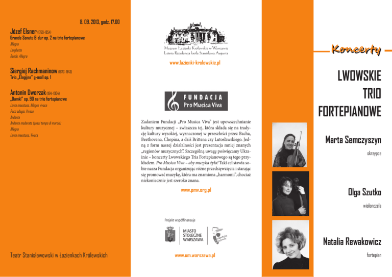 8. 09. 2013, godz. 17.00 Józef Elsner (1769-1854) Grande Sonate B-dur op. 2 na trio fortepianowe Koncerty Allegro Larghetto Rondo. Allegro www.lazienki-krolewskie.pl Siergiej Rachmaninow (1873-1943) Trio „Elegijne” g-moll op. 1 Antonin Dworzak (1841-1904) „Dumki” op. 90 na trio fortepianowe Lento maestoso, Allegro vivace Poco adagio, Vivace Andante Andante moderato (quasi tempo di marcia) Allegro Lento maestoso, Vivace Zadaniem Fundacji „Pro Musica Viva” jest upowszechnianie kultury muzycznej – zwłaszcza tej, która składa się na tradycję kultury wysokiej, wyznaczonej w przeszłości przez Bacha, Beethovena, Chopina, a dziś Brittena czy Lutosławskiego. Jedną z form naszej działalności jest prezentacja mniej znanych „regionów muzycznych”. Szczególną uwagę poświęcamy Ukrainie – koncerty Lwowskiego Tria Fortepianowego są tego przykładem. Pro Musica Viva – aby muzyka żyła! Taki cel stawia sobie nasza Fundacja organizując różne przedsięwzięcia i starając się promować muzykę, która ma znamiona „harmonii”, chociaż niekoniecznie jest szeroko znana. www.pmv.org.pl Lwowskie Trio Fortepianowe Marta Semczyszyn skrzypce Olga Szutko wiolonczela Natalia Rewakowicz Teatr Stanisławowski w Łazienkach Królewskich www.um.warszawa.pl fortepian 2.06.2013, godz. 17.00 Myrosław Skoryk (ur. 1938) Trio fortepianowe „Recitative e Rondo” (1968) Recitativo I: Rubato con improvvisazione Rondo: Allegro molto Recitativo II: Andante rubato Ludwig van Beethoven (1770-1827) Trio Fortepianowe c-moll op. 1 nr 3 Allegro con brio Andante cantabile con Variazioni Quasi Allegro Prestissimo Natalia Rewakowicz fortepian Michaił Glinka (1804-1857) Trio Fortepianowe „Patetyczne” d-moll Allegro moderato Vivacissimo Largo Allegro con spirito 25.08.2013, godz. 17.00 ’ (1888-1963) Wasyl Barwinski Trio fortepianowe a-moll (1910) Andante sentimentale . Allegro energico Andante Allegro giocoso (alla Kolomyika) Franz Schubert (1797-1828) LWOWSKIE TRIO FORTEPIANOWE działa od 1999 roku. Inicjatorem jego powstania i organizatorem jego działalności jest Natalia Rewakowicz, pochodząca ze Lwowa pianistka od początku lat 90-tych mieszkająca w Warszawie. Trio Fortepianowe ma na swoim koncie szereg koncertów w Polsce i Ukrainie. Oprócz światowej klasyki z upodobaniem prezentuje muzykę ukraińską, w tym zwłaszcza twórczość lwowskiego kompozytora Wasyla Barwińskiego. Na repertuar zespołu składają się także utwory Ludwiga van Beethovena, Franza Schuberta, Feliksa Mendelssohna, Antonina Dworzaka, Dmitrija Szostakowicza czy ukraińskiego kompozytora Myrosława Skoryka. Notturno Es-dur op. 148 na trio fortepianowe ukończyła z wyróżnieniem Lwowskie Konserwatorium Muzyczne w klasie fortepianu Olgi Kaczewej i organów Samuela Dajcza. Swoje pianistyczne umiejętności doskonaliła pod kierunkiem Vladimira Viardo. Już podczas studiów zajmowała się kameralistyką, występując z wybitną skrzypaczką Lidią Szutko, uczennicą Dawida Ojstracha, laureatem międzynarodowych konkursów muzycznych im. Czajkowskiego, Bacha i Sibeliusa. W 1990 roku przyjechała do Polski na stałe. Występuje jako solistka i kameralistka. Ma za sobą występy z orkiestrami symfonicznymi na Ukrainie i w Polsce. W latach 90-tych współpracowała z Triem Fortepianowym „Con Fuoco”, z którym zrealizowała m.in. poetycko-muzyczny program „Paryski Salon Fryderyka” z udziałem Krzysztofa Kolbergera, utrwalony na płycie CD. Koncertowała m.in. z Olgą Pasiecznik, Martą Boberską, Adamem Klockiem i Jakubem Jakowiczem. Zajmuje się także pedagogiką prowadząc klasę fortepianu w Zespole Państwowych Szkół Muzycznych Nr 1 w Warszawie. W 2013 roku uzyskała tytuł doktora sztuki w Akademii Muzycznej im. K. Lipińskiego we Wrocławie na podstawie pracy o muzyce ukraińskiej. Fryderyk Chopin (1810-1849) Trio Fortepianowe g-moll op. 8 Marta Semczyszyn skrzypce Allegro con fuoco Con moto, ma non troppo Adagio sostenuto Allegretto urodziła się we Lwowie, tu też Ukończyła Lwowski Instytut Muzyczny im. Mykoły Łysenki w klasie skrzypiec Lidii Szutko, przemianowany na Muzyczną Akademię. W latach 1998-2001 odbywała staż w swojej uczelni w dziedzinie kameralistyki w kla- sie Oresty Kohut. Od 1998 do 2010 roku była koncertmistrzem w ukraińsko-szwajcarskiej orkiestrze INSO – LEMBERG, której dyrygentem był Gunhard Mattes. Aktualnie jest solistką orkiestry symfonicznej Lwowskiej Teatru Operowego. Od czasu studiów Marta Semczyszyn zajmuje się kameralistyką. Jest współzałożycielką i skrzypkiem-prymariuszem Kwartetu Smyczkowego „Klasik-Modern”, z którym brała udział w kursach mistrzowskich u Burkharda Webera w Bayreuth (Niemcy), a także Milana Skampy, Hugo Magiera i Martina Loveta w Londynie i Aldeburgu (Wielka Brytania). Kwartet „Klasik-Modern” zdobył nagrody na krajowych i międzynarodowych konkursach muzycznych. Otrzymał I Nagrodę na Konkursie im. S. Prokofiewa w Mariupolu (Ukraina), brał udział w Konkursie Kwartetów im. Yehudi Menuhina w Londynie, Konkursie Zespołów Kameralnych w Pradze, Bordeaux we Francji i Trapani we Włoszech. Występował w wielu krajach Europy – w Niemczech, Francji, Szwajcarii, Wielkiej Brytanii, Włoszech, Czechach i także kilkakrotnie w Polsce. Kwartet nagrał kilka płyt z muzyką Brahmsa, Mozarta, Czajkowskiego, Szostakowicza. Marta Semczyszyn występuje także jako członkini Lwowskiego Tria Fortepianowego. Olga Szutko wiolonczela urodziła się na południu Ukrainy. Uczęszczała do Szkoły Muzycznej im. Majborody w Zaporożu, studiowała w Narodowej Akademii Muzycznej Ukrainy w Kijowie, a także w Konserwatorium Muzycznym w Paryżu. Jest laureatem konkursów muzycznych w Chersonie (Ukraina), Kijowie, Caltanissetta (Włochy) i Wiedniu. W 1999 r. została koncertmistrzem grupy wiolonczel w Państwowym Zespole „Kijowscy Soliści”. Aktualnie mieszka we Lwowie. Występuje jako solistka i kameralistka, także w duecie 